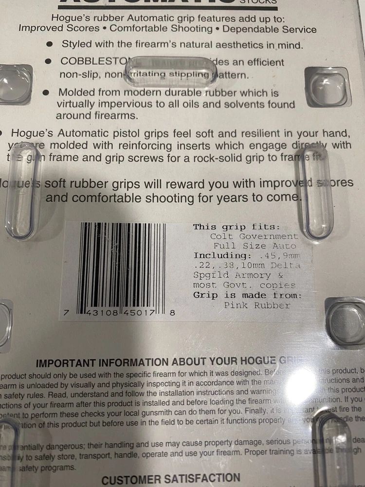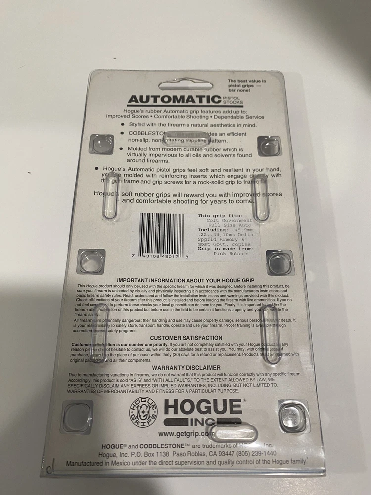 Model: 45017 Color: Pink For Gun Make: Colt Specific Part: GRIPS MPN: 45017 Material: Rubber For Gun Type: Handgun UPC: 743108450178 gtin13: 743108450178 For Gun Model: 1911 Type: Grip Parts Brand: Hogue