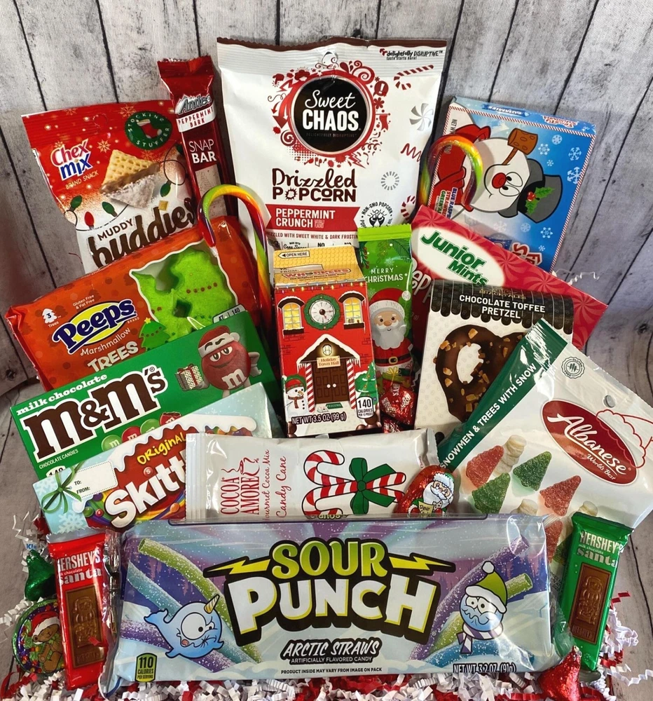 This Holiday Snacking gift box is a festive and heartwarming gift for family and friends during the holiday season. WE START SHIPPING HOLIDAY BASKETS DEC 1 - Unless you message us with a different date. This gift basket is hand-packed with a variety of candies and delightful treats to spread holiday cheer. Everything from Gourmet peppermint popcorn ~ Hot cocoa ~ A chocolate Bavarian pretzel to Sour candy and Peeps plus so much more! *Gift comes in a White craft gift box with a red/green bow and crinkle shreds, then placed in a shipping box. Anything breakable will be bubble wrapped to ensure it arrives intact. Items will be beautifully layered in box. Please message me with any questions- please allow extra transit time from USPS. If you need this shipped at a later date please message me. This set includes: 1~ Gourmet Peppermint Popcorn Bag~ Delicious! 1~Peppermint Candy Junior Mints Box ~ Full size box! 1~ Frosty the Snowman Gummies~ Full size box. 1~ Andes Snap Bar. 1~ Peeps Tree Package. 1~ Large Sour Punch Arctic Straws. 1~ Albanese Holiday Gummy Candy Package. 1~ Holiday Skittles Box. 1~ M&M Holiday Box. 1~ Whoppers Holiday House Box ~ How Fun! 1~ Gourmet Chocolate Bavarian Pretzel. 1~ Muddy Buddies Holiday Bag. 1~ Candy Cane Hot Cocoa Package. * If you choose to upgrade you will have 5 total cocoa's 2~ Hershey's Chocolate Santa's.- Snack Size 2~ Skittles Cany Canes. 1~ Mini Santa Marshmallow. Assorted chocolates sprinkled in for that extra touch! Thanks for looking! Checkout our store for more fun gifting ideas!