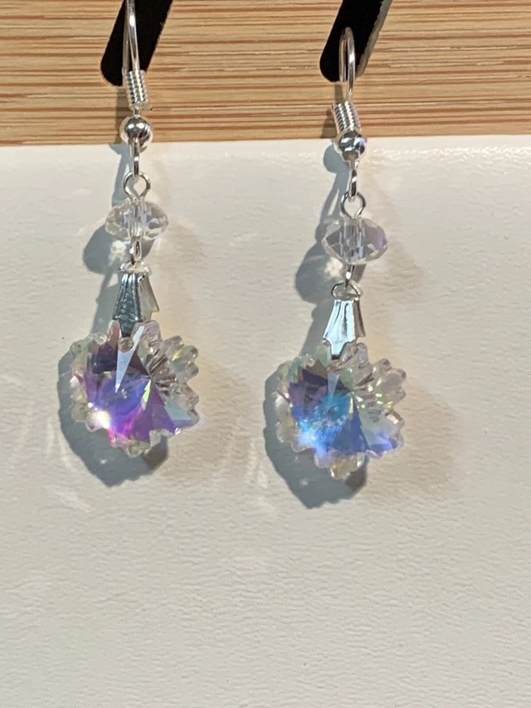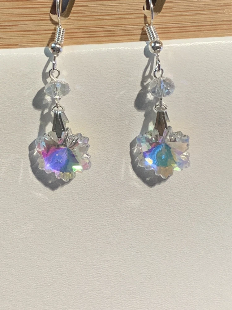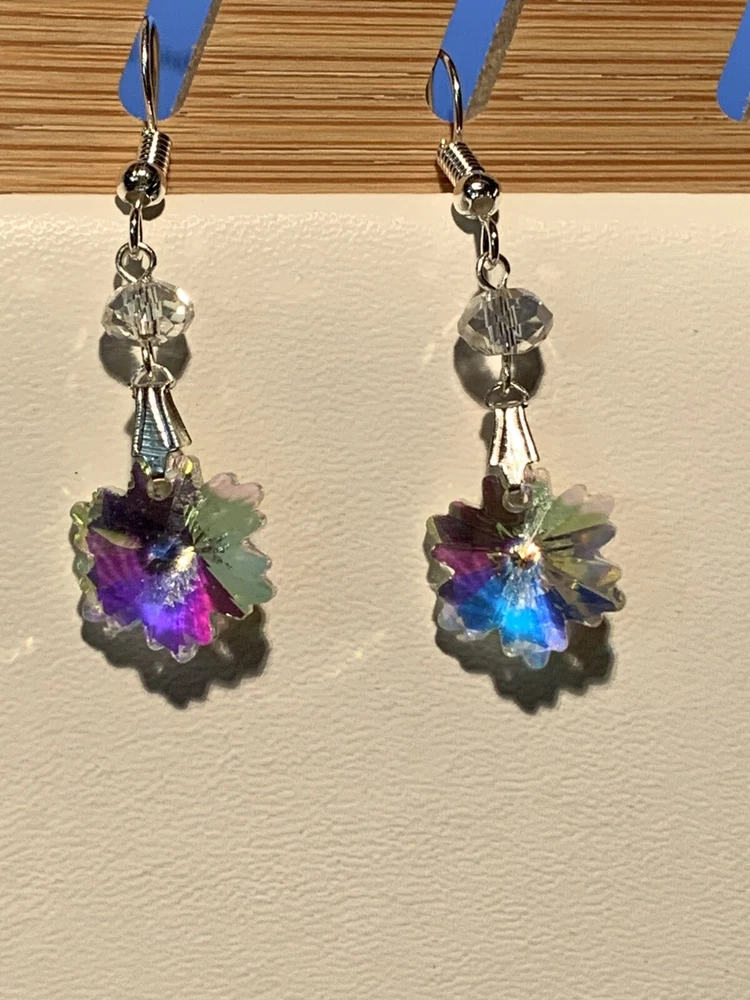 **STUNNING NEW HOLIDAY GIFT IDEA** These exquisite, handcrafted earrings feature a sparkling, 14mm faceted Austrian crystal snowflakes that have a stunning aurora borealis finish. The aurora finish gives the crystal an everchanging color show as the light plays off its facets. Hues of light blue, rose, pale green, violet and amber can be easily seen, making these very versatile jewelry accessories that will go beautifully with any color outfit. The snowflake earring drops are embellished with a matching 6mm faceted crystal rondelle bead with the same aurora borealis finish. The earrings measure 1 3/4" in length and are mounted silver French hook ear wires . ***SHIPPING COST INCLUDES USPS DOMESTIC GROUND ADVANTAGE WITH TRACKING, INSURANCE, AND DELIVERY CONFIRMATION**** *** SHIPPING FEES ARE NOT REFUNDABLE**AND RETURN SHIPPING IS TO BE PAID BY BUYER**