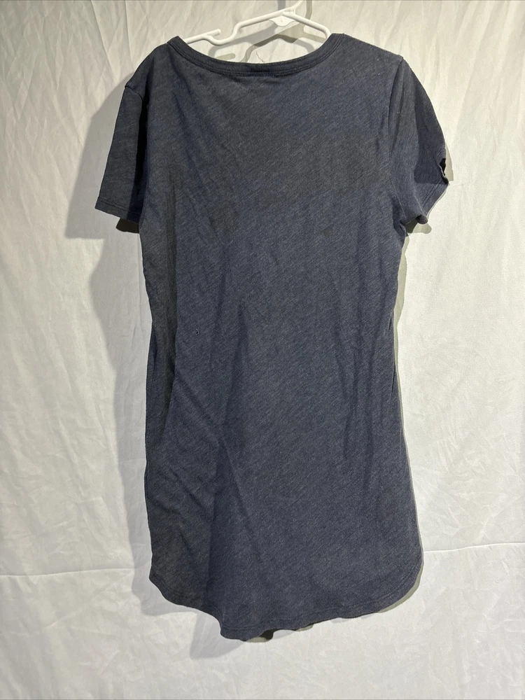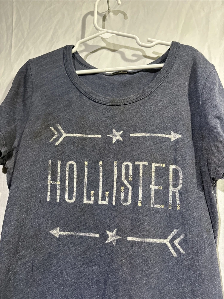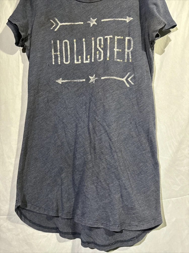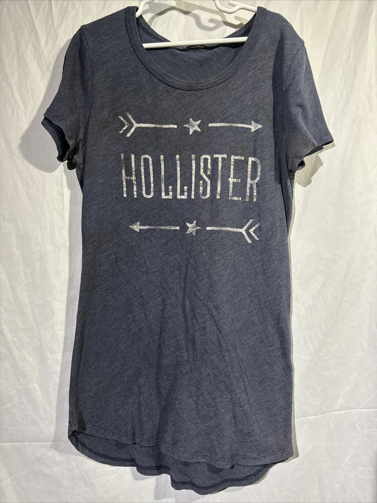 This navy blue Hollister graphic T-shirt is a perfect addition to your summer or spring wardrobe. Made of comfortable cotton jersey fabric, it features a round neckline and short sleeves with a pullover closure. The shirt has a regular fit and is available in size XS, with an armpit to armpit measurement of 15 inches and a collar to hem length of 24 inches. The T-shirt is designed with a solid pattern, a logo accent, and a graphic print that adds a touch of designer style to your casual occasion. It is suitable for women who love to stay comfortable while maintaining a stylish look. This Hollister graphic T-shirt is a must-have item for your summer or spring collection.