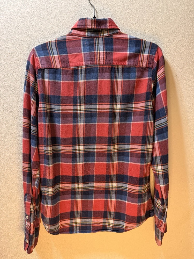 The HOLLISTER Y2K Red Plaid Flannel Button-Up Shirt Blouse in size small is a stylish and versatile piece designed for women. Made from 100% cotton flannel, this collared shirt features a classic red plaid pattern, long sleeves, and a button closure. Perfect for casual, workwear, or travel occasions, this blouse includes a convenient pocket detail. The Hollister brand ensures quality and a fashionable flair to this wardrobe staple.