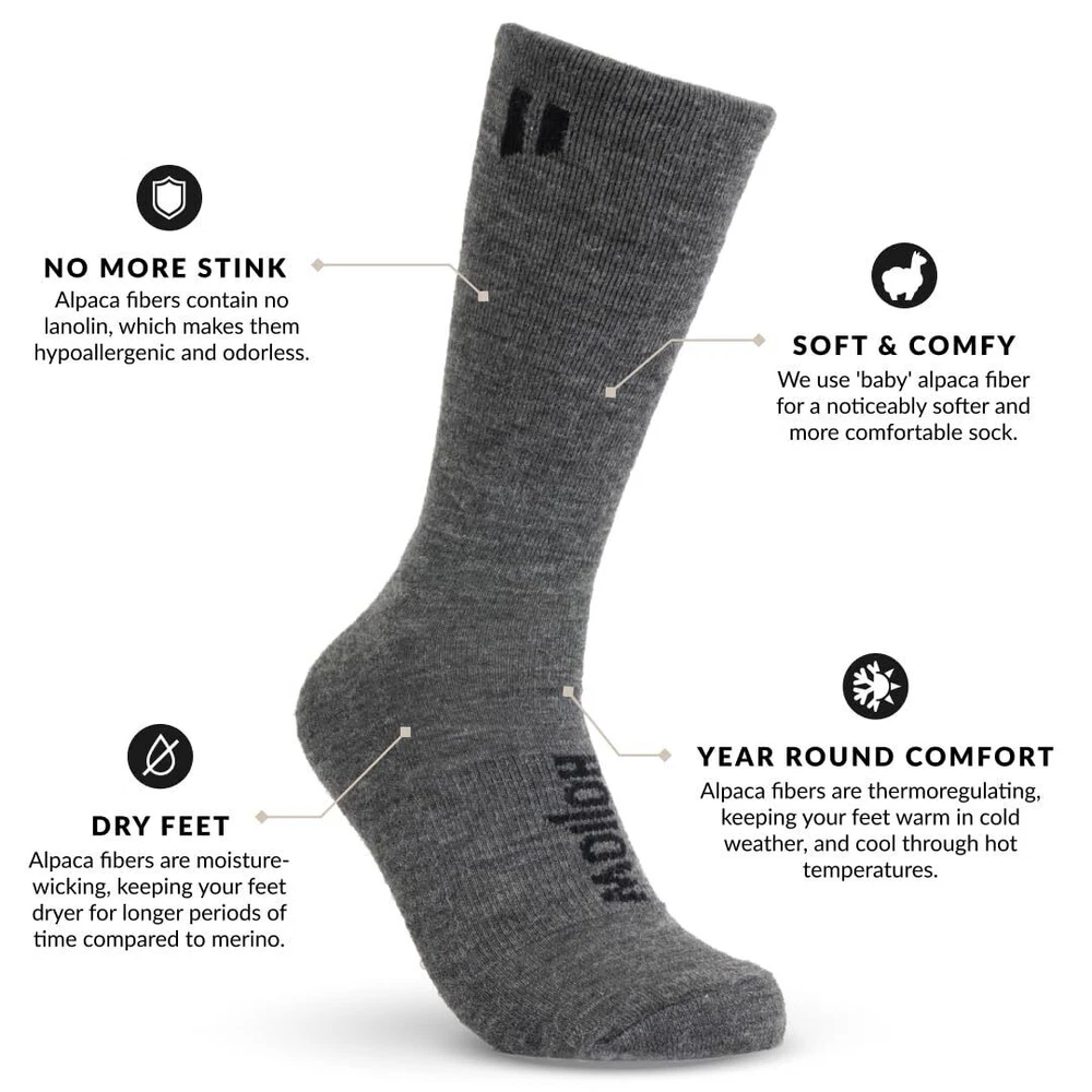 eBay HOLLOW Alpaca Crew Socks for Men and Women, Moisture Wicking Alpaca Socks for Hiking, Running, Outdoors, Any Season Crew Sock, Temperature Regulating, Light Compression, Medium, Grey Description and features SIZE 8-10 CREW SOCKS: Our crew performance alpaca socks are perfect for year round comfort with light compression, a classic crew style sock elevated. Made with 47% Premium Peruvian Baby Alpaca Fiber, 47% Nylon and 6% Spandex. Available in grey and black and a variety of sizes for men and women. FOR EVERY ACTIVITY: Softer and stronger than most other materials typically found in socks, alpaca fiber continues to prove it can withstand a wide range of activities and adventures. Whether you’re looking for hiking socks, hunting socks, running socks, thermal socks, warm socks, winter socks, ski socks, or just a pair of cozy socks for work or relaxing - the benefits of Hollow alpaca socks will keep your feet comfortable. LIGHTWEIGHT & BREATHABLE: Compared to traditional merino wool socks, alpaca fibers have better insulation properties at a lighter weight. The hollow fibers help regulate any temperature, keeping feet warmer or cooler for much longer periods of time. Alpaca fiber is a unique material that can wick moisture, to help keep feet dry and endure long wear. HYPOALLERGENIC & ITCH FREE: Because alpaca fiber is lanolin-free, our alpaca socks for men and women are hypoallergenic and itch-free. The structure of alpaca fibers is not only soft, it also helps provide a cushion against callus buildups, that may help with blisters and foot health. MADE IN THE USA: Our baby alpaca socks are soft, comfortable, and crafted for easy cleaning. Simply wash in cool water and hang to dry. Designed in Wisconsin by outdoor enthusiasts, and made in North Carolina Return Policy ⦿ All our products come with a 30-Day Return Policy. If you would like to return your item and you are within 30 days of the purchase, and it is still in its original condition, you can return the item by contacting us through eBay messaging. ⦿ If you are not 100% satisfied, please let us know the Detailed Problem,We will give you a 100% satisfactory solution ⦿ If you received an incorrect, damaged, defective, or item not as described, contact us for a partial/full refund or replacement on our cost. ⦿ Free Shipping and Free Return 30-Days Money Back Guarantee. ☎ For all returned products, buyers MUST contact us for the returning address. Shipping ⦿ We do not ship to a different address. we will ship to the address you provide on the ebay only. Please check your address before purchase. ⦿ It should take 2-4 business days for the product to reach your destination. ⦿ If the product doesn't reach your destination within the time limit, please give it an additional 1-2 business days in case of postal delays and/or possible technical issues. ⦿ We use a selection of shipping services such as UPS, FedEx, USPS etc. ⦿ We ship only to the 48 contiguous states of America. We do not ship to Hawaii, Alaska, US Protectorates, APO/FPO addresses. Local pickups are not offered. ☎ If it takes any longer than that, please do not hesitate to contact us to resolve the issues. Contact us ☎ Please contact us via eBay message. And your message will be replied within 1 business days. For any queries, please feel free to contact us, we will get back to you as quickly as possible. Customer 100% satisfaction is our first priority and goal. We are always working hard for maintain high standards of excellence and resolve your problem in best way. So your POSITIVE FEEDBACK is very important. If you have any problem of the item, please feel free to let us know before leaving your feedback. We will try our best to solve your problem. About us We are here to give you quality products, competitive pricing and amazing service in order to make sure you get the best deal online, Thank you for your business and the opportunity to serve you.