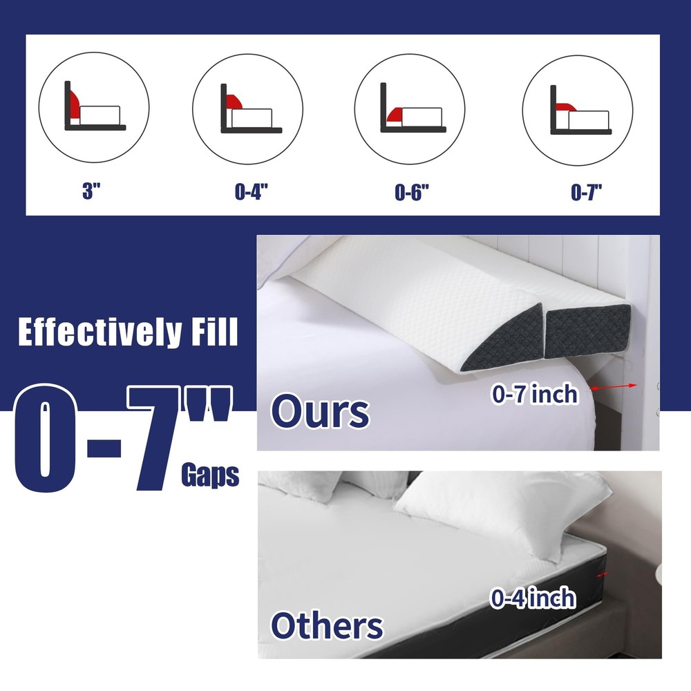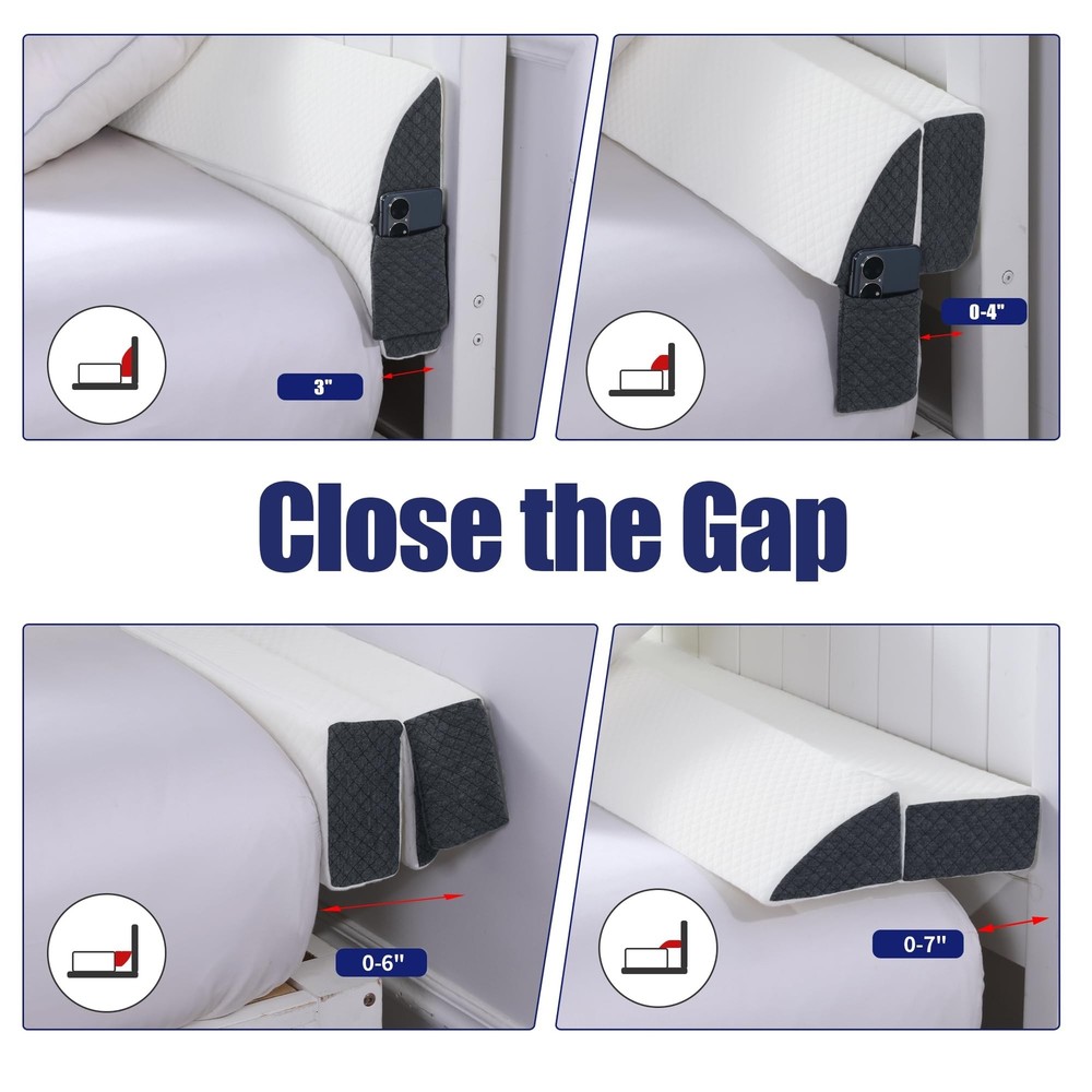 HOMBYS Pillow Wedge for Headboard Gap,Mattress Wedge Gap Filler Full Size,Bed Crack Pillow,Foam Bed Gap Filler,Multifuctional Headboard Space Filler with Side Pocket,Fill The Gap (0-7") Product Details Size: Full(54x6.3x6 in) Color: White & Grey Brand: HOMBYS MPN: PJCFTCW UPC: Does not apply EAN: Does not apply Brand: HOMBYS Special Feature: Foldable Color: White & Grey Size: Full(54x6.3x6 in) Fill Material: Memory Foam Brand: HOMBYS Special Feature: Foldable Color: White & Grey Size: Full(54x6.3x6 in) Fill Material: Memory Foam Shape: Rectangular, Wedge Age Range (Description): Adult Recommended Uses For Product: Sleeping Use for: Whole Body Material: Foam, Memory Foam Item Firmness Description: Soft Product Care Instructions: Machine Wash Number of Pieces: 1 Pattern: Solid Material Feature: Breathable Fabric Type: 100% Polyester Model Name: Wedge Pillow Headboard for Bed Gap Manufacturer: HOMBYS Product Dimensions: 54"L x 6.3"W Unit Count: 1.0 Count Item Weight: 2.89 pounds Country of Origin: China Item model number: PJCFTCW Date First Available: March 21, 2024 Close 0- 7 inch gap:Our engineers optimized and upgraded the gap filler to a folding type according to our customers' needs, making it suitable for most beds. Roommate's Bed Gap Pillow is perfect for your headboard and mattress, preventing objects from slipping off the bed and reducing noise. When the Mattress Wedge Gap Filler becomes rectangular, it fills gaps from 0 to 7 inches wide. No more bending over to look under the bed for fallen objects! PERFECT BED PILLOW COMPANIONS - Uniquely designed mattress gap filler is adjustable for freestyle gap filling, and the triangles on the wedge pillow can be flipped into a rectangular pillow. Cover the space between the bed and the wall or add a cover to fit exactly what you expect. HIGH DENSITY PREMIUM FOAM The HOMBYS Wedge Pillow Plug is made of 25d high density memory foam, which provides superior durability and support without collapsing. As a result, our bed wedge pillow plugs are sturdy enough to block seams and prevent the pillow from slipping. Even after prolonged use, the wedge sleep pillow will not lose its shape or support due to compression. Removable Cover- The headboard pillow is made of skin-friendly and breathable fabric, odorless, soft and silky. Zipper design allows you to remove the pillowcase for replacement and cleaning. Machine washable, no pilling for long time use. Fully Unfolded in 48 Hours - Compressed for optimal transportation. The headboard pillow will keep its shape for a long time without deforming. Meanwhile, it is soft enough to be used as a cozy headboard cushion on your bed.