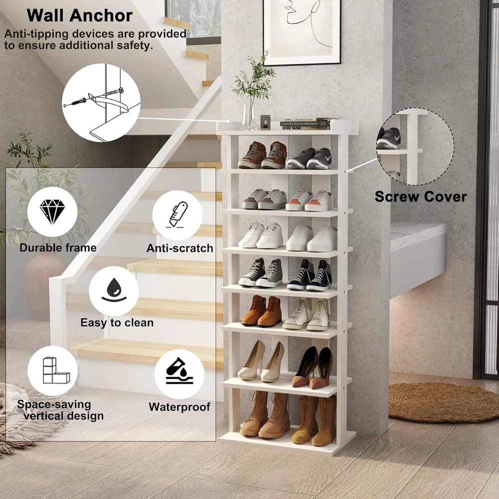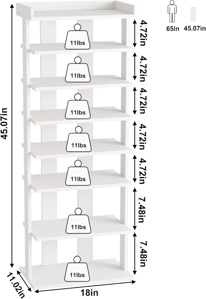 HOMEFORT 7-Tier Wood Shoe Rack, Double 11"Dx18"Wx45.1"H, White Product Details Room Type: Entryway,Living Room,Bedroom,Closet Number of Shelves: 7 Special Feature: Space Saving Product Dimensions: 11.02"D x 18"W x 45.07"H Style: Modern Age Range (Description): All Finish Type: Wood Brand: HOMEFORT Product Care Instructions: Wipe with Dry Cloth Size: 11"Dx18"Wx45.1"H Weight Limit: 11 Pounds Assembly Required: Yes Recommended Uses For Product: Shoe Number of Items: 1 Manufacturer: HOMEFORT Included Components: Assembly Hardware Item Weight: 19.8 Pounds Furniture Finish: White Installation Type: Freestanding Min. Required Door Width: 45.07 Inches Weight capacity: Maximum weight: 11 Pounds Back Style: Backless Specific Uses For Product: Shoes Unit Count: 1.0 Count Shelf Thickness: 12 Millimeters Item Weight: 19.8 pounds Item model number: PG-01SR571A-2WPN03 MaterialMounting Type: Engineered WoodFloor Mount Shelf TypeShape: Tiered ShelfRectangular Maximize the Vertical Storage Space for Small Corners: The dimension of 18" W x 11.02" D x45.07" H makes it a perfect size for a tiny front door, walk-in closet, and entryway. You can also omit shelves to fit specific shoes and boots according to your demand. 7 Open Shelves to Organize and De-clutter: Double rows of seven open shelves provide ample storage space for shoes in an organized way to make shoes clear at a glance. It fits most shoes and is easy to clean, such as boots, high heels, and sneakers. Sturdy and Compact Shoe Organizer: Made of wood, this shoe tower is durable and sturdier for long-term use. Unlike the rigid metal shoe racks, this one is specially designed with a look of wood accent to be stylish and natural enough to suit any home decoration. Tall Shoe Shelf with Different Height: Designed with different heights of shelves, the bottom two layers are 7.48" high, perfect for high heels. The top 5 shelves are 4.72" tall, making it suitable for flat shoes, slippers, sneakers, etc. Item Weight:19.8lbs. Easy and Quick to Assemble: With clearly labeled assembly parts and well-illustrated instructions, this wooden 7-tier shoe rack is quick to assemble.