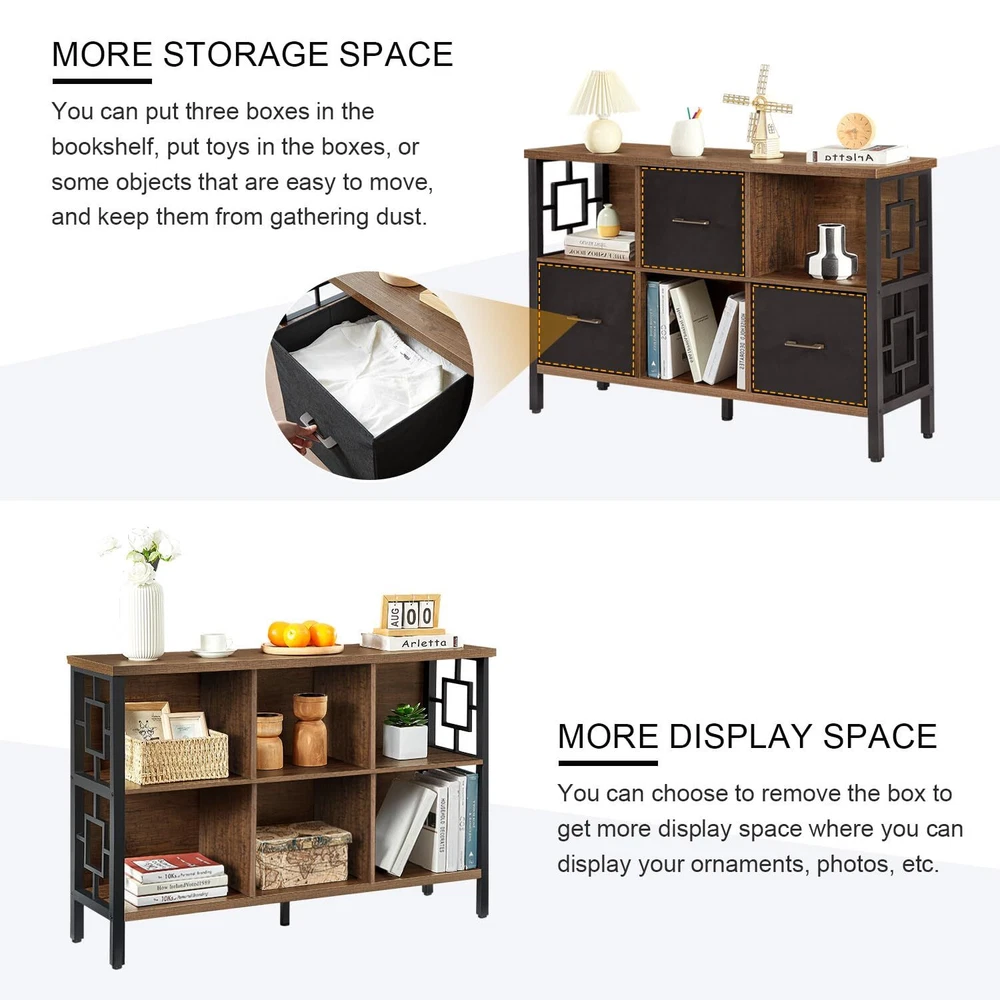 【Rustic industrial design】HOMISSUE 6 cube storage organizer features an industrial-style metal frame combined with unique textured boards, the geometric side structure adds a striking highlight. The side of the cube bookshelf is designed to increase safety by preventing items from falling. The cube bookcase exudes a charming rustic aesthetic, making it a perfect addition to your home. 【Large storage space】This 3-tier bookshelf offers large storage space, including 6 square storage spaces and a large platform at the top, keeping your belongings organized. The horizontal bookshelf also comes with 3 additional foldable cube storage bins, giving you more space to store your items efficiently. 【Multi-scenario application】You can place the short bookshelf in your living room or office as a rustic bookcase or storage unit, and even use it in the kid’s room as a toy storage cabinet. Additionally, Homissue bookcase can serve as a TV stand, providing a perfect display for your television. Whether for storage or showcasing items, it meets all your needs. 【 High-quality materials】 The top tier of the horizontal bookshelf is crafted from 0.98” MDF board, supported by a sturdy metal frame. An additional metal support leg at the bottom enhances the overall stability and safety of the 3-tier bookshelf. The top tier can hold up to 330 pounds, while each cube storage is designed to support 110 pounds. Overall Dimension: 47.22” W x 12.8 ”D x 30” H. 【Easy to assemble】 The assembly process is easy and can be completed in 30 minutes if two people work together. With detailed instructions and all necessary hardware included, you can easily assemble this horizontal bookshelf. If you have difficulty assembling or using HOMISSUE 6 cube storage organizer shelf, you can ask our customer service for help. We'll get back to you as soon as possible.