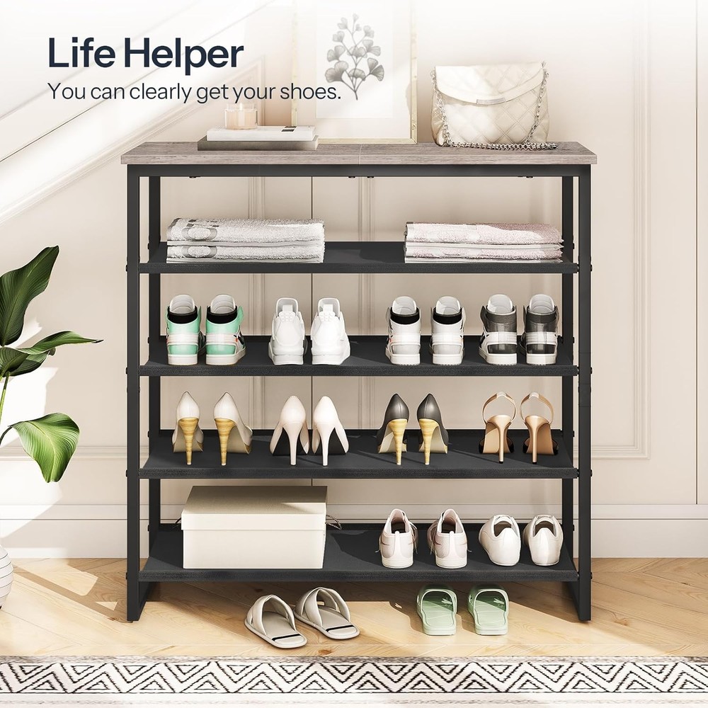 HOOBRO Shoe Rack, 5 29.5"L x 11.2"W x 29.5"H, Greige + Black Product Details Room Type: Entryway, Closet, Bedroom, Living Room, Mudroom Number of Shelves: 5 Special Feature: Adjustable Product Dimensions: 11.2"D x 29.5"W x 29.5"H Style: Industrial Age Range (Description): Adult,Kid Finish Type: Unfinished Brand: HOOBRO Size: 29.5"L x 11.2"W x 29.5"H Weight Limit: 22 Pounds Assembly Required: Yes Number of Items: 1 Manufacturer: HOOBRO Included Components: Hardware, Accessory Kit Model Name: Shoe Rack Item Weight: 5.5 Kilograms Furniture Finish: Unfinished Installation Type: Freestanding Weight capacity: Maximum weight: 22 Pounds Unit Count: 5.0 Count Product Name: Shoe Rack Item Weight: 12.1 pounds Item model number: BG50XJ01 Shoe Rack MaterialMounting Type: Engineered Wood, MetalFloor Mount Shelf TypeShape: Oxford FabricRectangular 5-Tier Shoe Rack: Shoes no longer need to be piled in the corridor, because you can put them neatly on this 5-tier shoe rack. By making full use of the space, you can clearly get your shoes Storage Helper: This shoe rack is 11.2"D x 29.5"W x 29.5"H in size, very suitable for entryway with limited space, living room, bedroom, closet, apartment and dormitory. Extending vertical space usage, this shoe rack can be a choice for saving space. It also can be a storage shelf. Unleash your creativity! Material and Structure: This shoe rack is made of durable waterproof oxford cloth, particleboard and thickened iron pipe, featuring easier clean. The top wooden shelf can be used to place albums, plants, handbags and other items, beautiful and practical Built to Last: The reasonable structural design enhances the stability of the shoe rack. Max load ability of the top is 22 lb with each shelf bearing up to 11 lb. 4 adjustable feet help keep balance at all times Easy Assembly: Easy to set up in just a few steps. With detailed instructions and clearly numbered parts, it does’ t take any time to assemble this shoe rack