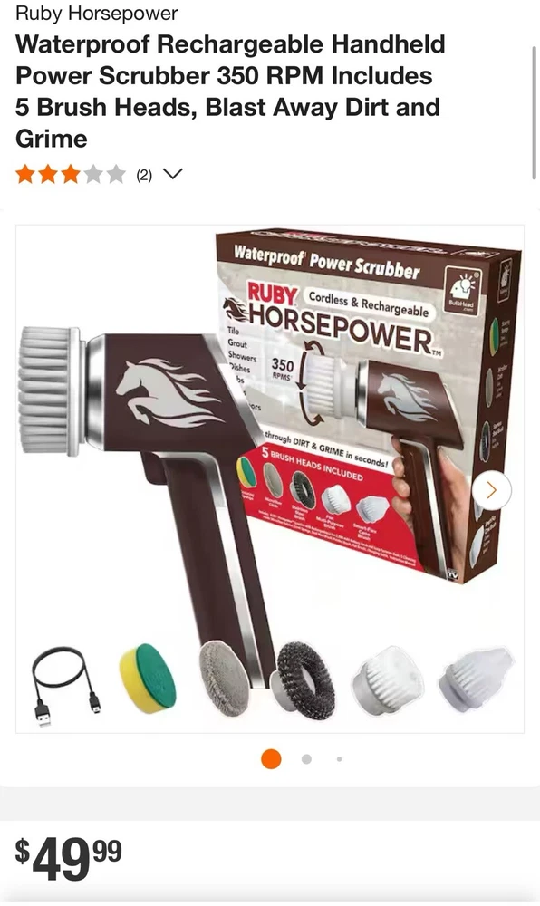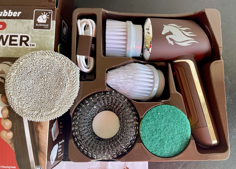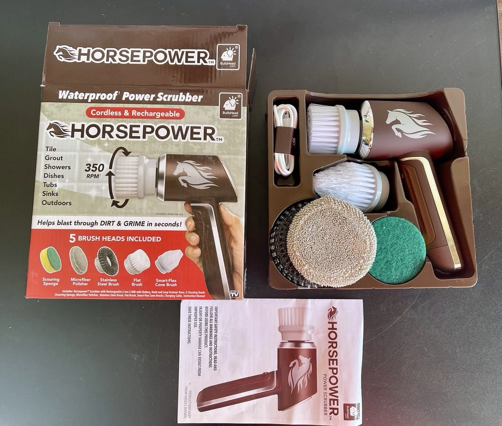 Volume: Electric Power Scrubber Item Height: Electric Power Scrubber Theme: . Features: Rechargeable, Waterproof, Cordless, Lightweight, 5 Brush Heads, High Torque, High RPM, Electrostatic Bristle Special Feature: Lightweight Personalization Instructions: No Type: Power Brush Unit Count: 1 Count Batteries: rechargable Labels & Certifications: N/A Brand: Horsepower Shape: Rectangular Form: Stick Surface Recommendation: Floor, Tile, Windows, Grout Product Dimensions: . Number Of Items: 1 Personalize: No Capacity: 350 RPM Item Width: Electric Power Scrubber Handle Material: Plastic Number in Pack: 1 Item Length: Electric Power Scrubber Color: Brown Scent: Scent Free Upc: . Specific Uses For Product: Counter, Sink, Stove, Shower, Bathtub Item Weight: 0.8 lbs MPN: N/A Country/Region of Manufacture: Unknown Material: Form,microfiber,stainless Steel For: Bathroom