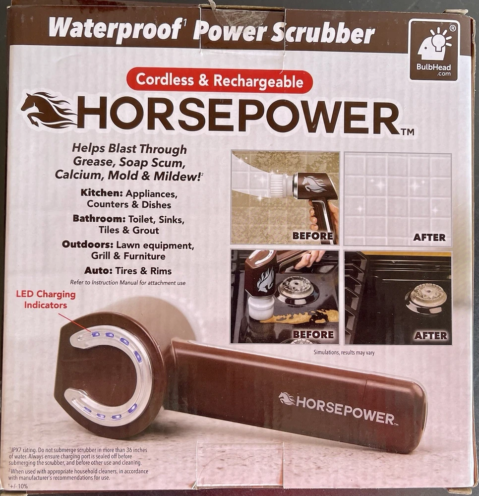 HorsePower Waterproof Rechargeable Handheld Power Scrubber 350 RPM Includes 5 Brush Heads Blast Away Dirt and Grime This Item is NEW OPEN BOX