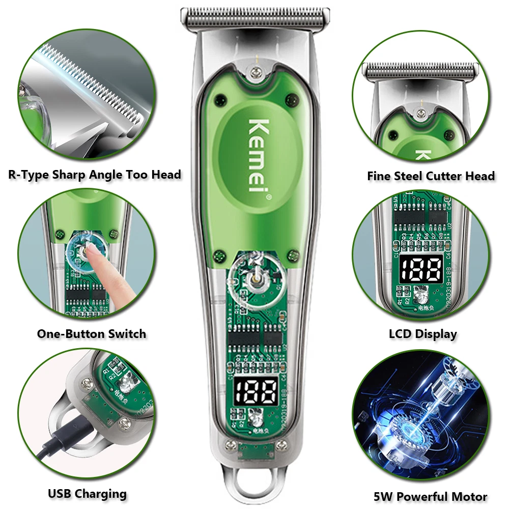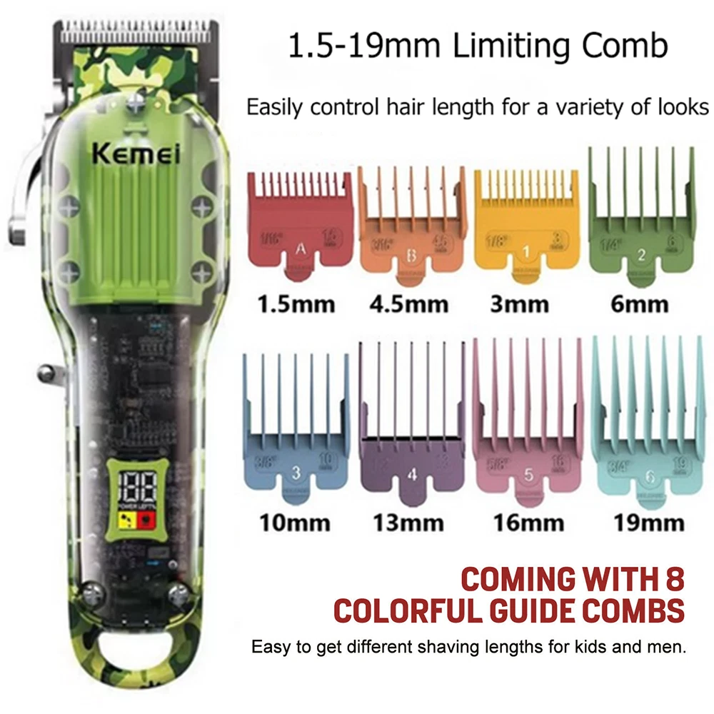 Features: 1.Powerful long-life motor cute-angled moving blade, sharp and durable 2.Considerate and digitalized smart LCD display for reminder, 6300rpm/min strong power, Less than 55dB low noise, Once charging can last up to 240-min working time 3. Newly designed acrylic material, sturdy and durable, with a beautiful appearance, you can directly see the internal parts. Specification : Brand : KM-1926 Machine Weight : 267g Machine Size : 18*4.5*3cm / 7*1.7*1.2 Inch Voltage : 100-240V Frequency : 50/60Hz Batt e ry : 8W Charging Time : 3 Hours Using Time : 240 Mins Power Supply : USB Recharge Cleaning Way : Cleaning With Brush Package list : 1 * Hair clipper 8* Limit combs (1.5/3/4.5/6/10/13/16/19mm) 1 * USB cable 1 * Cleaning brush 1*Manual
