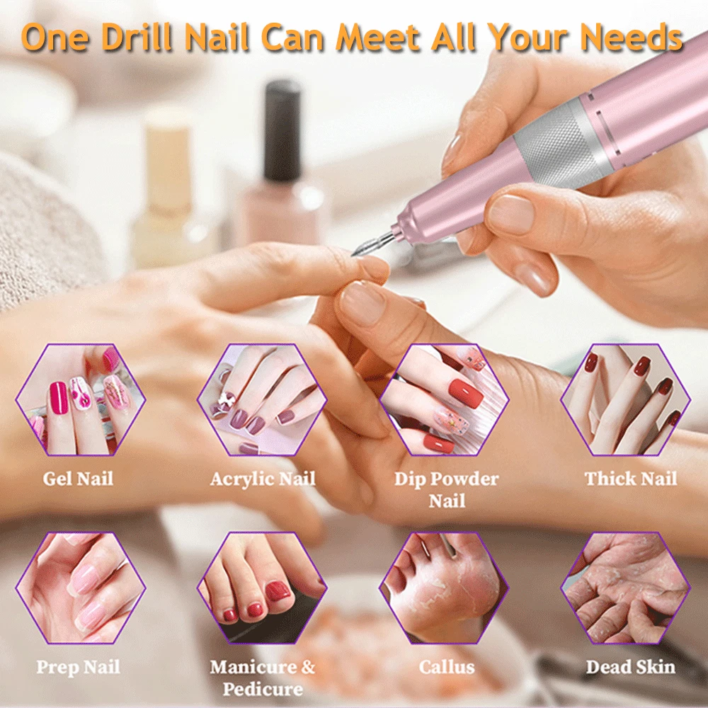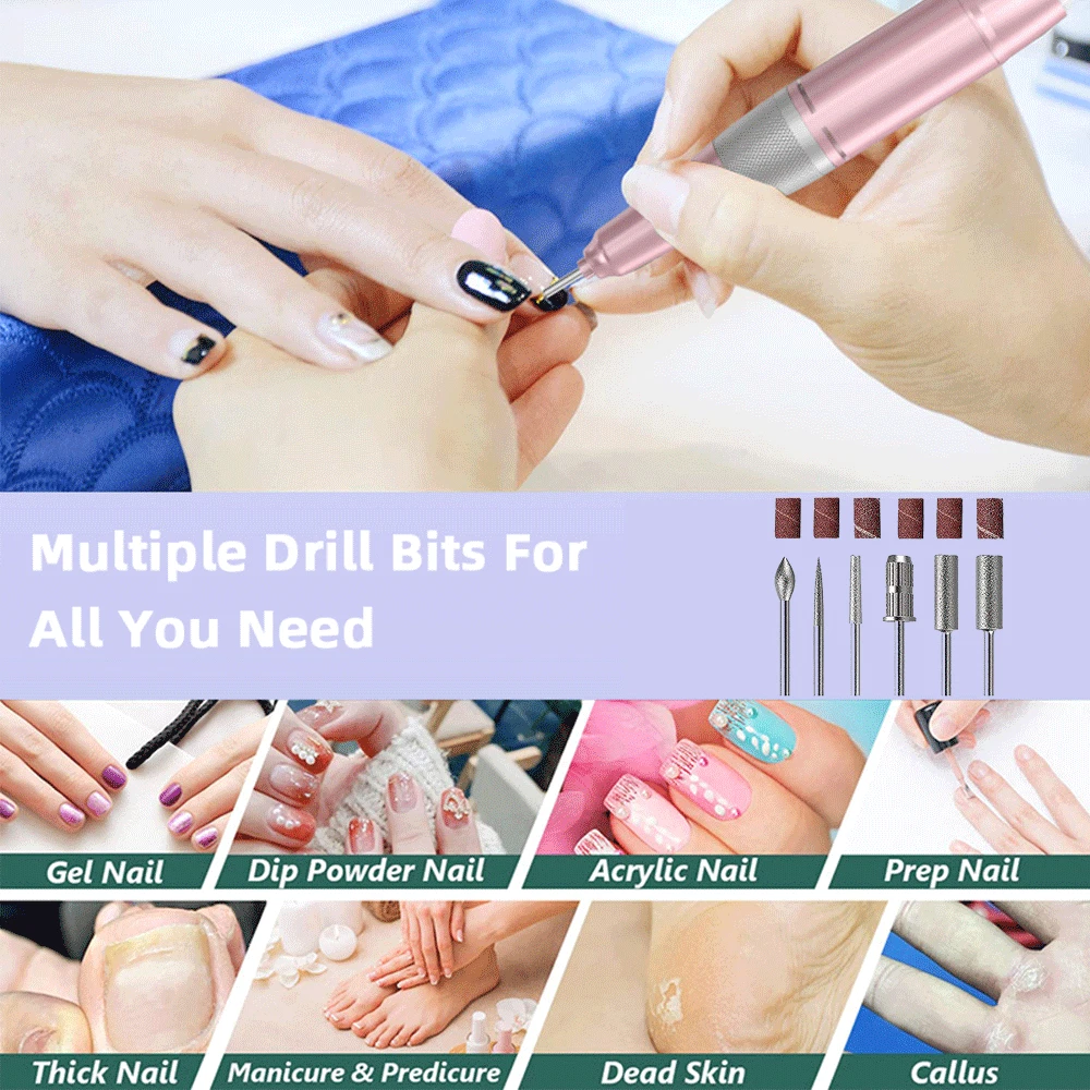 Features : 1. Rechargeable & Portable: The nail drill built in 2600mAH battery. After about 2 h charged, this electric file can use without plugging in the outlet and lasts 8-10 hour operation time. With its compact size and light weight, it can be easily to carry, convenient for you to use it anytime, anywhere. Portable clips at the rear of the body, can be hung in a belt or placed in a bag or box. 2. Adjustable speed and LED Screen : 0-45000RPM high speed and you can control the speed by a rotary switch on the top of machine. The LCD display can clearly show you the speed and the power status. 3. Low heat/vibration/noise handpiece: The special material and ample ventilation holes design enable it to have excellent heat dissipation function. Good quality makes it extremely quiet and smooth with slight vibration when doing nail care. 4. Multi-function and F/R direction : Electric Nail Drill Machine comes with 6pcs interchangeable nail drill bits (3/32”) for easily grinding, carving, cutting, polishing, removing gel polish and cuticles for both nails and natural nails. And the design with Forward and Reverse rotation directions are suitable for right hand or left hand use. 5. All-in-one Pack: comes with a plastic holder to for the handpiece, has a cradle to secure the handpiece from falling off the desk during operation; 6 drill bits, 6 sanding bands; Technical Specification : Color: Cl a ssic Gold / Classic Green/ Pearl White Dimension: 5.5 * 2.8 * 0.98 inch Rotary Speed: 0~45,000 RPM Power: 18W Charge Time: 1 Hours Working Time: 15 Hours Battery Capacity: 4000mAH Input Voltage Range: AC 100-240V/50-60(Hz) Output Voltage: DC 15V/2A Package Includes : 1 x Portable Nail Drill Machine 1 x Handpiece 1 x USB Charger 6 x Drill Bits 6 x Sanding bands 1 x User Manual