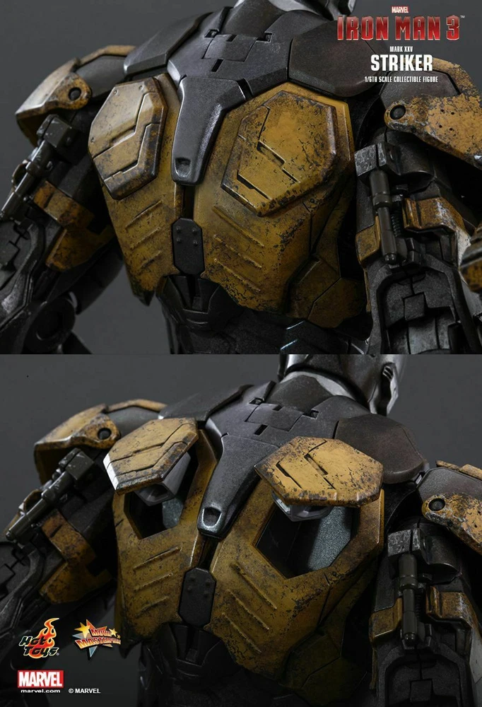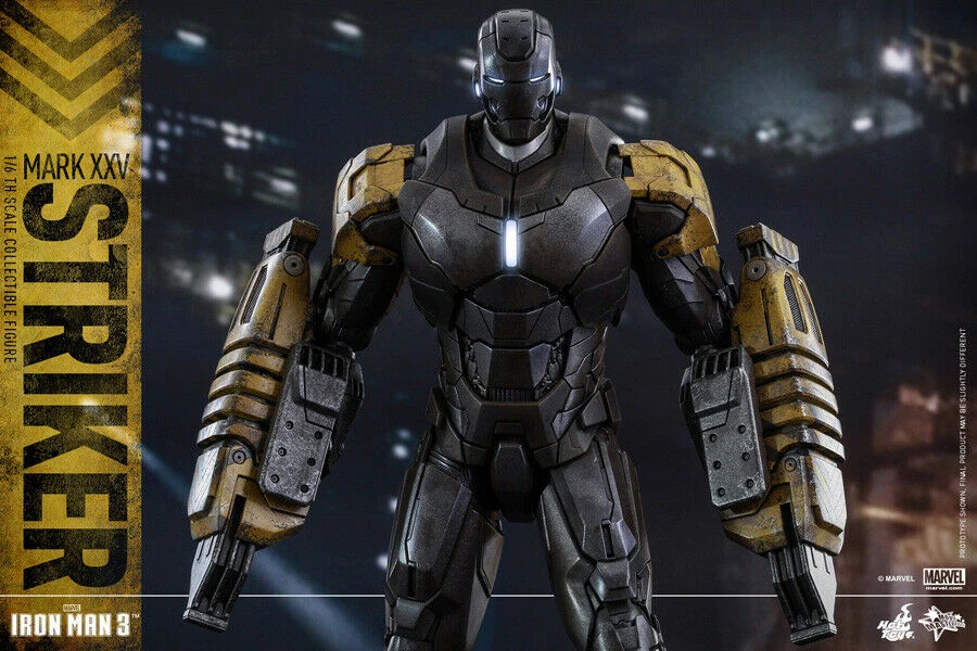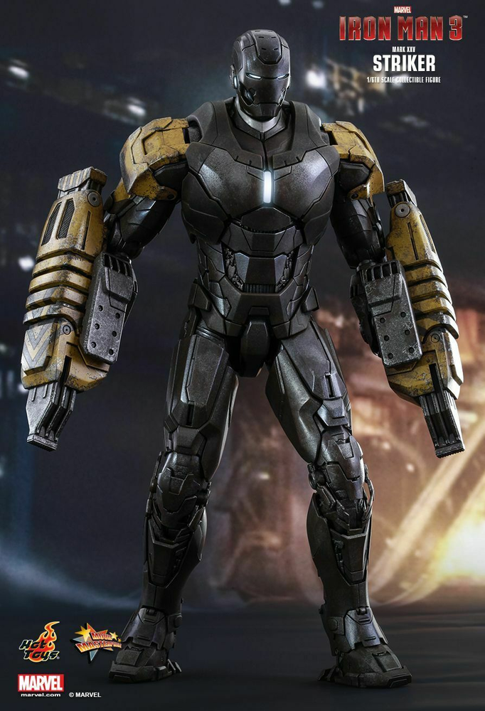 IRON MAN 3 MK25 STRIKER MARK XXV 1/6th scale Collectible Figures “It’s Christmas. Take them to church.” – Tony Stark. One of the suits Tony Stark has built in Iron Man 3 is the Striker (Mark XXV), the Heavy Construction Suit. This suit is designed for assisting in heavy construction with its distinctive Pneumatic Hammers. Although the hammers are not designed for combat, they still proved to be lethal when Striker assisted in eradicating the two Extremis soldiers who were trying to attack James Rhodes. Today Hot Toys is proud to present 1/6th scale Striker (Mark XXV) Collectible Figure featuring the suit’s distinctive design with the pair of Pneumatic Hammers, special paint application with distressed effects, LED light-up functions and figure stand. Expand your House Party Protocol and add this unique suit to your collection! Specifications Product Code // MMS277 Product Name // Striker (Mark XXV) Height // Approximately 34cm tall Points of Articulations // 30 Special Features // A pair of Pneumatic Hammers, special paint application with distressed effects, LED light-up functions and figure stand. Artists // Head Sculpted by . Head Painted by . Armor Painted by Lok Ho Head Art Directed by . Painting Art Directed by JC. Hong The 1/6th scale Striker (Mark XXV) Collectible Figure’s special features: - Authentic and detailed likeness of Striker (Mark XXV), the Heavy Construction Suit, in Iron Man 3 - Over 30 points of articulations - Approximately 34 cm tall - LED-lighted eyes and rectangular-shaped RT on chest (white light, battery operated) - Silver, gray, and yellow painting on armor with specially applied distressed effects - Special features on armor: - A pair of distinctive Pneumatic Hammers with LED light up function (white light, battery operated) - Articulated air flaps - Articulations on waist armor allowing flexible movement Accessory: - One (1) circular figure stage with flexible pillar **Prototype shown, final product may be slightly different **Product details could be subjected to change without further notice **Battery included for collectible figure. Button cells are required