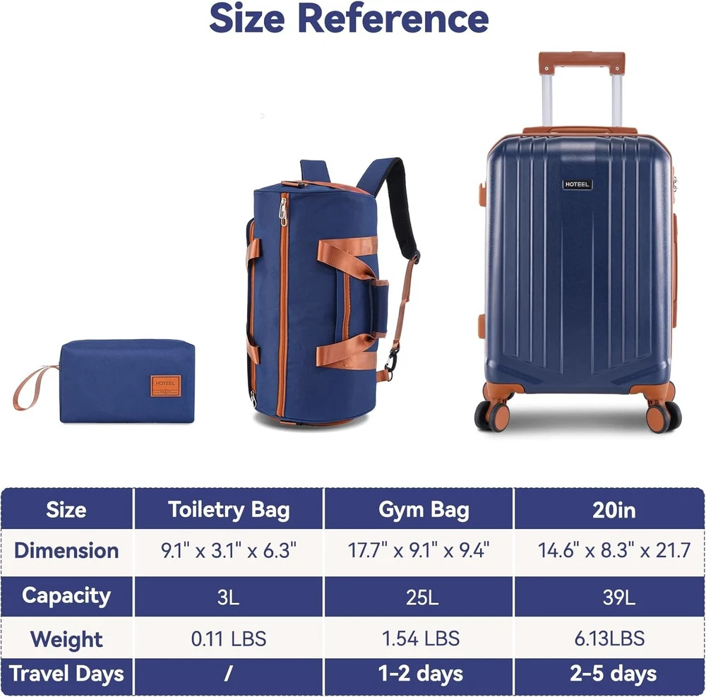 Description Hoteel Luggage Sets 3 Piece, 4-Yr Warranty Durable Suitcase Dual-Spinner Wheel TSA Lock, Lightweight Travel Hardshell PC+ABS Carry on Luggage for Men&Women(20in/GB/TB) Luggage Sets 3 Piece:20" carry-on suitcase (carry on luggage 22x14x9 airline approved, fits in overhead bins and under seats) + dual-purpose gym bag+ portable toiletry bag. The set covers all your travel needs with exceptional value Silent Dual-Spinner Wheels & Ergonomic Design: Carry-on luggage features premium wheels with 360° rotation for whisper-quiet rolling. Tested on airport floors, carpets, cobblestones for smooth performance. Three-position telescoping handle with side handles reduces strain TSA-Approved Lock & Premium Zipper Security: Built-in TSA-certified lock allows airport inspection without breaking lock. Features smooth-gliding zippers. Dual-security design protects valuables as checked luggage and provides peace of mind Enhanced Protection Organization: PC+ABS hardshell offers lightweight durability with scratch-resistant texture. 4 corner guards provide upright stability and protection. Interior features X-strap compression & zippered mesh compartment. The luggage set's duffel bag includes multiple pockets for organized packing HOTEEL Service: 90-day hassle-free returns, 4-year warranty protection, and long-term warranty for zippers, wheels & handles. We ensure a worry-free quality lifestyle for every memorable journey Payment 1 . We accept PayPal only. 2 . Payment should be completed within 4 (Four) days of auction closing. Or unpaid dispute will be filed for closing auction. 3 . Sales Tax of 9% will be applied for orders shipped within the state of California 4 . We will leave a positive feedback immediately after payment is received. We appreciate a positive feedback as much as you do. If for some reason there is any issue with the purchase, please contact us prior to leaving feedback, and we will be glad to work with you to have it resolved. Shipping 1 . We Ship to United States ONLY. 2 . Ship from two warehouses and only to eBay ADDRESS. Package handling only takes 1 business day at our warehouse, so please make sure entering correct payment and shipping information before checking out. Once your payment is completed, pls leave ebay note if the changes are needed before we send the product. 3 . Truck company: 3-8 business days. | USPS: 2-6 business days. | UPS/FEDEX: 3-5 business days. Warranty and Guarantee 1 . All of our items come with a 30-day return policy. We ensure all our items are new and in excellent condition prior to shipping. In the event that you receive the item that is not to the standards above, please contact us via e-Bay messages. All returns must be in new original condition as received and should be shipped with delivery confirmation 2 . We ONLY accept the return for original package. Please make sure that item has NO man-made sabotage. Used items will not be accepted for return. 3 . We reserve the right to refuse any returns for objective reasons. 4 . All NON-seller mistake returns for refund are subject to 20% re-stocking fee and buyer should pay for the round-trip shipping fee. (E.g. you bought wrong model or wrong color). Feadback 1 .Any problem after receiving our goods,please contact us before leaving Neutral/Negative feedback.We promise to help you solve it asap,and make you feel satisfactory absolutely. 2 . Please DO NOT leave negative feedback without asking for help. Please do not leave negative or neutral feedback if you haven't received item in 30 days, because we have mentioned the shipping time repeatedly.