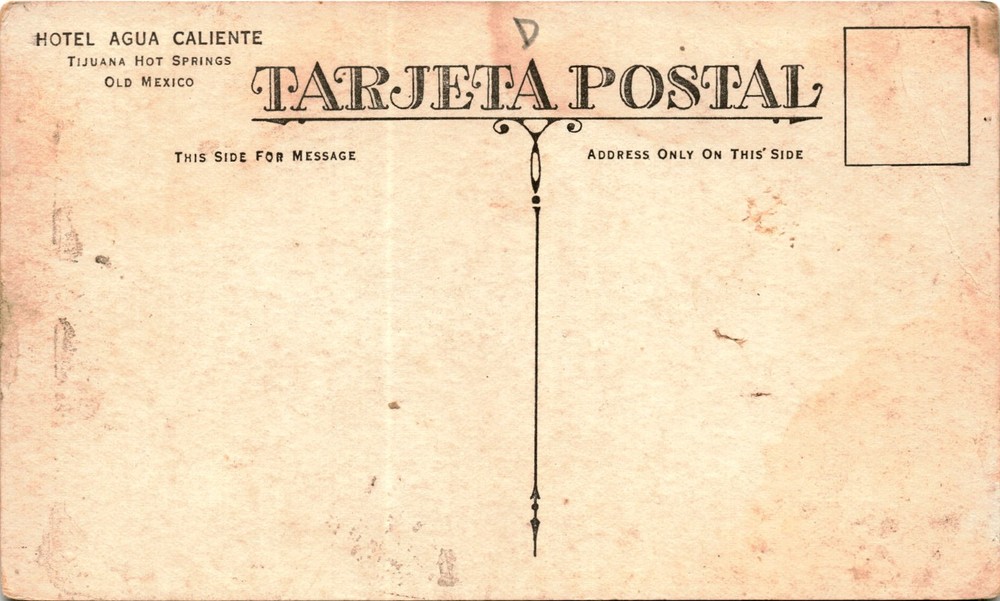 MAKE AN OFFER. THE MORE YOU BUY THE BETTER DEAL I WILL ACCEPT The postcard is from the Hotel Agua Caliente in Tijuana Hot Springs, Old Mexico. The front of the postcard is designated for a message, while the address should be written on the other side.1. **Hotel Agua Caliente**: This was a famous resort and casino in Tijuana, Mexico, known for its hot springs.