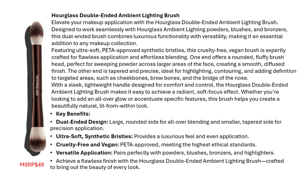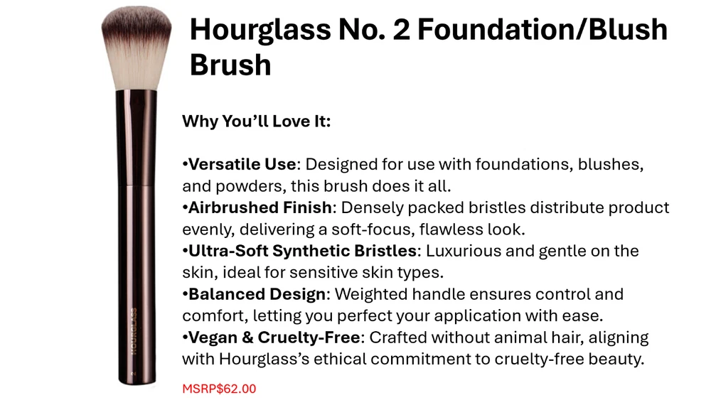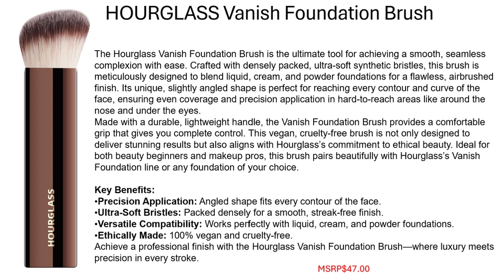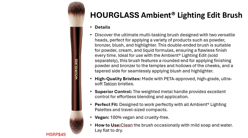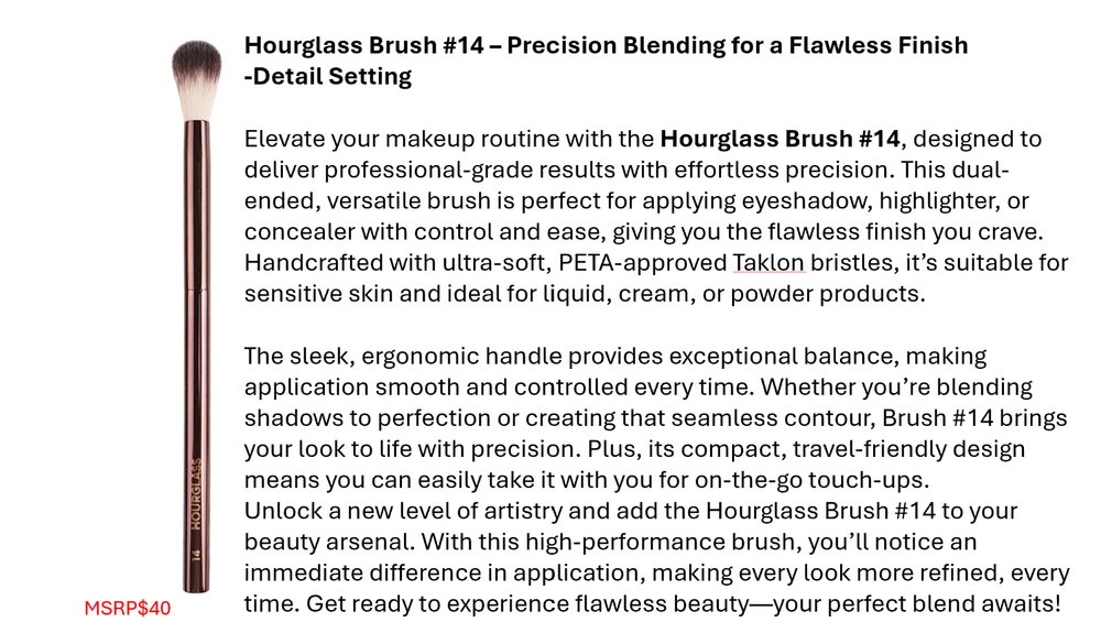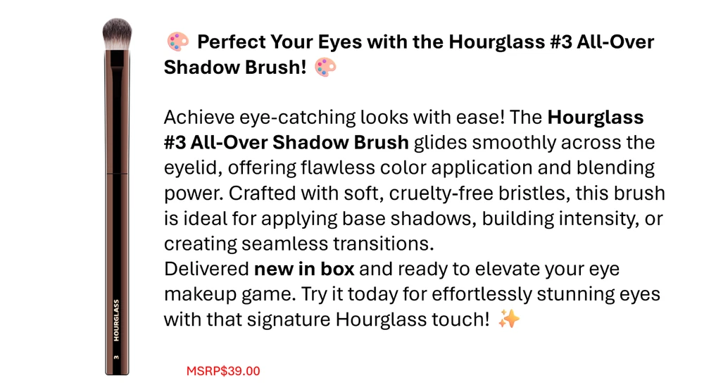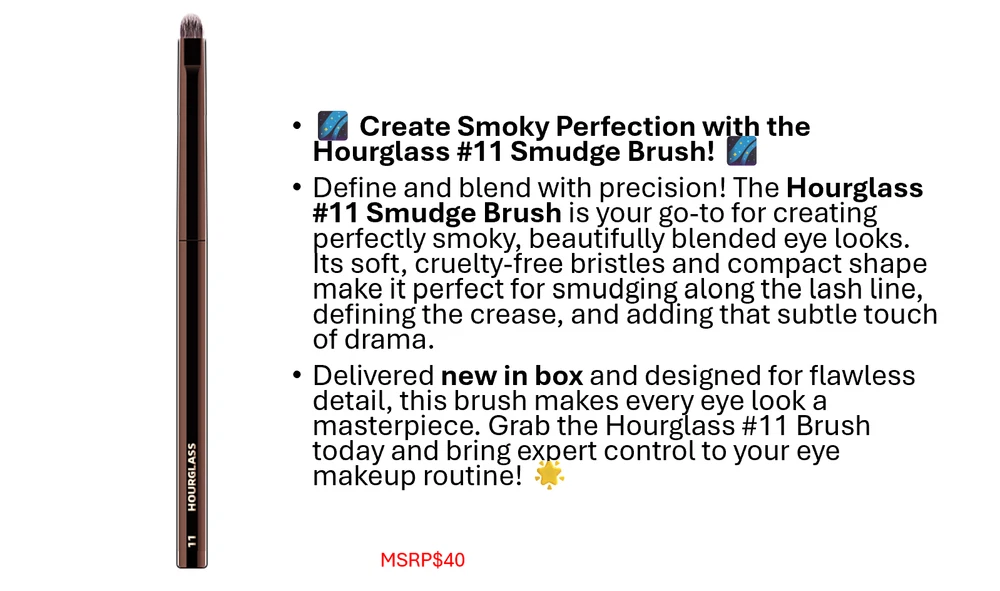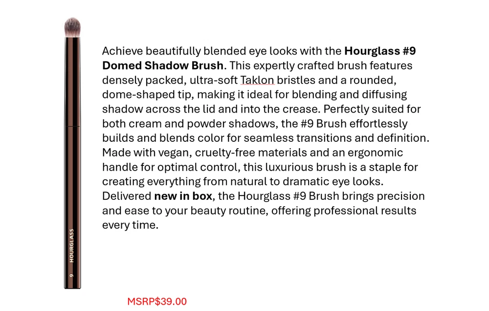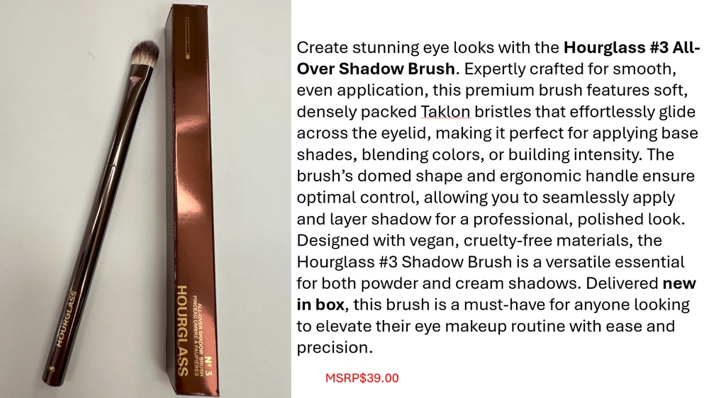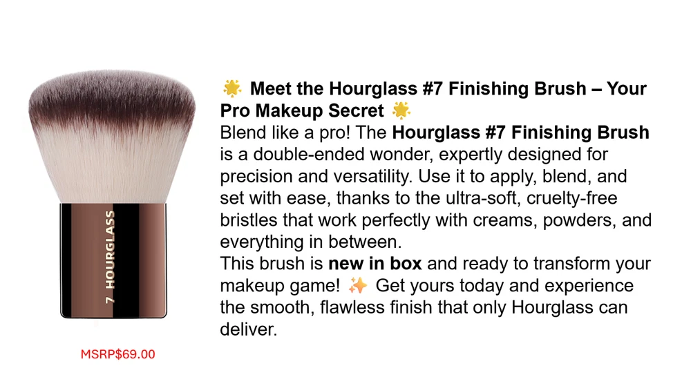 Looking to upgrade your brush collection without breaking the bank? These HOURGLASS makeup brushes are designed for flawless blending, buffing, and detailing – a must-have for any beauty lover. Please note, All 23 Hourglass brushes are brand new in box, except Model #15, which is brand new without box. ✨ Bundle & Save Add more brushes to your cart → pay less on shipping Buy 10+ brushes and receive a FREE brush bag to keep your tools neat and travel-ready 💎 Why you’ll love them: ✔️ Luxury brushes at a fraction of the retail price ✔️ Perfect for building a complete set or replacing old favorites ✔️ Extra value with our free gift on larger orders 📦 Fast shipping, carefully packed 💖 Create your own custom set & snag your freebie when you go big! Welcome to Brush Masters Empire At Brush Masters Empire, we are proud to be your ultimate eBay destination for premium makeup brushes . Add us to your favorites to stay updated on exclusive sales, promotions, and markdown events. We restock and add new products daily, so be sure to check back often. Special Savings Use Add to Cart to mix and match across Brush Masters Empire and enjoy additional discounts on multiple items For combined shipping requests, please contact us at any time. Our team typically responds within 10 minutes to provide a tailored shipping discount Complimentary Gift Every order includes a premium skincare sample, randomly selected, as a token of our appreciation Product Details 100% Authentic products, always guaranteed New In Box (NIB) and factory sealed unless otherwise noted Wide selection of brushes: foundation, powder, lip, eye, concealer, contour, blush, highlight, and more Some items are sourced from overstock, shelf pulls, prior designs, discontinued lines, or packaging updates. Please note that certain items may not include original store display boxes All items are stored in a climate-controlled, smoke-free environment Pictures are part of the description. Colors may vary slightly depending on lighting and display settings Size: Full-size assortment available Shipping and Handling Fast and Free Domestic Shipping. Securely packed with tracking confirmation. Orders dispatched same or next business day Expedited and Express Options available for faster delivery View Details International Shipping available through the eBay Global Shipping Program. Duties, taxes, and fees are calculated upfront at checkout with no additional payments upon delivery Our Commitment Over 50,000 products sold on eBay since 2014. A trusted and established seller with a proven track record Each product undergoes meticulous inspection to disclose any imperfections. If you expect flawless retail packaging, we recommend department store options Every item is thoroughly inspected, cleaned, and disinfected prior to shipping Accurate descriptions and secure packaging guaranteed. You will never receive damaged or misrepresented items from us We prioritize transparency with clear images and detailed policies, empowering you to make informed decisions Return Policy Returns accepted within 30 days on new and unopened items only To qualify for a full refund, items must be returned unused and in original condition with: Plastic sleeve Bristle protector Original box or packaging with tag attached No signs of use, damage, or missing parts Please return items in their original box to ensure safe transit and resellable condition A 20% restocking fee applies to non-defective returns not meeting the above requirements If we made an error, we will resolve it at no cost to you Once we receive the item in original condition, your refund will be processed promptly Important Notes Some items may be discontinued, older stock, or vintage. This will always be clearly stated in the listing Brush Masters Empire is not affiliated with, endorsed by, or authorized by any brand we sell. Trademarks belong to their respective owners and are used strictly for identification and descriptive purposes Results may vary by individual. Always patch-test products before full use to check for potential allergies Complimentary samples may be current or older stock. If you are uncomfortable using them, please discard Shop With Confidence 100% Authenticity Guaranteed Professional and responsive customer service Fast, reliable, and secure shipping Thousands of satisfied customers worldwide Thank you for choosing Brush Masters Empire. We look forward to serving you with the professionalism and care you deserve.