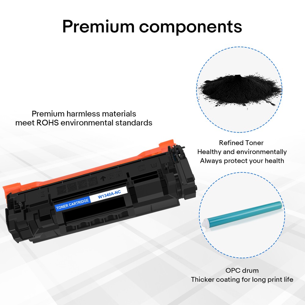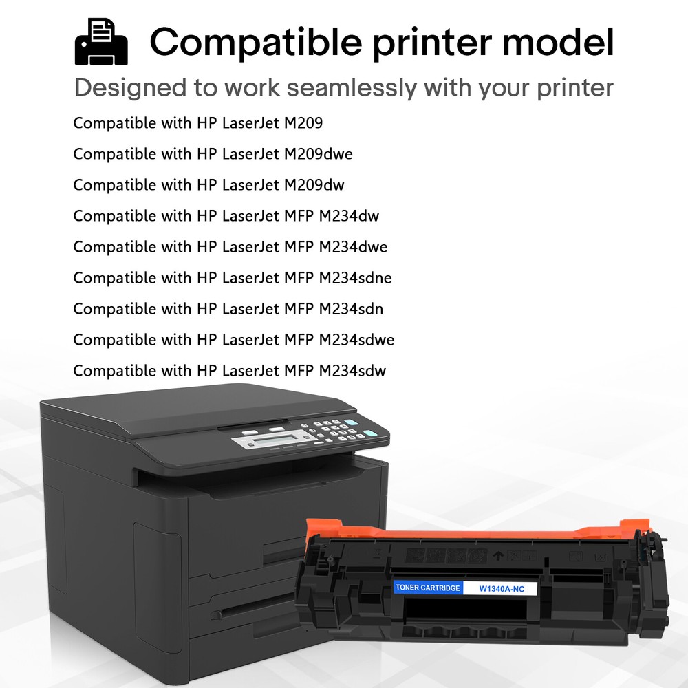 Condition: New It is certified with ISO 9001 and ISO 14001 Item:Premium Compatible with HP W1340A 134A Toner Cartridge Model:W1340A (NO Chip) Color:Black Shelf Life:3 Years Printed Pages:1,100 pages at 5% coverage (Actual toner yield varies with usage, graphics printed and environmental conditions.) Compatible printer list: HP LaserJet M209 HP LaserJet M209dwe HP LaserJet M209dw HP LaserJet MFP M234dw HP LaserJet MFP M234dwe HP LaserJet MFP M234sdne HP LaserJet MFP M234sdn HP LaserJet MFP M234sdwe HP LaserJet MFP M234sdw W1340A No Chip Toner Compatible with HP 134A LaserJet M209 dw M234 M234sdne LOT Model W1340A ( without chip ) Color Black Page Yield 1,100 pages at 5% Coverage (4A Paper) Warranty 1 Year Condition Brand New *Please make sure you still keep the chip of the original toner cartridge before purchasing our compatible product.Please install the original chips into out toner cartridges. Compatible with Printers Listed Below: HP LaserJet M209 HP LaserJet M209dwe HP LaserJet M209dw HP LaserJet MFP M234dw HP LaserJet MFP M234dwe HP LaserJet MFP M234sdne HP LaserJet MFP M234sdn HP LaserJet MFP M234sdwe HP LaserJet MFP M234sdw How to install the chip? 1.Cut off the stopper with a cutting knife. 2.Remove the chip with tweezers from the empty OEM cartridge. 3.Insert the chip into the chip slot of our cartridge. 4.Push the chip down to the end of the right side. Fast and Safe Shipping Reliability on the Move, Safety in Transportation. Print Effects Clear / Sharp / Vivid At Your Service Anytime Available to help you anytime. Please contact us through eBay messages.