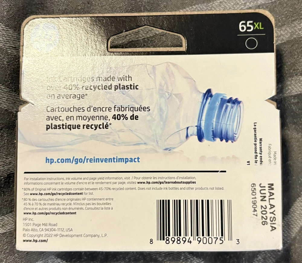 This HP 65XL High Yield Black Ink Cartridge is a genuine OEM original product that is compatible with HP Officejet Pro 8600, 8710, and Ho Envy models. The ink cartridge is designed for inkjet technology and has a print color of black. It has a long expiration date of May 2026 and comes with a manufacturer warranty of 2 years. The HP 65XL High Yield Black Ink Cartridge is a perfect replacement for your printing needs. It is made in Malaysia and is compatible with HP printers. The cartridge is designed to provide high-quality prints and is ideal for everyday printing needs.