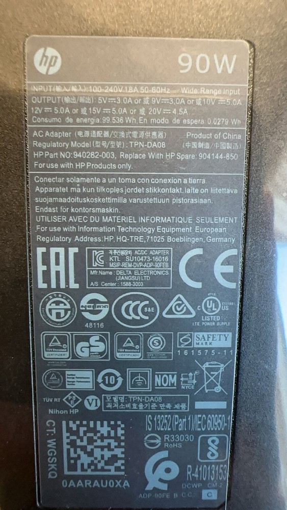 Fast Charger: This AC adapter provides a maximum power output of 90W, and supports a wide range of input and output voltages (100-240V 50-60Hz, 5V-3A/9V-3A/10V-5A/12V-5A/15V-5A/20V-4.5A),Can help computer fast charger Compatible P/N: 904082-003, TPN-DA08, 904144-850, L45440-003, 2LN85AA#ABA, 2LN85AA, ADP-90FE Compatible with :Spectre 15-bl000 15-bl100 x360 Convertible PC Elitebook x360 1040 G5 HP EliteBook 1040 G4 Compatible P/N: 904082-003, TPN-DA08, 904144-850, L45440-003, 2LN85AA#ABA, 2LN85AA, ADP-90FE Package include: 1 x AC Adapter, 1 x Power Cord Compatible with HP Laptop/Notebook model: HP Spectre X360 15-BL000 15T-BL000 15T-BL100 Series: 15-BL0XXHH 15-BL000NG15-BL030NG 15-BL031NGHH 15-BL050SA 15-BL051NAHH 15-BL051SA 15-BL075NR 15-BL0XX 15-BL1XX 15-BL010CA 15-BL012DX 15-BL018CA 15-BL062NR 15-BL108CA 15-BL112DX 15T-BL101NG. HP Spectre X360 15-CH000 15T-CH000 Series: 15-CH0XX 15-CH011DX 15-CH010TX 15-CH003UR 15-CH010ND 15-CH006NA 15-CH001NG 15-CH001NO 15-CH006TX 15-CH060NZ 15-CH015NR 15-CH 2018 15-CH004NF 15-CH012NR 15-CH011TX 15-CH003NG 15-CH002NC. HP EliteBook 745 G6 Notebook PC;HP EliteBook 745 G5 Notebook PC;HP EliteBook 755 G5 Notebook PC;HP EliteBook 840r G4 Notebook PC; HP EliteBook 830 G5 Notebook PC;HP EliteBook 735 G6 Notebook PC;HP EliteBook 735 G5 Notebook PC;HP ZBook 14u G5 Mobile Workstation; HP ZBook 15u G5 Mobile Workstation;HP Chromebook 14 G5;HP Chromebook 11 G6 EE;HP Chromebook x360 11 G1 EE;HP Chromebook 13 G1 EE ;HP Spectre X360 13 14 15 Series. HP ProBook 445 G6 Notebook PC; HP ProBook 445R G6 Notebook PC; HP ProBook 450 G5 G6 Notebook PC; HP ProBook 455 G5 G6 455R G6 Notebook PC;HP ProBook