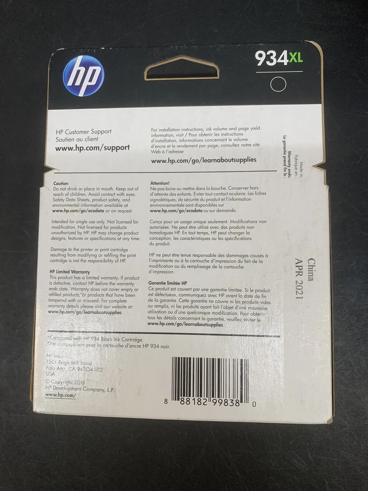 Type:Genuine/OriginalModel:HP 934XLUPC:888182998380gtin13:888182998380Color:BlackCountry/Region of Manufacture:UnknownBrand:HPMPN:C2P23ANExpiration Date:April 2021Compatible Model:For HP Officejet 6812, HP Officejet Pro 6230Print Technology:InkjetCompatible Brand:For HP