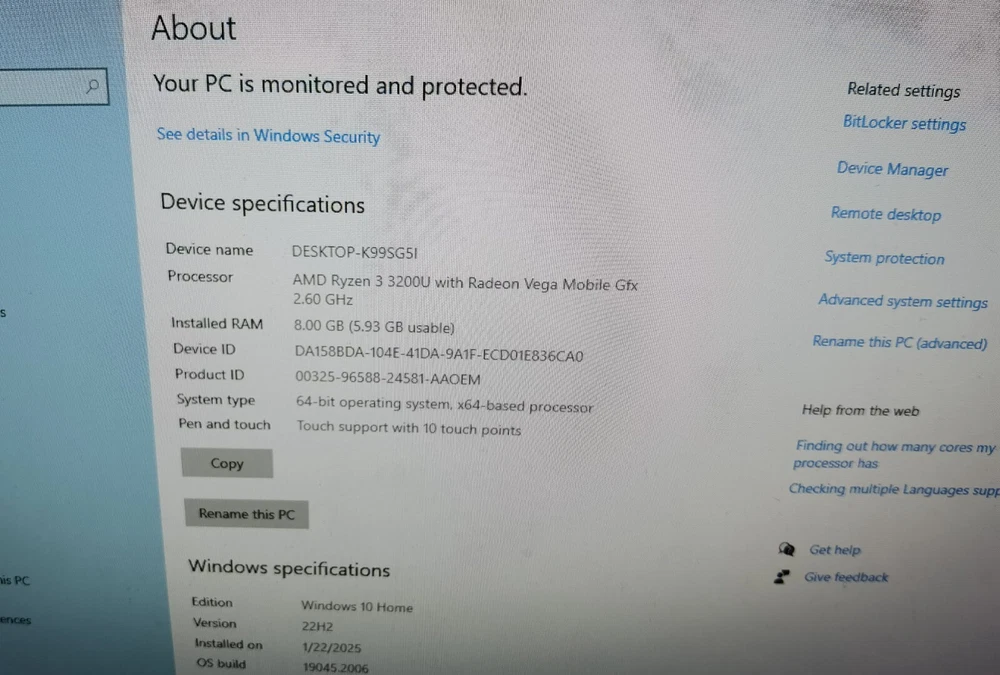 HP All-In-One Touchscreen 24-f1047c Ryzen 3 3200U 2.60GHz 8GB RAM 1TB HD Win 10 Pro Office 2007 Good condition HP AIO 24 Touch . AMD Ryzen 3 3200U 2.60GHz AMD Radeon R3 Graphics 8Gb DDR4 Ram 1TB SATA HDD 23.8" diagonal FHD IPS WLED-backlit micro-edge touch screen (1920 x 1080) Wifi Bluetooth Integrated 10/100/1000 GbE LAN 802.11a/b/g/n/ac (2x2) and Bluetooth 4.2 combo Windows 10 home activated with factory license. MS Office 2007 (word, Excel, outlook..) With a HP ac adapter, and a set of USB-Lenovo mouse keyboard.