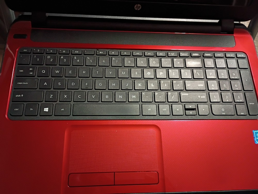 HP Pavilion 15 laptop in red finish. Unit is functional and has been factory reset. Runs and boots normally. Cosmetic condition is good with some light scratches on the exterior. Screen appears undamaged. Internal specifications and battery condition cannot be verified.