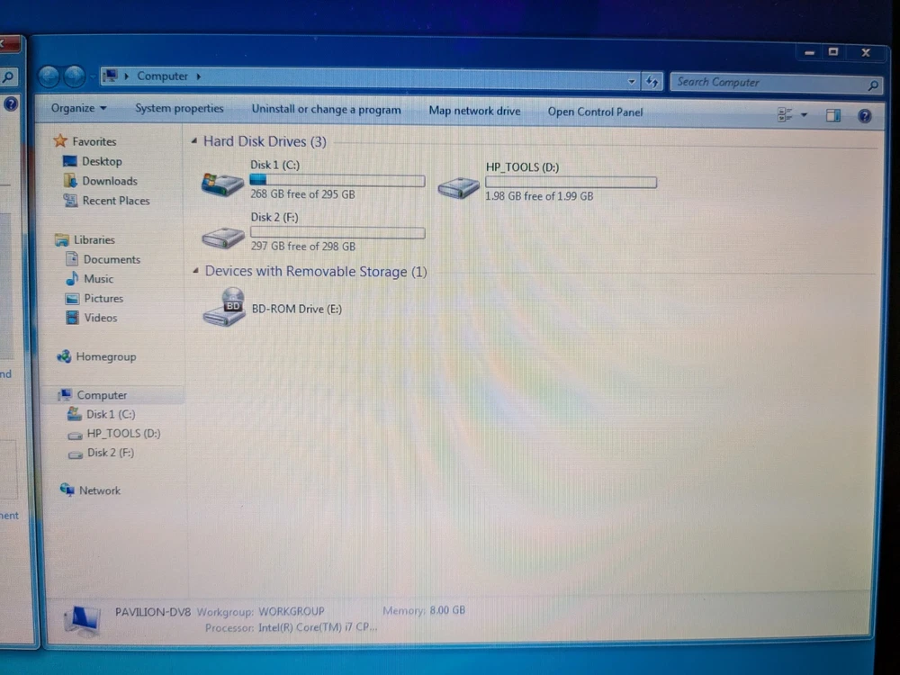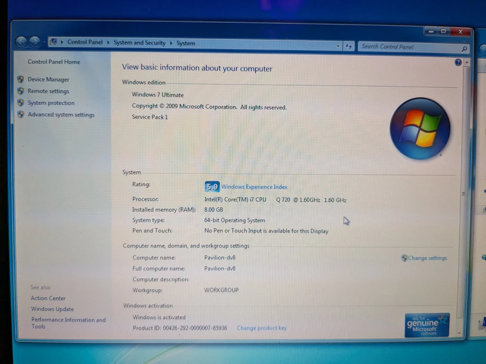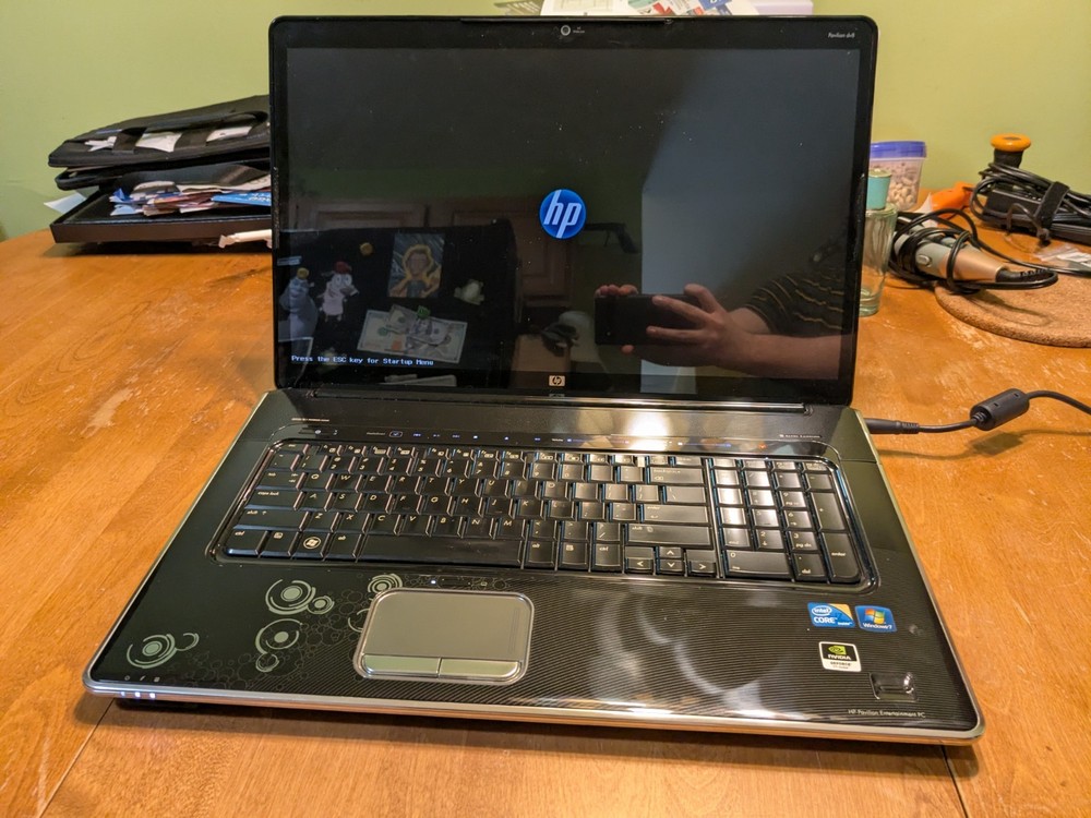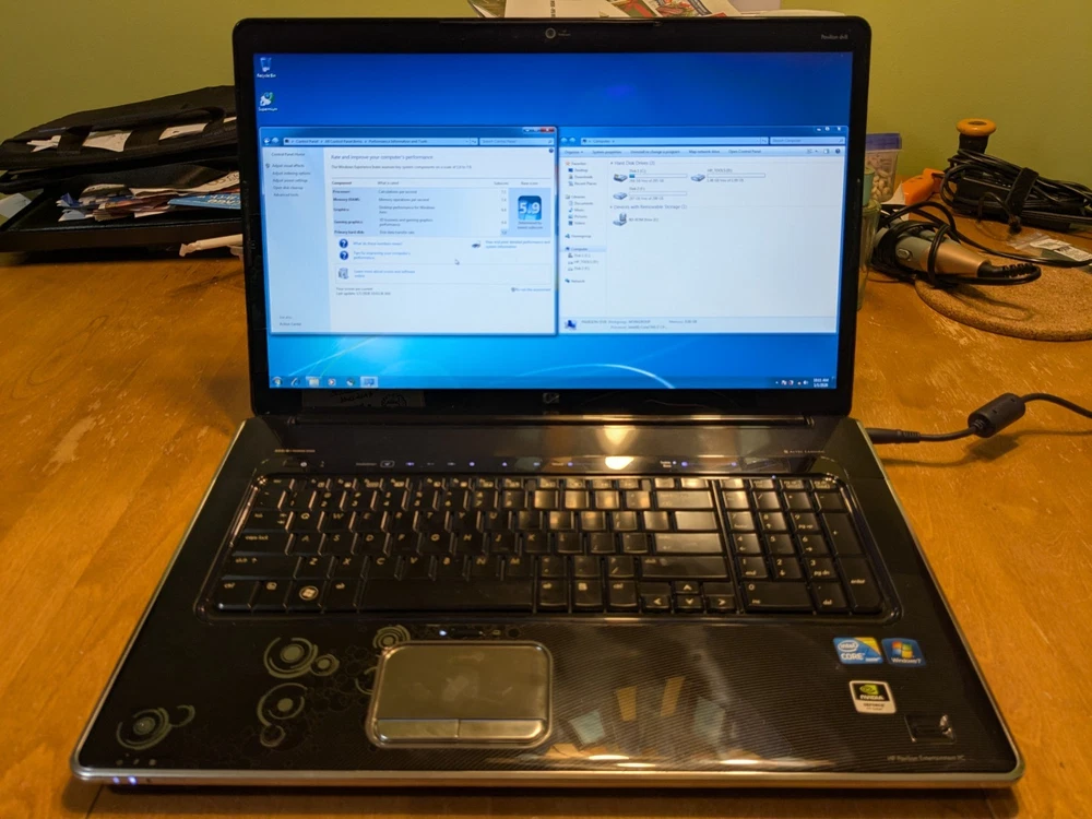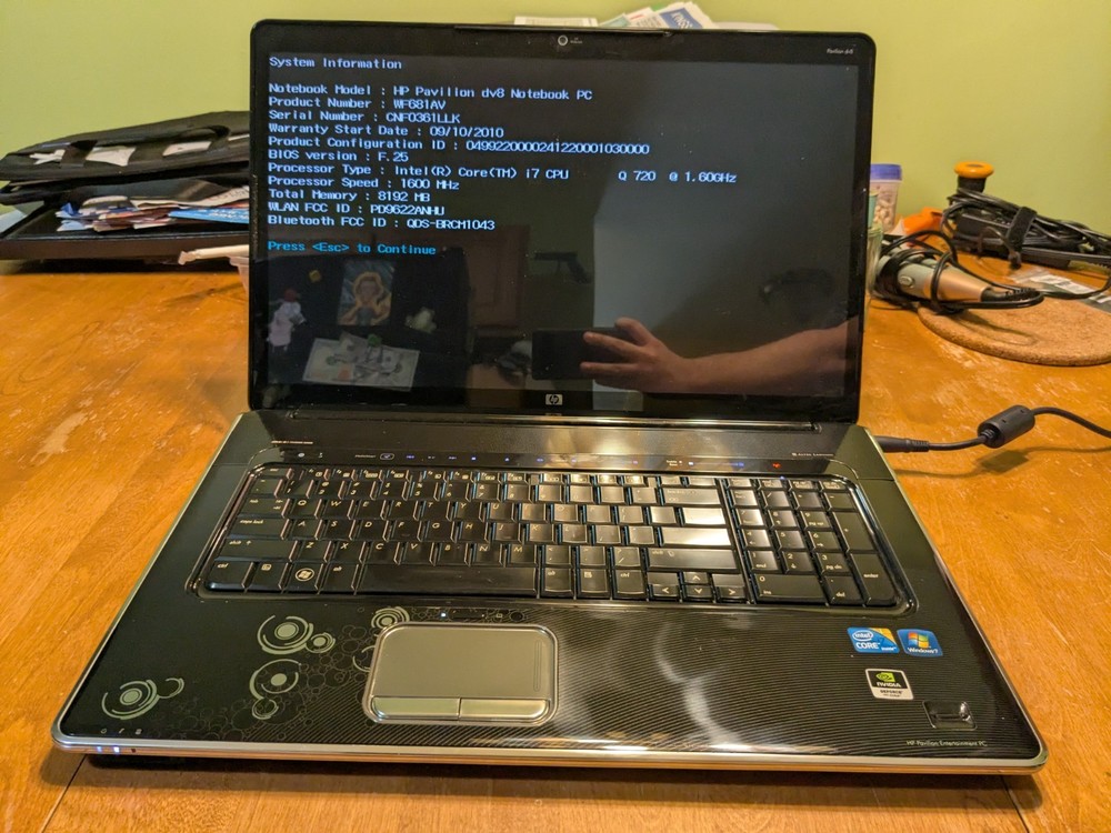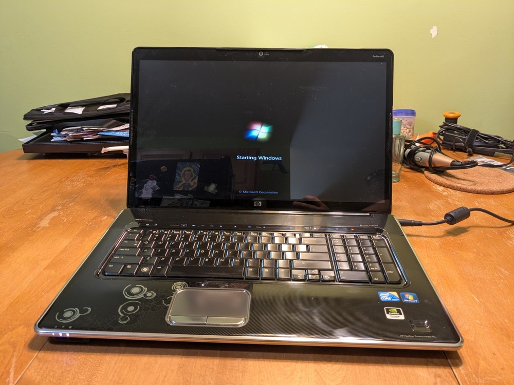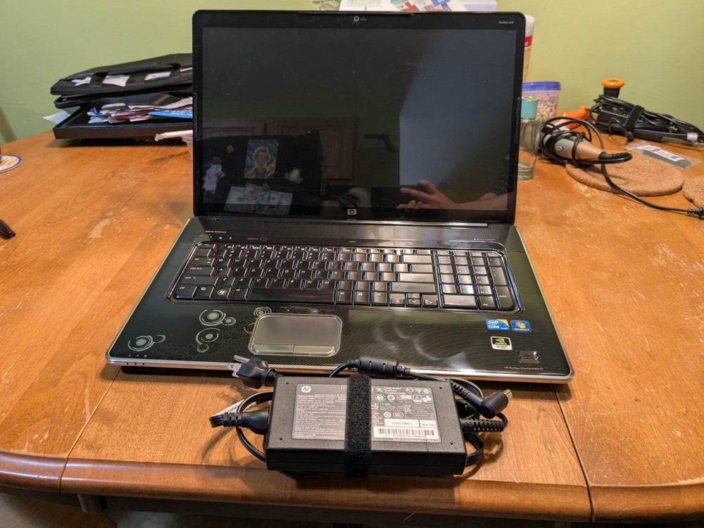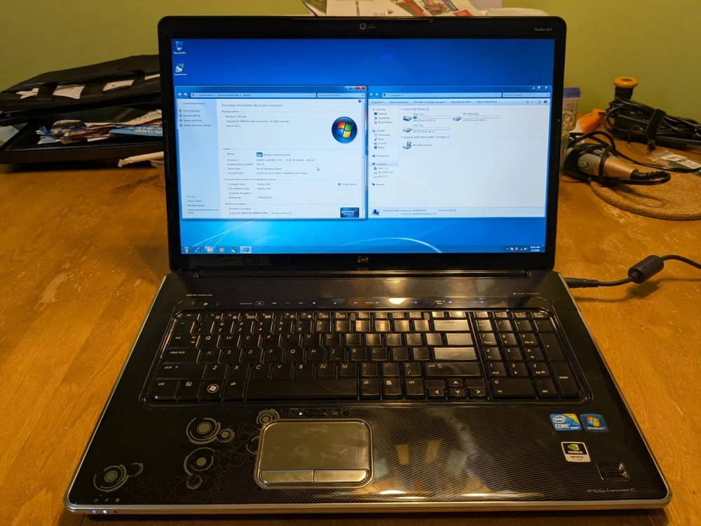 Working HP Pavilion dv8 Multimedia laptop from 2010 - a beast from its day in both size and performance. This computer is still decently capable today if you were to install an SSD and a modern operating system, however, this laptop is best enjoyed as a late 2000's and early 2010's multimedia machine. System Specs CPU - Intel Core i7-720QM 1.6GHz (4 Cores, 8 Threads) RAM - 8GB DDR3 1333MT/s (2x4GB) Hard Drives - Dual 320GB Seagate 7200rpm Graphics - Nvidia GeForce GT 230M 1GB Screen - 18.4" 1920x1080 Operating System - Windows 7 Ultimate SP1 with Convenience Update Battery - Main battery does not work, but the reserve (CMOS) battery is still good. Disc Drive : Blu-ray/DVD-RW (perfectly working) Comes with an original HP 120W charger.