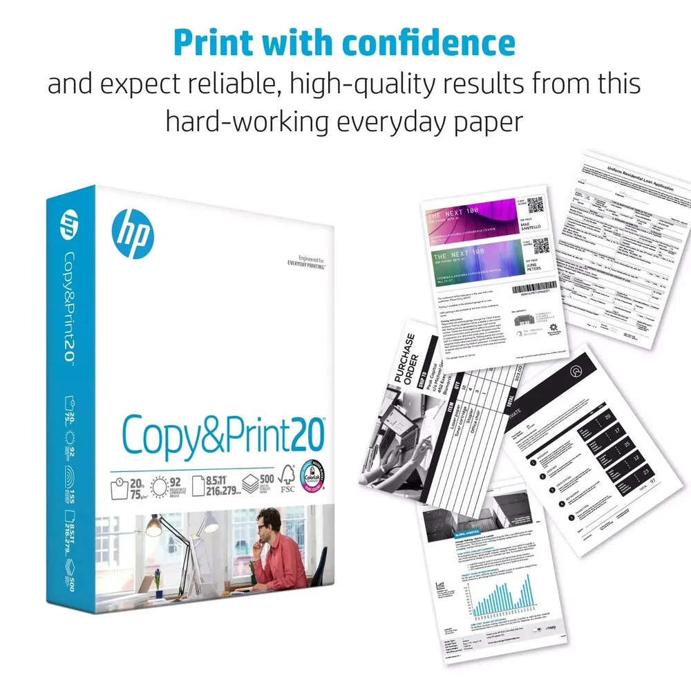 Item description from the seller HP Copy & Print20, 20lb, 8.5 x 11, 1 Ream (500 Sheets) Description: Papers is a premium line of uncoated printing paper optimized to provide superior print paper performance. Paper is a 20 lb., super smooth economical and multipurpose paper for everyday printing at home, at school and in the office. It's ultra white shade (92 bright, 155 whiteness) and Color Lok Technology provides brighter colors and bolder blacks for reports, school work and all general printing needs. Specification: Paper size: 8.5" x 11" letter size paper Print and copier paper prevents yellowing over time to ensure a long-lasting appearance for added archival quality Paper is Forest Stewardship Council (FSC) certified Quantity: 500 sheets Technical Details Manufacturer Sylvamo Brand HP Papers Item Weight 5 pounds Product Dimensions 11 x 8.5 x 2 inches Item model number 200060 Is Discontinued By Manufacturer No Color White Material Type paper Number of Items 1 Size 1 Pack | 500 Sheets Sheet Size 8.5 x 11 inches Brightness Rating 92 Paper Weight 20 Paper Finish Matte Manufacturer Part Number 200060 About this item HP Papers is sourced from renewable forest resources and has achieved production with 0% deforestation in North America. Each ream is wrapped in a polyurethane coated paper wrapper to protect the cut sheets from moisture damage Sheet size – 8.5 x 11; Thickness – 20 pounds; Brightness – 92 bright white HP Copy&Print20 20 pounds printer paper is Forest Stewardship Council (FSC) certified and contributes toward satisfying credit MR1 under LEED (Leadership in Energy and Environmental Design) All HP Papers provide premium performance on HP equipment, as well as on all other printer and copier equipment; 100% satisfaction guaranteed; ColorLok technology provides more vivid colors, bolder blacks and faster drying Superior quality, reliability, and dependability for high-volume printing at home, at school and in the office; HP Copy&Print20 print and copy paper prevents yellowing over time to ensure a long-lasting appearance for added archival quality
