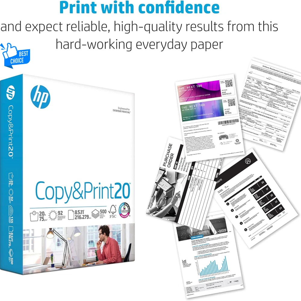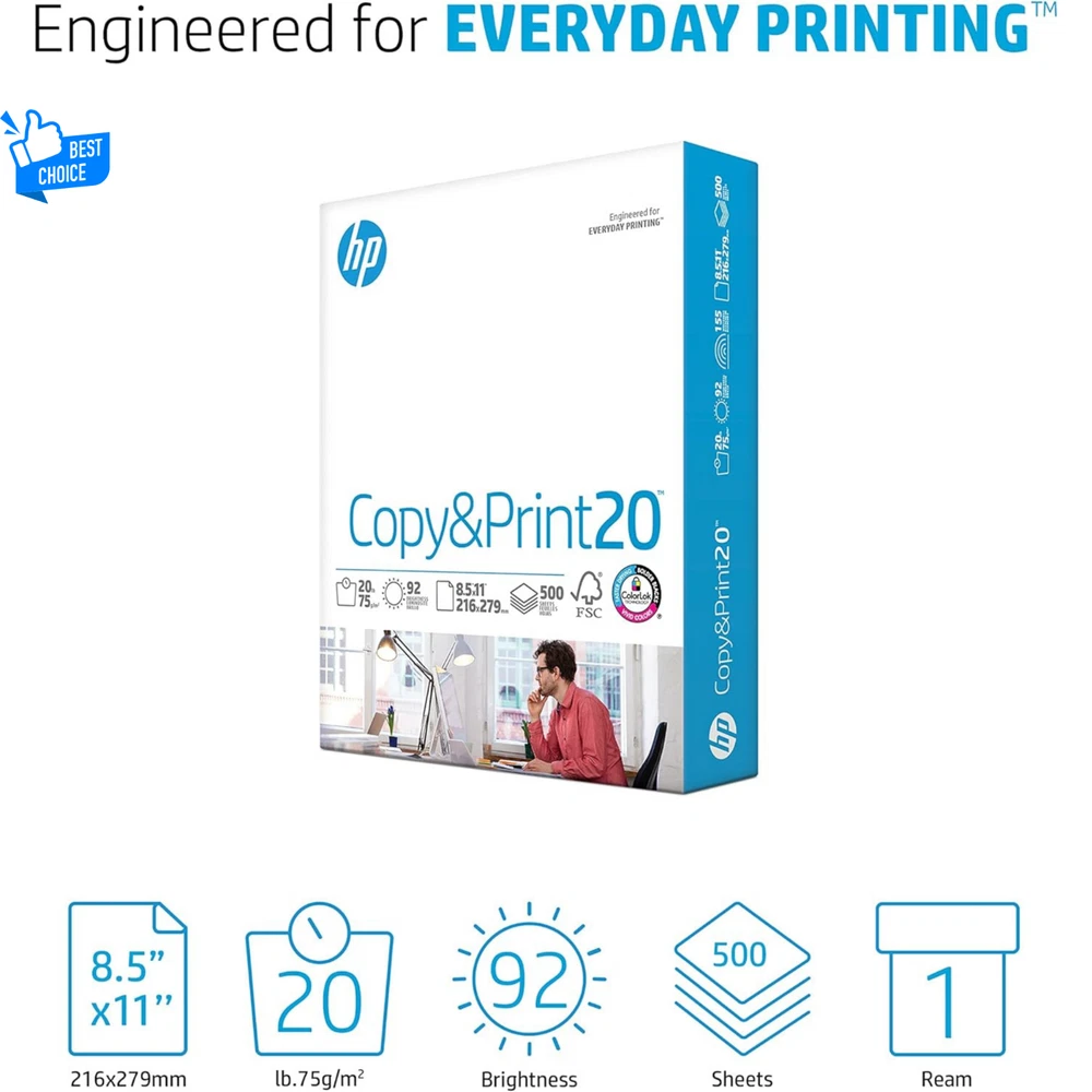 HP Printer Paper | 8.5 x 11 Paper | Copy &Print 20 lb | 1 Ream Case - 500 Sheets| 92 Bright | Made in USA - FSC Certified | 200060 Brand HP Papers Color White Item Weight 5 Pounds Paper Finish Matte Sheet Size 8.5 x 11 inches About this item HP Papers is sourced from renewable forest resources and has achieved production with 0% deforestation in North America. Each ream is wrapped in a polyurethane coated paper wrapper to protect the cut sheets from moisture damage Sheet size – 8.5 x 11; Thickness – 20 pounds; Brightness – 92 bright white HP Copy&Print20 20 pounds printer paper is Forest Stewardship Council (FSC) certified and contributes toward satisfying credit MR1 under LEED (Leadership in Energy and Environmental Design) All HP Papers provide premium performance on HP equipment, as well as on all other printer and copier equipment; 100% satisfaction guaranteed; ColorLok technology provides more vivid colors, bolder blacks and faster drying Superior quality, reliability, and dependability for high-volume printing at home, at school and in the office; HP Copy&Print20 print and copy paper prevents yellowing over time to ensure a long-lasting appearance for added archival quality Sheet Count 500 Item Dimensions L x W 11"L x 8.5"W Paper Weight 20 Paper Size 8.5 x 11 inches Item Weight 5 Pounds Paper Finish Matte Color White Material Features Renewable Brightness 92 Product Description HP Papers is a premium line of uncoated printing paper optimized to provide superior print paper performance when used with HP hardware and supplies and in all other makes and models of printing and copying equipment. Launched in 1996, HP Papers are manufactured and marketed exclusively worldwide in over 75 countries by Sylvamo, a globally recognized leader in paper products, under license from the Hewlett-Packard Company. With a diverse range of products designed to support a wide range of print applications, from everyday copies to full-color presentations, you can be assured of consistent, high-quality print performance every time. HP Copy&Print20 Paper is a 20 lb, super smooth, economical and multipurpose paper for everyday printing at home, at school and in the office. HP Copy&Print20 offers HP quality and reliability at a great value. Its ultra-white shade (92 bright, 155 whiteness) and ColorLok Technology provides brighter colors and bolder blacks for reports, school work and all general printing needs. HP Copy&Print20 printer paper is available in 8.5 x 11 letter size paper.