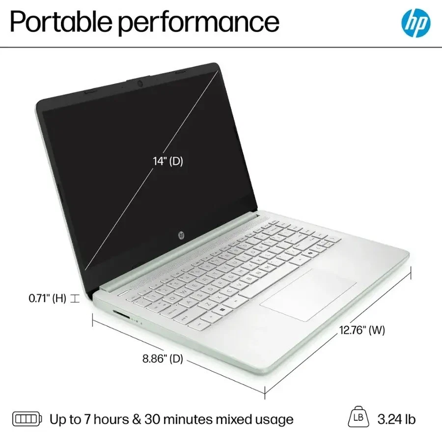 Newly Upgraded HP 14-dq6013dx Laptop, 14 inches Intel Processor N150 , 4-core(quad-core), up to 3.6GHz, L3 Cache 6 megabytes , Intel Integrated Graphics, LED 14" Anti-glare 250Nits HD (1366×768), 4GB|8GB|16GB DDR4 RAM 128GB UFS, Willon Green , Windows 11 Pro in S Mode Hurry and seize the opportunity to own our high-performance laptop at an unbeatable price! As we make room for exciting new products, we're offering our best price ever on this remarkable device. Don't miss out - purchase yours before it's gone! Fast Shipping / Free Shipping within 48 Contiguous States Product Overview Windows 11 OS Experience the most secure Windows ever built. With fast boot times, increased responsiveness, and added protection against phishing and malicious software, applications run more smoothly. Microsoft Copilot Do more with AI as your personal assistant. Kickstart new projects with relevant answers, simplified solutions, and helpful advice. Copilot in Windows 11 is ready to support you whenever and wherever you need it. Intel Processor N150 Save time and increase productivity with powerful performance and smooth multitasking. Access fast web applications, edit photos and videos, and get the responsiveness you're looking for. Intel graphics Enjoy vivid and immersive visuals in creative applications and gaming. 14-in HD Display Watch videos and create colorful presentations in excellent, high-definition quality rendered with 1 million pixels. The anti-glare panel lets you enjoy time outside without glare on your screen. Sleek design Easily take this thin and light PC from room to room or on the road. Screen to body ratio Revolutionize your display and see more of what you love with this slim bezel design. Enjoy an immersive multimedia experience with a maximized viewing area. HP Fast Charge Go from 0 to 50% charge in approximately 45 minutes. Choose your upgrades We specialize in providing professional upgrades and customization for computers. Note that if you opt for customization of your computer from the aforementioned list, our engineers will open the manufacturer's box to install upgrades and test the system. Upgrade Memory for Multi-tasking : 4GB|8GB|16GB RAM Upgrade SSD for Storage and Speed : 128GB UFS Specifications Quick Info Key Specs Screen Size 14 inches Screen Resolution 1366 x 768 (HD) Touch Screen No Brightness 250 nits Processor Model Intel Processor N150 Storage Type UFS Total Storage Capacity 128 gigabytes System Memory (RAM) 4 / 8 / 16 gigabytes Graphics Intel Graphics Display Connector(s) 1 x HDMI 1.4 Battery Life (up to) 11 hours Battery Chemistry Lithium-ion 2-in-1 Design No Backlit Keyboard No General Brand HP Model Number 14-dq6013dx Color Willow Green Year of Release 2025 Display Display Type LED Screen Size 14 inches Screen Resolution 1366 x 768 (HD) Touch Screen No Display Surface Anti-glare Brightness 250 nits Color Gamut (Standard RGB) 62.5 percent Processor Processor Brand Intel Processor Model Intel Processor N150 Processor Model Number N150 CPU Boost Clock Frequency 3.6 gigahertz Number of CPU Cores 4-core (quad-core) CPU Cache Memory Level L3 L3 Cache 6 megabytes Storage Storage Type UFS Total Storage Capacity 128 gigabytes Memory System Memory (RAM) 4 / 8 / 16 gigabytes Type of Memory (RAM) DDR4 System Memory RAM Speed 3200 megahertz Graphics Graphics Type Integrated GPU Brand Intel Graphics Intel Graphics Compatibility Operating System Windows 11 Pro in S Mode Connectivity Display Connector(s) 1 x HDMI 1.4 Number of HDMI Outputs (Total) 1 Number of Thunderbolt Ports (Total) 0 USB Ports 1 x USB-C 3.1, 2 x USB-A 3.0 Number of USB Ports (Total) 3 Headphone Jack Yes Microphone Input Yes Wireless Connectivity Bluetooth, Wi-Fi Wireless Networking Standard Wi-Fi 6 Number Of Ethernet Ports 0 Cooling CPU Cooling System Air Power Power Supply Maximum Wattage 45 watts Battery Life (up to) 11 hours Battery Cells 3-cell Battery Chemistry Lithium-ion Camera Front-Facing Camera Yes Front Facing Camera Video Resolution 720p Built-In Microphone Yes Features 2-in-1 Design No Backlit Keyboard No Touchpad Type Multi-touch Media Card Reader Yes Media Card Slot MultiMediaCard (MMC) Audio Technology HD Audio Speaker Type Stereo Dimensions Product Height 0.71 inches Product Width 12.76 inches Product Depth 8.86 inches Product Weight 3.24 pounds Certifications Listings & Approvals ENERGY STAR Certified Yes EPEAT Qualified Yes EPEAT Level Gold Included Included Software HP Support Assistant, myHP, HP BIOS Protection, and more. Optical Drive Type None Numeric Keypad No Warranty Warranty 1 year Other UPC 198990456935 We can be contacted at any time through eBay messages if you have any questions, comments or product requests. We will respond to you within 24 hours and do our best to help you out! We encourage our customers to contact us with any questions or concerns! We'd like to be sure you are completely satisfied with your purchase.