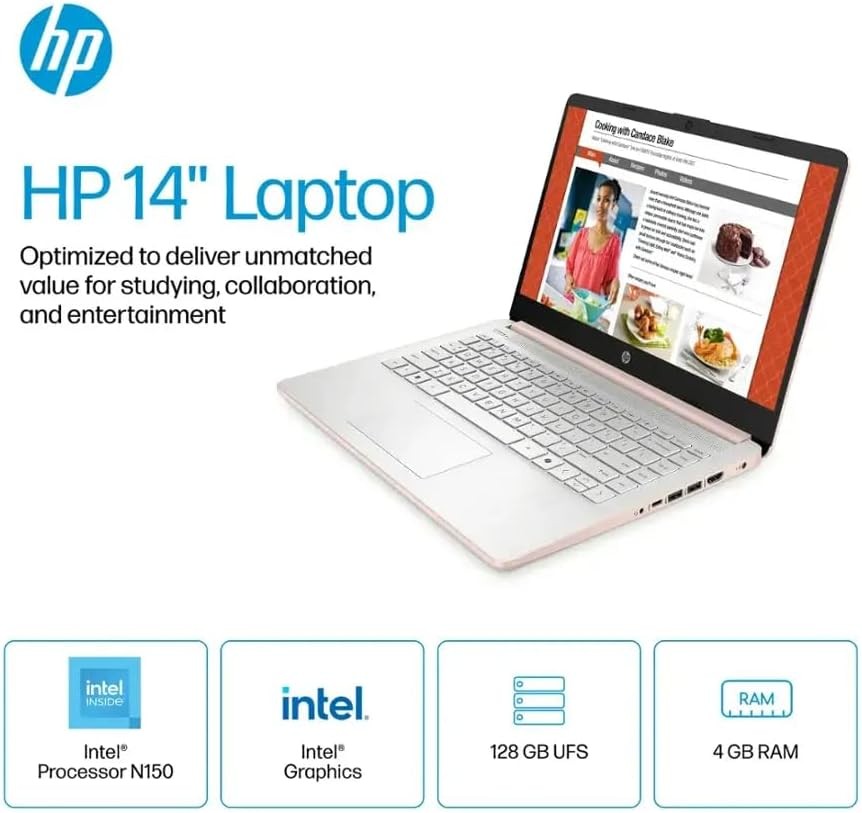 Newly Upgraded HP Laptop 14-dq6015dx, 14 inches Intel Processor N150 (up to 3.6 GHz, 4 cores, 4 threads) + Intel® Graphics - 14 in LED - HD(1366 x 768), Anti- Glare, 250 nits, 4GB|8GB|16GB DDR4 RAM 128GB UFS Wi-Fi 6 and Bluetooth - up to 11 hours - Windows 11 Home in S Mode Hurry and seize the opportunity to own our high-performance laptop at an unbeatable price! As we make room for exciting new products, we're offering our best price ever on this remarkable device. Don't miss out - purchase yours before it's gone! Fast Shipping / Free Shipping within 48 Contiguous States Product Overview Windows 11 OS Experience the most secure Windows ever built. With fast boot times, increased responsiveness, and added protection against phishing and malicious software, applications run more smoothly. Microsoft Copilot Do more with AI as your personal assistant. Kickstart new projects with relevant answers, simplified solutions, and helpful advice. Copilot in Windows 11 is ready to support you whenever and wherever you need it. Intel Processor N150 Save time and increase productivity with powerful performance and smooth multitasking. Access fast web applications, edit photos and videos, and get the responsiveness you're looking for. Intel graphics Enjoy vivid and immersive visuals in creative applications and gaming. 4GB|8GB|16GB DDR4 Memory (RAM) DDR4 RAM efficiently accesses and processes your data, while reducing data corruption. 128GB Universal Flash Storage Non-volatile storage handles multiple read and write requests simultaneously. Power gating increases power efficiency. Micro-edge display With virtually no bezel encircling the display, an ultra-wide viewing experience provides for seamless multi-monitor set-ups. 14-in HD Display Watch videos and create colorful presentations in excellent, high-definition quality rendered with 1 million pixels. The anti-glare panel lets you enjoy time outside without glare on your screen. Sleek design Easily take this thin and light PC from room to room or on the road. Choose your upgrades We specialize in providing professional upgrades and customization for computers. Note that if you opt for customization of your computer from the aforementioned list, our engineers will open the manufacturer's box to install upgrades and test the system. Upgrade Memory for Multi-tasking : 4GB|8GB|16GB RAM Upgrade SSD for Storage and Speed : 128eMMC Specifications Quick Info Specifications Brand: HP Model Number: 14-dq6015dx Color: Pale Rose Gold Display Type: LED Screen Size: 14 inches Screen Resolution: 1366 x 768 (HD) Touch Screen: false Display Surface: Anti-glare Brightness: 250 nits Color Gamut (Standard RGB): 62.5 percent Processor Brand: Intel Processor Model: Intel Processor N150 Processor Model Number: N150 CPU Boost Clock Frequency: 3.6 gigahertz Number of CPU Cores: 4-core (quad-core) CPU Cache Memory Level: L3 L3 Cache: 6 megabytes Storage Type: UFS Total Storage Capacity: 128 gigabytes System Memory (RAM): 4GB|8GB|16GB Type of Memory (RAM): DDR4 System Memory RAM Speed: 3200 megahertz Graphics Type: Integrated GPU Brand: Intel Graphics: Intel Graphics Operating System: Windows 11 Home in S Mode Display Connector(s): 1 x HDMI 1.4 Number of HDMI Outputs (Total): 1 USB Ports: 1 x USB-C 3.1, 2 x USB-A 3.0 Number of USB Ports (Total): 3 Headphone Jack: true Microphone Input: true Wireless Connectivity: Bluetooth, Wi-Fi Wireless Networking Standard: Wi-Fi 6 Number Of Ethernet Ports: 0 CPU Cooling System: Air Power Supply Maximum Wattage: 45 watts Battery Life (up to): 11 hours Battery Cells: 3-cell Battery Chemistry: Lithium-ion Front-Facing Camera: true Front Facing Camera Video Resolution: 720p Built-In Microphone: true 2-in-1 Design: false Backlit Keyboard: false Touchpad Type: Multi-touch Media Card Reader: true Media Card Slot: MultiMediaCard (MMC) Audio Technology: HD Audio Speaker Type: Stereo Product Height: 0.71 inches Product Width: 12.76 inches Product Depth: 8.86 inches Product Weight: 3.24 pounds ENERGY STAR Certified: true EPEAT Qualified: true EPEAT Level: Gold Included Software: HP Support Assistant, myHP, HP BIOS Protection, and more. Optical Drive Type: None Numeric Keypad: false Warranty: 1 year Year of Release: 2025 We can be contacted at any time through eBay messages if you have any questions, comments or product requests. We will respond to you within 24 hours and do our best to help you out! We encourage our customers to contact us with any questions or concerns! We'd like to be sure you are completely satisfied with your purchase.