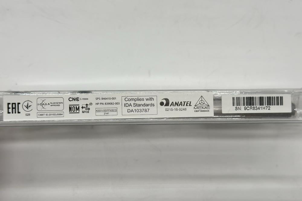 The New HP Stylus Active Pen 839082-003/846410-001 is a sleek silver stylus designed for use with HP devices. Its active design allows for precise and responsive input, making it ideal for tasks such as writing, drawing, and navigating on tablets and eBook readers. The HP branding ensures quality and compatibility with HP products, making it a reliable accessory for enhancing the user experience.