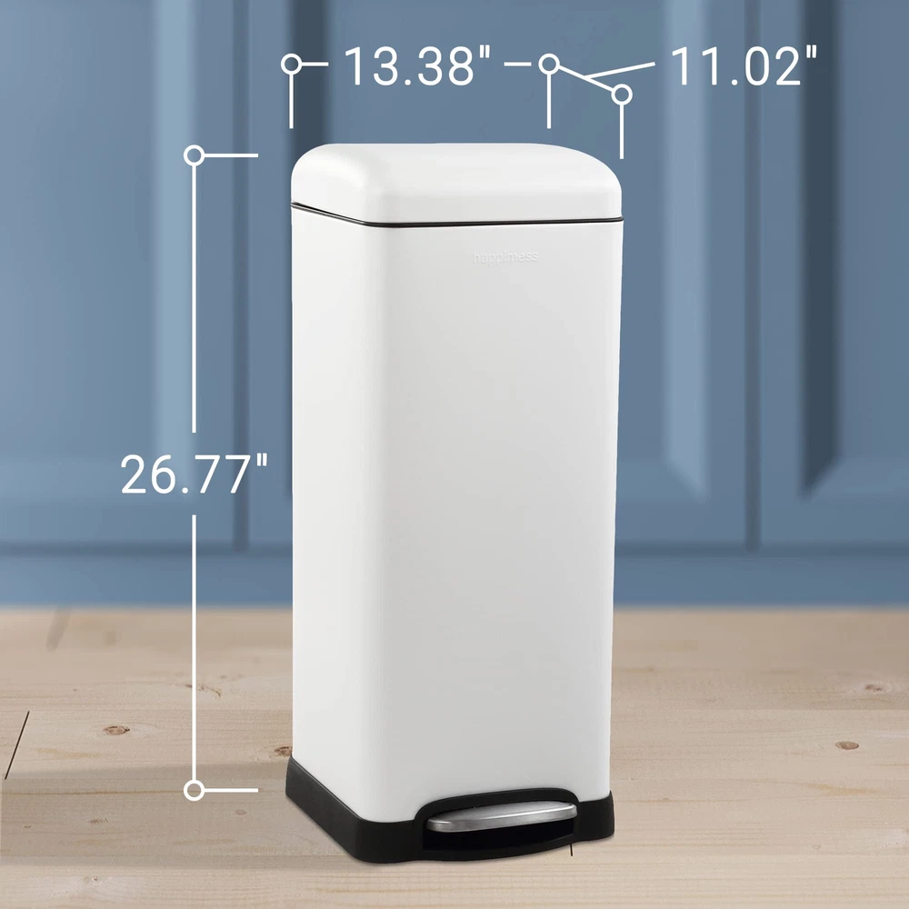 This semi-rectangular 8-gallon trash can hides plenty of capacity within its slim size, making it a great choice for home offices, craft rooms, laundry rooms and other small spaces. Featuring a profile hinge and retro silhouette -- its sleek design allows it to sit close to a wall or cabinet. Its design features don't end there -- its finished in powder-coated stainless steel, features a steel step-on mechanism that allows for smooth openings and closings (no pinched fingers!), and has a removable plastic liner that makes bag changes a cinch. STYLISH & PRACTICAL DESIGN: Trash Cans clean-lined designs blend beautifully into your existing decor; Dispose of trash hands-free with our convenient step pedal; built-in damper lowers the lid quietly, and closes it tightly to keep odors inside DURABLE AND EASY-CLEAN: We believe in form following function; Made from high-quality steel, our trash cans feature a durable, lightweight inner plastic bucket; Family-friendly, brushed stainless steel is smudge-resistant and fingerprint proof SATISFACTION GUARANTEED: Every design is created with uncompromising attention to detail, using only the highest quality components; Based in Soho, New York, designer Jonathan and his talented team create affordable high-end home decor Can hold 30 liters or 8 gallons of trash Powder-coated steel construction