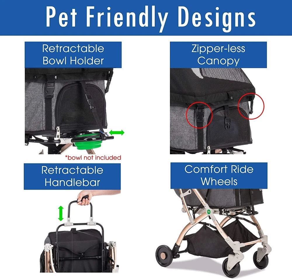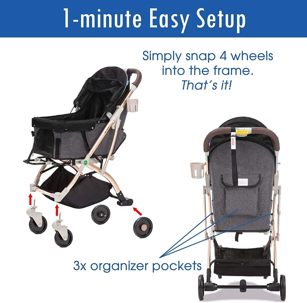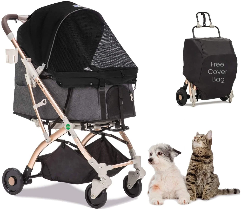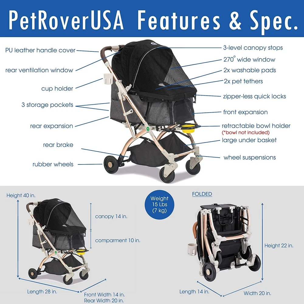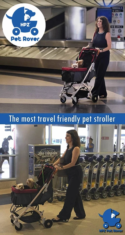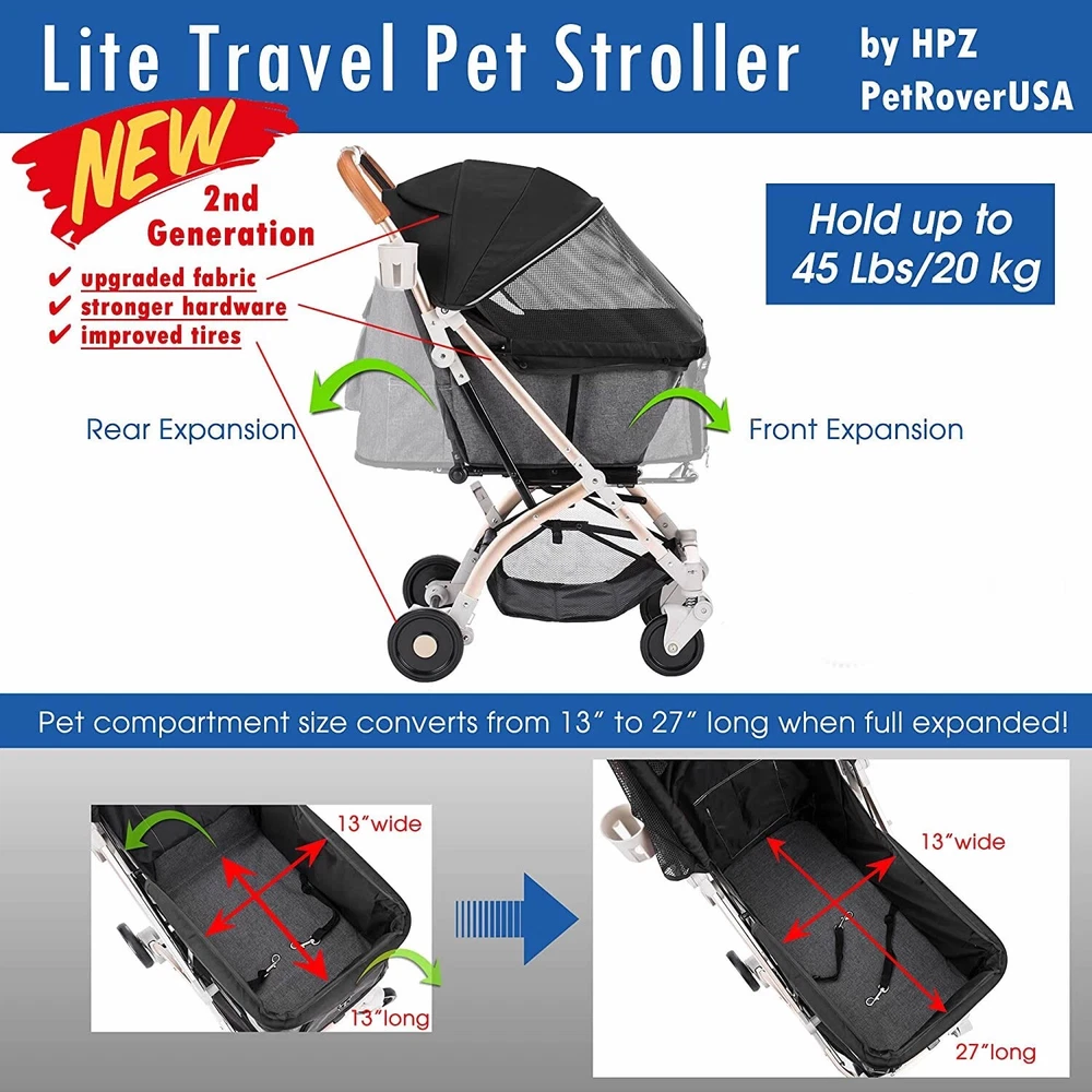HPZ PET ROVER LITE Premium Light Travel Pet Stroller For Dogs & Cats - Taupe (New Retail Price $226.86) Fully tested and refurnished by factory to ensure 100% working condition. 14 days limited functional warranty. Calling all jet setters! This premium, lightweight pet stroller was made for travel. When folded, it fits in an overhead airline bin or the trunk of a small car. It comes with a retractable towing handle and Pet Rover’s signature durability features like sturdy wheels, weather-resistant fabric, PU-leather handlebar and a rust-free, anodized gold aluminum frame. With one-hand quick fold and unfold feature, get ready for takeoff with the Pet Rover Lite Stroller. ● Product Weight: 15 Lbs ● Size: L 28" W 20" H 40" (Folded L 14" W 26" H 22") ● Pet Compartment Floor Size: Reduced L 13" W 13" / Expanded: L 27" W 13" ● No Assembly Required 2nd-Generation model features upgrade fabrics, stronger hardware and improved tires SUPER TRAVEL-FRIENDLY This premium pet stroller is small and light making traveling with your pets a breeze. Its low-profile and compact design fold into an airplane overhead-bin or store in the trunk of a small car. A retractable towing handle provides easy maneuverability. 1-HAND QUICK FOLD/UNFOLD The stroller can be folded and unfolded in just seconds with one hand only, so you can open or close it effortlessly. A FREE cover bag is included to store the stroller. EXPANDABLE PET COMPARTMENT Patented front and rear expansions allow the pet compartment to convert from 13 inch x13 inch to 13 inch x27 inch -Long, accommodating a few small pets or one medium pet up to 45 lbs. ERGONOMIC LIGHT-WEIGHT DESIGN This light-weight pet buggy is made of rust-free aluminum in anodized gold color. Front and rear canopy openings provide viewing flexibility. 2 front-wheel suspension and PU-leather handlebar made traveling with pets enjoyable. No assembly required, just snap the wheels, and it’s ready to go. PET-CENTRIC DESIGNS This premium pet stroller features a retractable meal bowl holder to feed your pets at any time, and two tethers in the basket buckle your pets in snugly. It also includes two machine-washable carrier pads and durable water-resistant fabric. Three organizer pockets and a large under-basket made traveling easy and tidy. CONDITION: Normal used item with some scratches, stains, tire wear and obvious signs of usage. These are used items sold AS-IS and are from showroom/tradeshow samples, from returns, or were photo shoot props. Product packaging and materials show signs of shipping and handling. All items sold are final sale, NO return, NO exchange and includes a limited 14 days functional warranty (exclude cosmetic defects). Please contact us if you have questions.