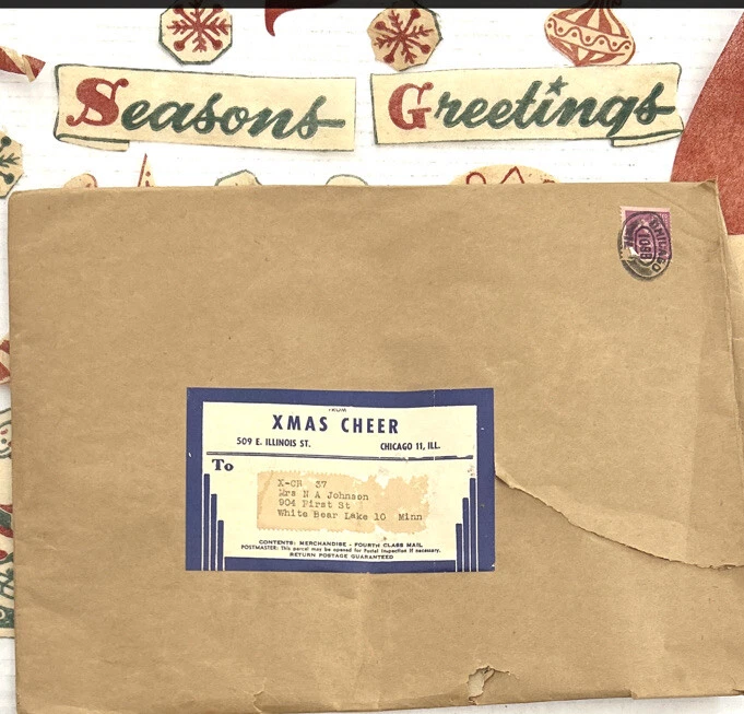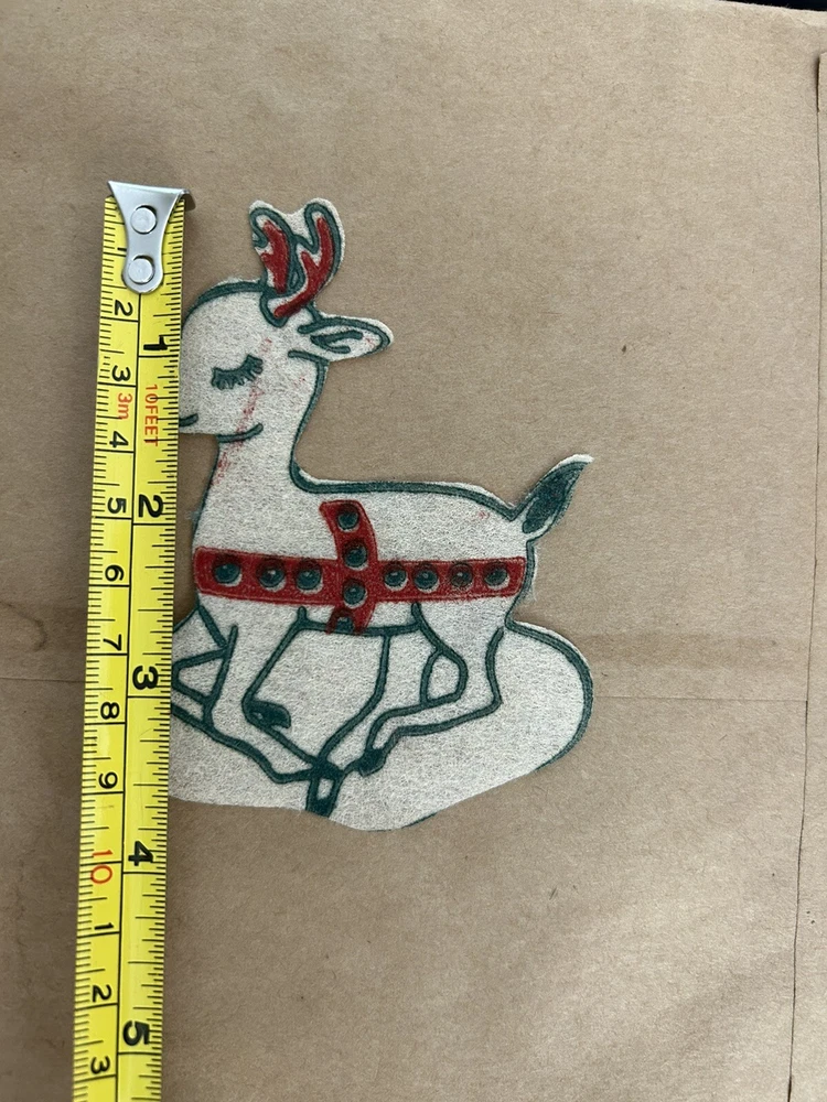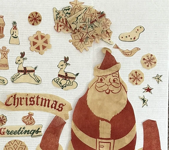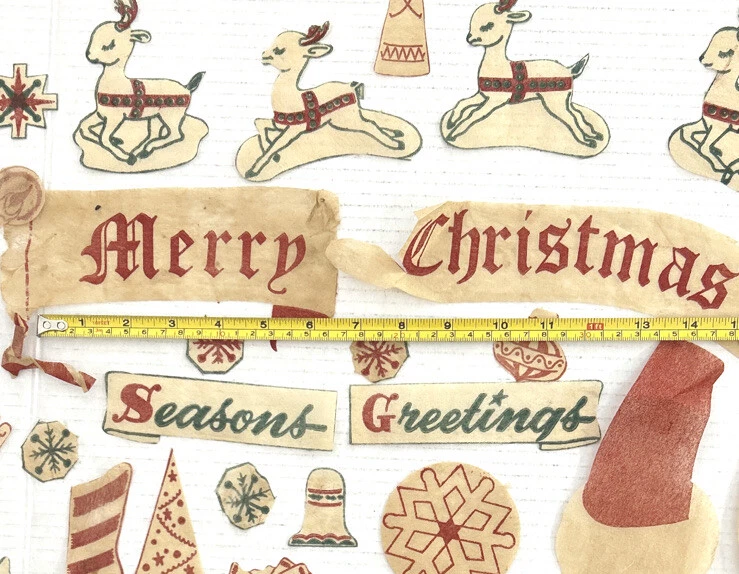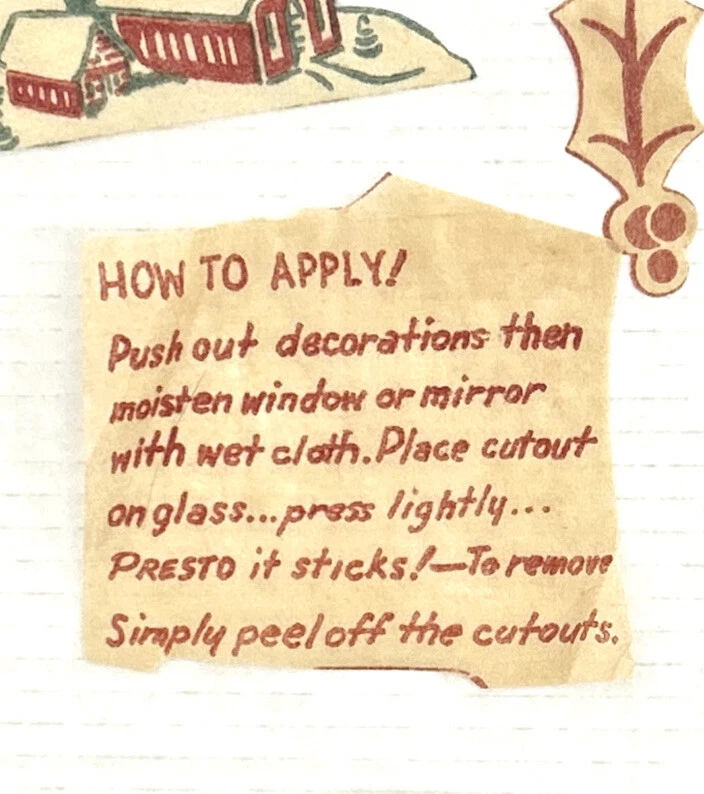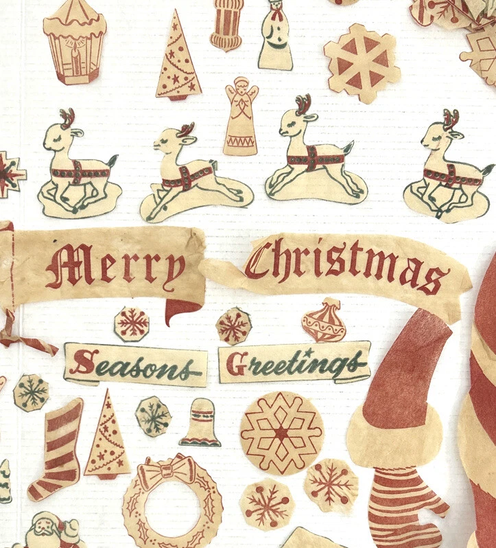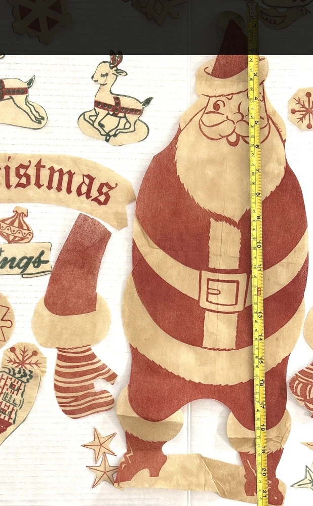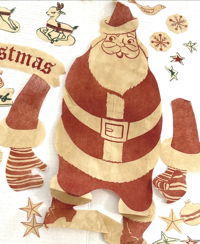 These are hard to find Vintage 1950s Christmas felt? Window Clings that include SANTA Reindeer SNOWFLAKES candles and more. There are 95 pieces. Material feels like a very thin felted fabric but we are not sure. We do know that it is intended to be removable for reuse. These are from the 1950s, so I would use great care when removing from the windows surface so as not to smashed the decorations, The original directions, which were printed in with the original pieces, are included. Cut outs are to be adhered to a window with water. The cutouts are in the original mailer from Xmas Cheer in Chicago Illinois. Mailer has a canceled four cent stamp on the front. We don’t accept returns, so please take your time deciding on the purchase. As we don’t accept returns, we don’t pay for return shipping of items. Thank you for your support of this small shop! We appreciate it.
