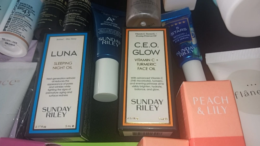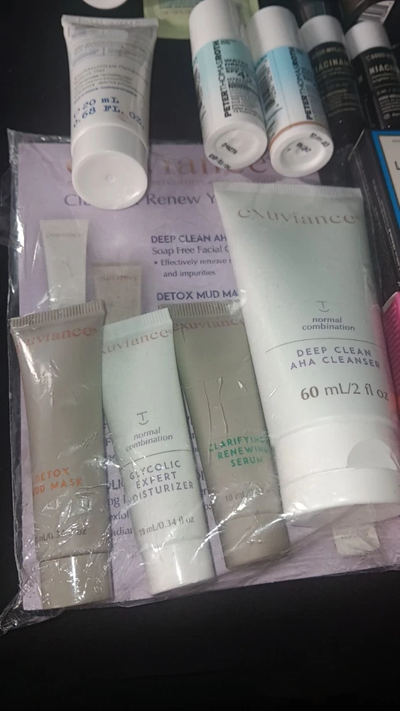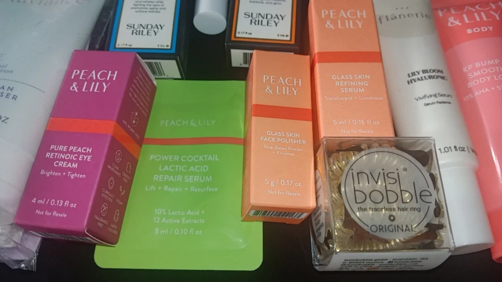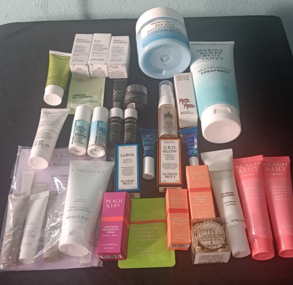 Large 40+ Piece Ulta Beauty Mixed Skincare Lot. Peach & Lily 6 piece travel size set Includes body scrub & body lotion 1.02oz each Glass skin facial polisher &refining serum .17oz each Retinoic eye cream .13 fl oz Repair serum .10 fl oz Flanerie vivifying serum 1 fl oz Exuviance travel set 4 piece set Includes Deep clean cleanser Moisturizer Detox mud mask Clarifying renewal serum Vitamins & sea beauty FULL SIZE Lotion 5oz & hydrating gel moisturizer 6oz Alo glow face mist .57 fl oz Estaté Matte Mood lipstick 3.5g La Roche- posay 4 piece travel set Face moisturizer w/sunscreen Facial gentle Cleanser Gentle cleanser oil MelaB3 Serum Belif 2 piece travel set Aqua bomb eye gel The true cream - aqua bomb Verso clarifying gel w/retinol 8 Invisibobble 3 piece hair rings Sunday riley 4 piece travel set Luna sleeping night oil CEO Glow vitamin C and turmeric face oil Retinoid+ niacinamide eye serum High dose retinoid serum Peterthomasroth water drench 2 piece set with and without sheer tint spf 45 Korres 2 piece set Probiotic gel-cream Poreless skin cream Good molecules 3 piece set 2 brightening toners 1 lightweight daily moisturizer sample Perricone MD 2 piece set Cold plasma + Sub-D Neck neck treatment Cold plasma + Sub-D Moisturizer Philosophy 3 piece set 2 Reactivating serums Eye revival serum Size small 2 piece polkadot jammie set