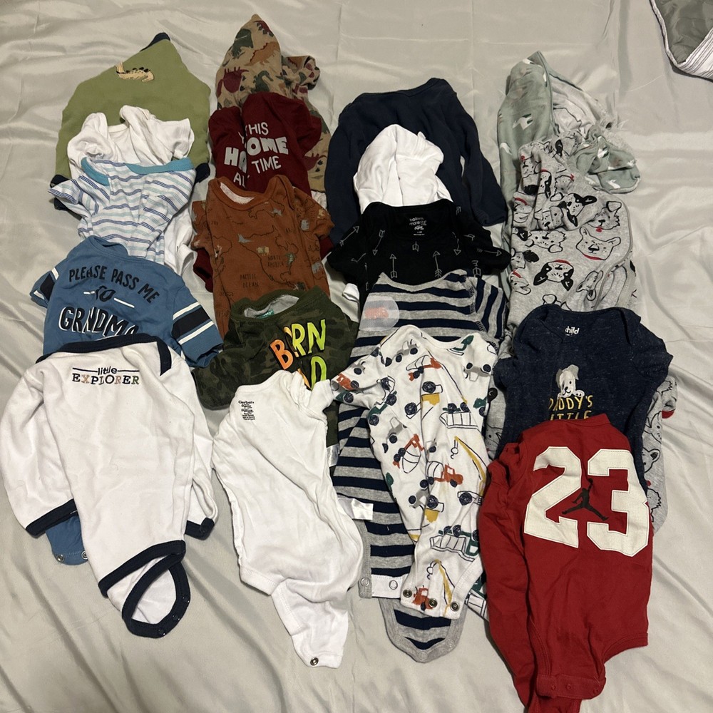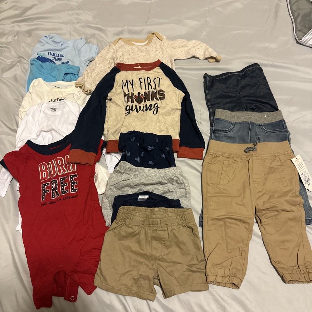 All Clothes are CLEAN and in good condition. 3-6 Months 29 pieces 17 bodysuits 2 shirts 1 Nirvana sweater 1 Disney Mickey Mouse Jacket 1 Disney Mickey Mouse matching pants 1 shorts 6 Pants 6-9 Months 41 Pieces 30 bodysuits 2 long sleeves shirts 1 shirt 2 jeans 1 new cat and jack with tags cargo pants 4 shorts