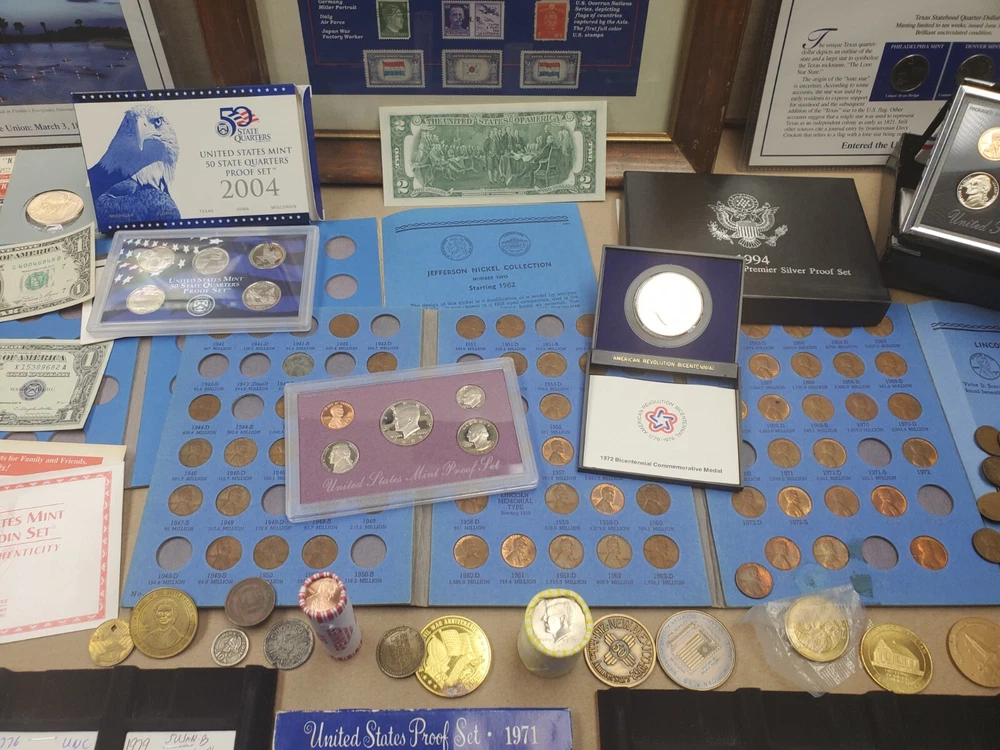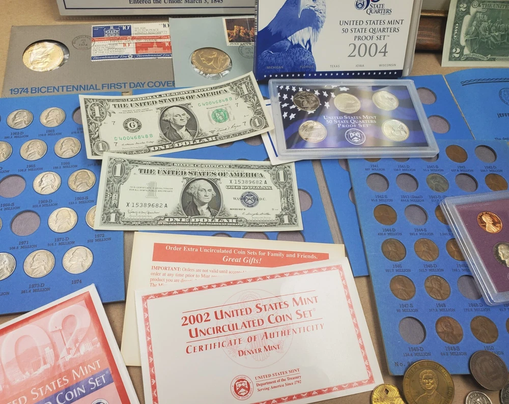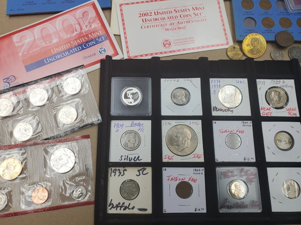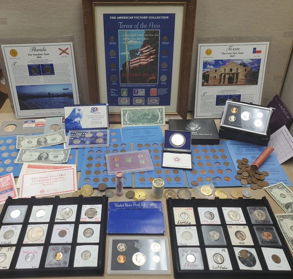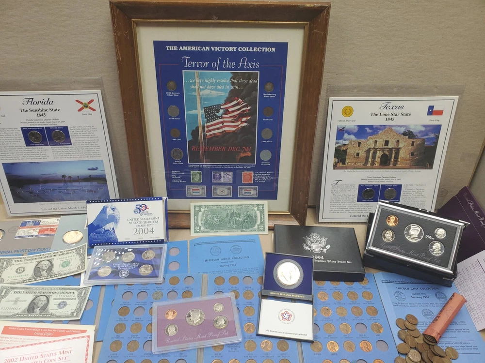 HUGE Estate Sale Coin Lot Collection - Great way to add and Nice Variety of USA, Old Rare Coins, Old Paper Money, 1957-B $1 Silver Certificate Bank Note, Lot's f Silver Coins, Terror of The Axis Coin Collection in Picture Frame, US. Mint Proof Sets, Commemorative, Medals, Lincoln BU Cents Roll, Lincoln Wheat Cent Roll, Kennedy Half Dollar Roll, Buffalo Nickel, Indian Head Cents, Silver Barber Quarters, Partial Lincoln Cent Collection in Album, Kennedy Silver Half Dollar Coins, 1994 Kennedy Silver Premier Half Dollar Set, Susan B. Anthony Dollar, & Much More to any Collection. Please Note: The Two Black 12-Coin Flip Tray's Are Not Included, it's to display the coins in the lot only. Very Clean Lot from a Smoke Free Environment. !! HAPPY BIDDING !! (SKU # 70 2-B) *** INTERNATIONAL SHIPPING QUOTED*** Thank you for viewing... Please email any questions you may have.... Take a moment and check out our other unique auctions !!! ***** Email us about signing up for our mailing list******* Exciting new items every day Philately - The Quiet Excitement Shipping We try to Ship Within 5 Business Days of Cleared Payment Will calculate international shipping PLEASE READ International Buyer's Shipping Instructions International shipping "" First Class Registered ENVELOPE " NO EXCEPTIONS ! ** Insurance, Registered mail or Confirmation/Signature Guarantee is included in the price of shipping for the USA only ** Our goal is to please our customers, provide quality and unique items, have successful transactions and earn positive feedback with a 5 star rating. We strive for accurate descriptions, quick turnaround, detailed communication, and reasonable shipping charges on every lot. Your feedback is important to us. If you feel anything about the transaction was less than 5 star, please give us the opportunity to rectify the situation Thank you The Staff at Henry Gitner Philatelists, Inc.