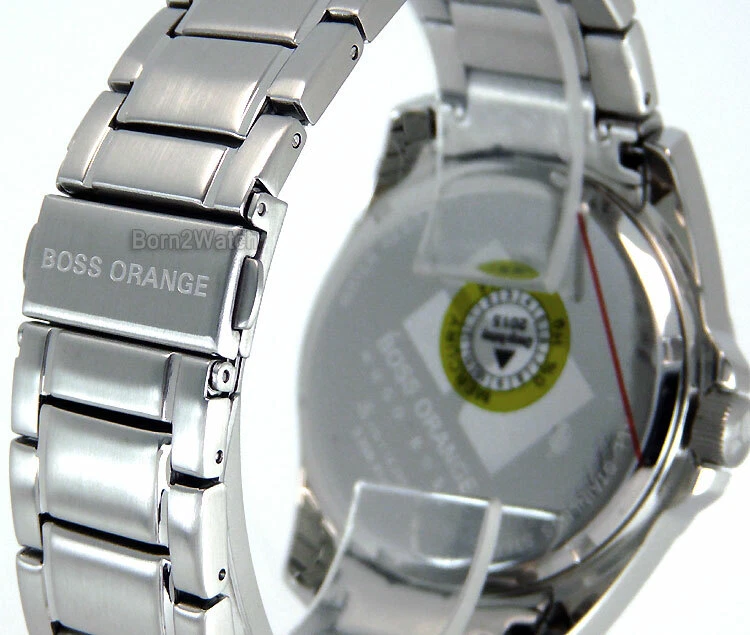 WE DO NOT SELL REPLICAS! 100% BRAND NEW AND AUTHENTIC! *SELLER RETIRING*SUPER CLEARANCE* MEN HUGO BOSS "BOSS ORANGE" 1512836 PRECISION JAPAN QUARTZ MOVEMENT MULTIFUNCTION DAY SUB-DIAL AT 9 O'CLOCK DATE SUB-DIAL AT 3 O'CLOCK AM-PM SUB-DIAL AT 6 O'CLOCK BLACK DIAL WITH ORANGE ACCENTS STAINLESS STEEL CASE IN POLISHED/BRUSHED SATIN FINISH MINERAL CRYSTAL SQUEEZE-RELEASE CLASP WITH EDGED HUGO BOSS SIGNATURE CASE DIAMETER IS 46mm EXCLUDING CROWN CASE IS 13mm HIGH LUG SIZE IS 24mm (WHERE BRACELET CONNECTS TO CASE) WEIGHS 6.0oz (170g) MAXIMUM WRIST SIZE 9" DOES NOT COME IN PRESENTATION GIFT BOX