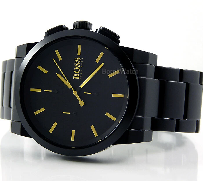 WE DO NOT SELL REPLICAS! 100% BRAND NEW AND AUTHENTIC! *SELLER RETIRING*SUPER CLEARANCE* MEN HUGO BOSS 1513276 PRECISION JAPAN QUARTZ MOVEMENT 60 MINUTE STOPWATCH SUB-DIAL AT 9 O'CLOCK POSITION 1/10th OF A SECOND STOPWATCH SUB-DIAL AT 12 O'CLOCK POSITION CHRONO SECOND HAND SUB-DIAL AT 6 O'CLOCK POSITION BLACK DIAL WITH YELLOW GOLD ACCENTS BLACK ION COATED SOLID STAINLESS STEEL IN MATTE FINISH MINERAL CRYSTAL BUTTERFLY SAFETY CLASP WITH EDGED HUGO BOSS SIGNATURE 5ATM / 50M WATER RESISTANT CASE DIAMETER IS 46mm EXCLUDING CROWN CASE IS 12mm HIGH LUG SIZE IS 24mm WEIGHS 7.1oz (202g) MAXIMUM WRIST SIZE 8-1/4" COMES IN HUGO BOSS PRESENTATION GIFT BOX