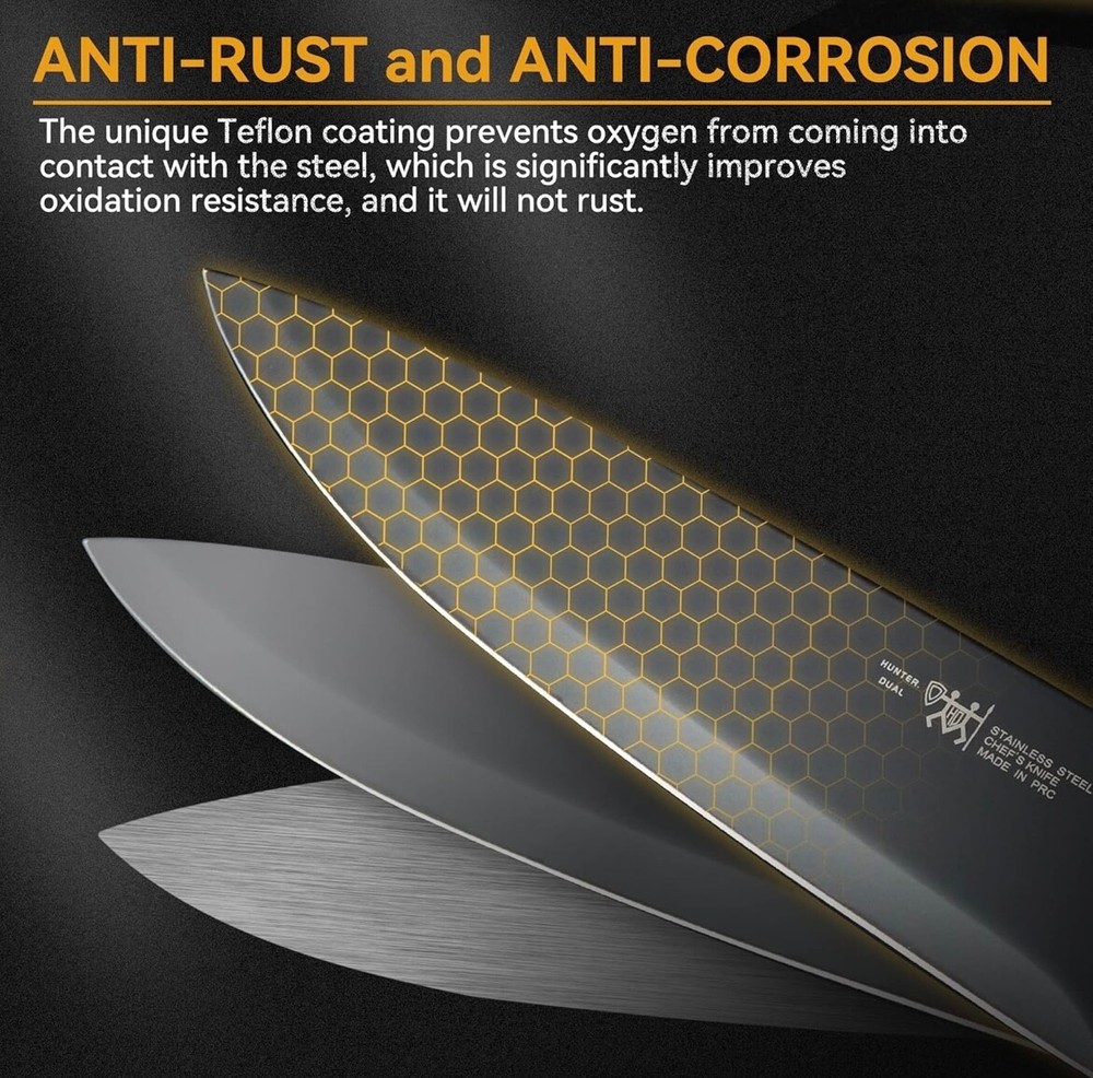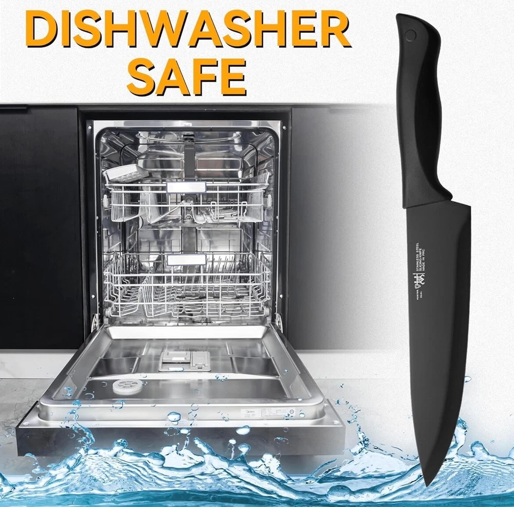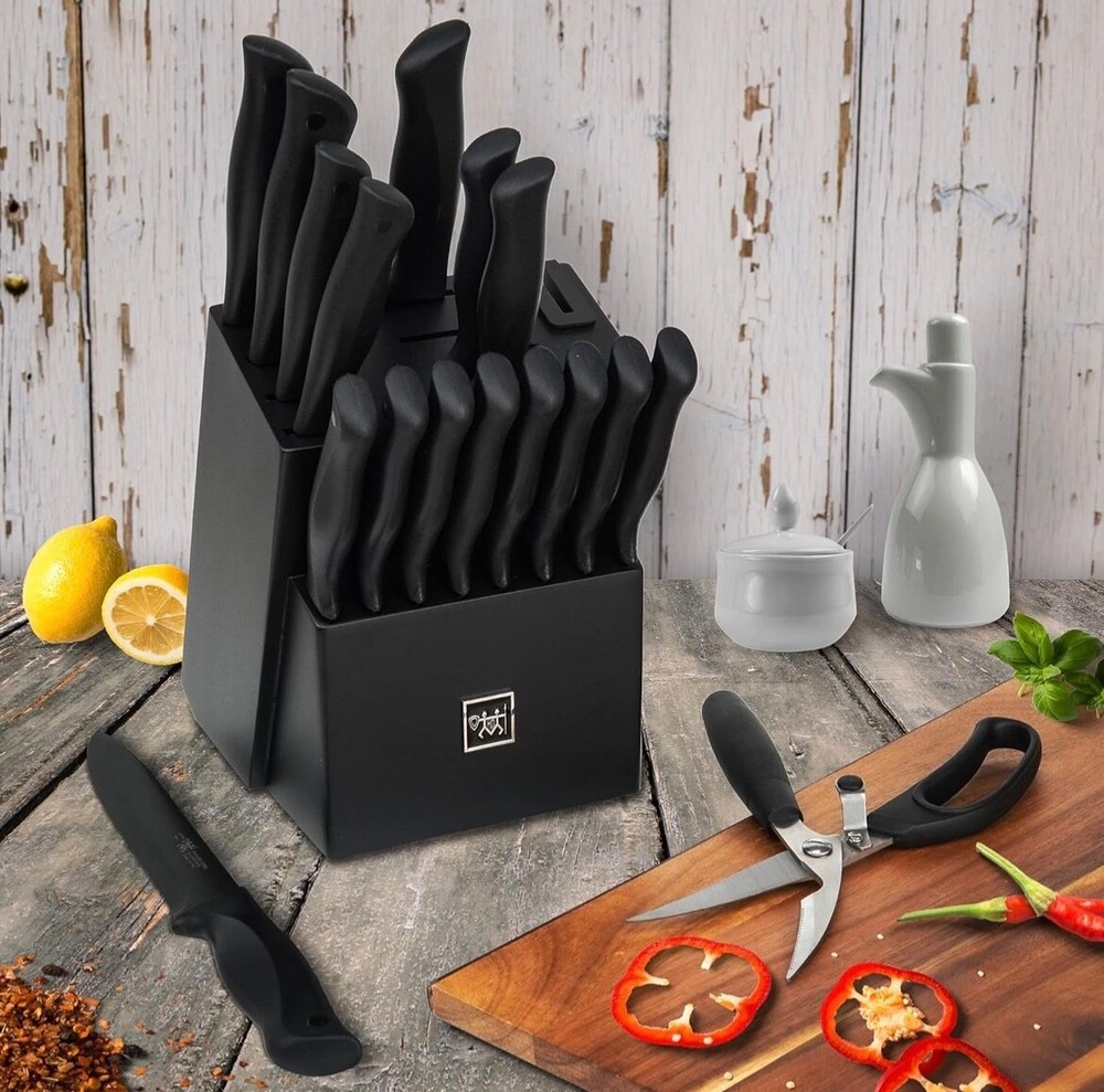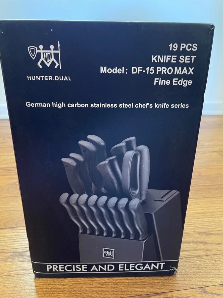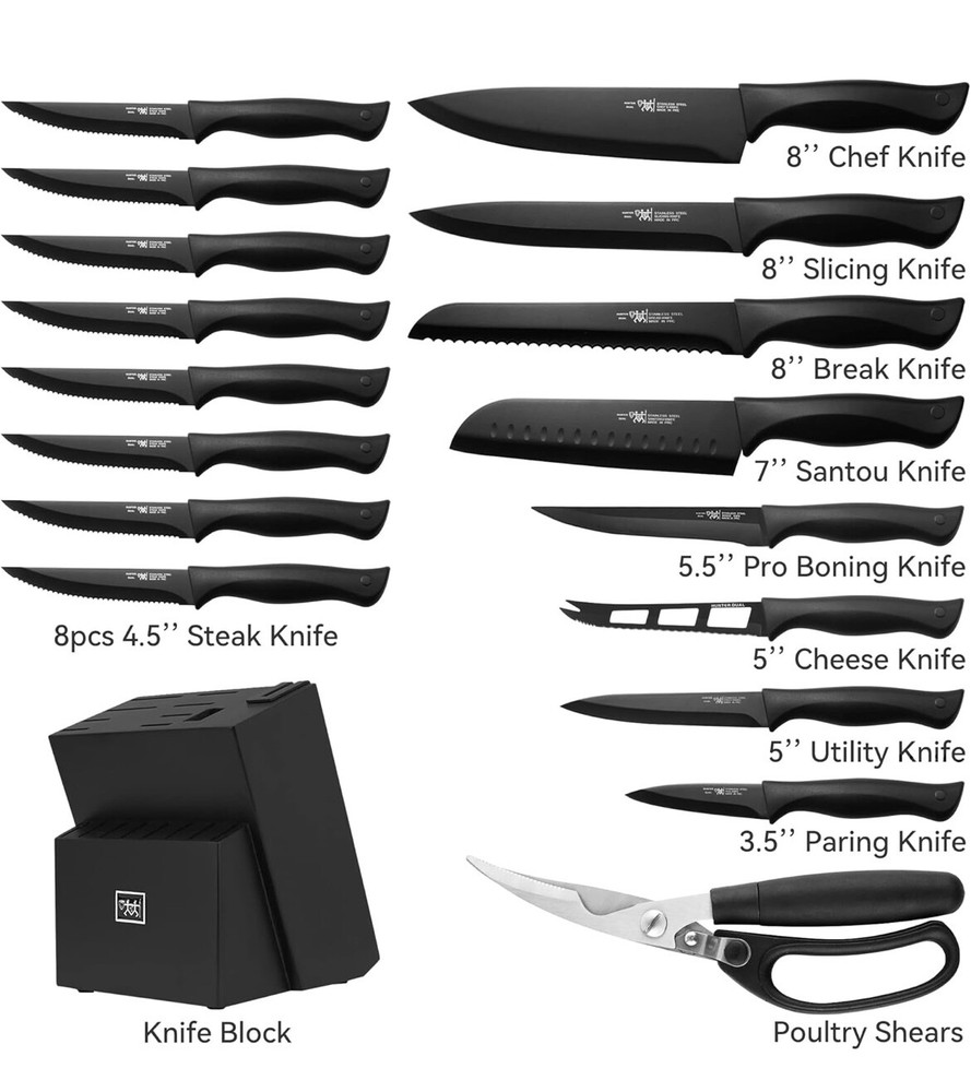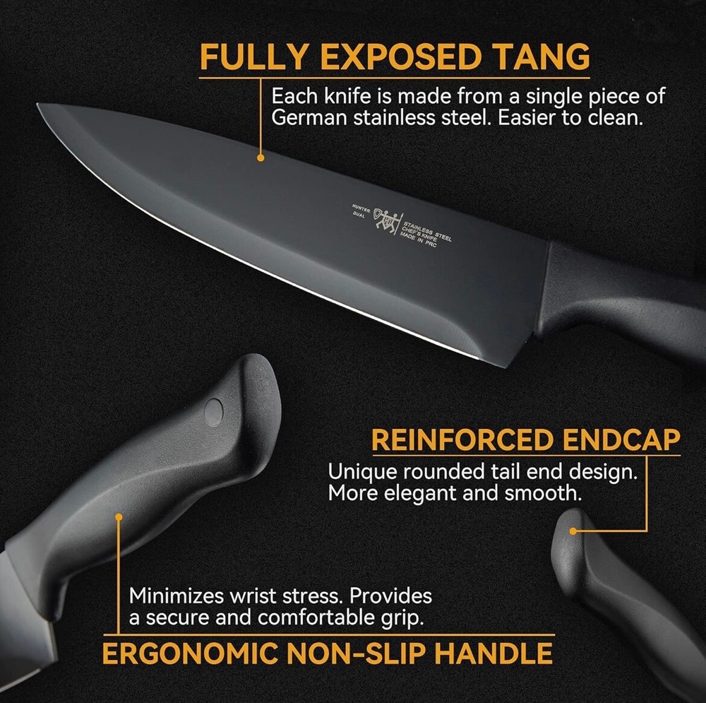 Kitchen Knife Set with Block Self Sharpening, Dishwasher Safe, Anti-slip Handle, Black KITCHEN KNIFE SET - This high quality knife set is stain and rust resistant and can be used with high frequency or after long periods of inactivity to fully utilize the life of the knives. ALL-IN-ONE HANDLE - 19-piece knife set includes. 8" chef's knife, 8" slicing knife, 7" Santoku knife, 8" serrated bread knife, 5.5" boning knife, 5" cheese knife, 5" utility knife, 3.5" paring knife, 8 4.5" serrated steak knives, 1 pair of strong kitchen shears, and hardwood knife block with built-in knife sharpener. SHARP KNIFE SET - Each of HUNTER.DULA knives is carefully tuned to be the sharpest it can be and wears a built-in sharpener. DISHWASHER SAFE - The knife set can be washed in the dishwasher, easy and quick to operate, and dry the knife set after cleaning for easy storage, not taking up space. CRAFTSMANSHIP - Non-Stick and Rust Resistant - With a black coating that prevents oxidation of the steel, the kitchen knife set will last a long time and remain non-stick and rust resistant. The ergonomically designed handle provides a comfortable grip and the handle will no longer loosen or fall off.