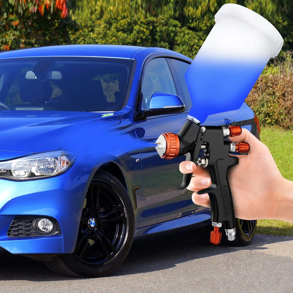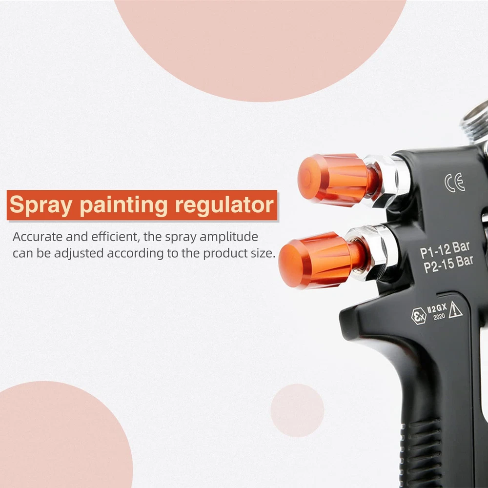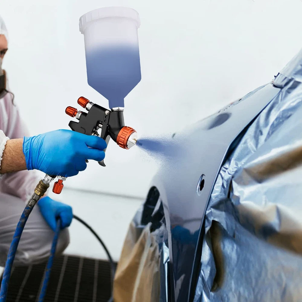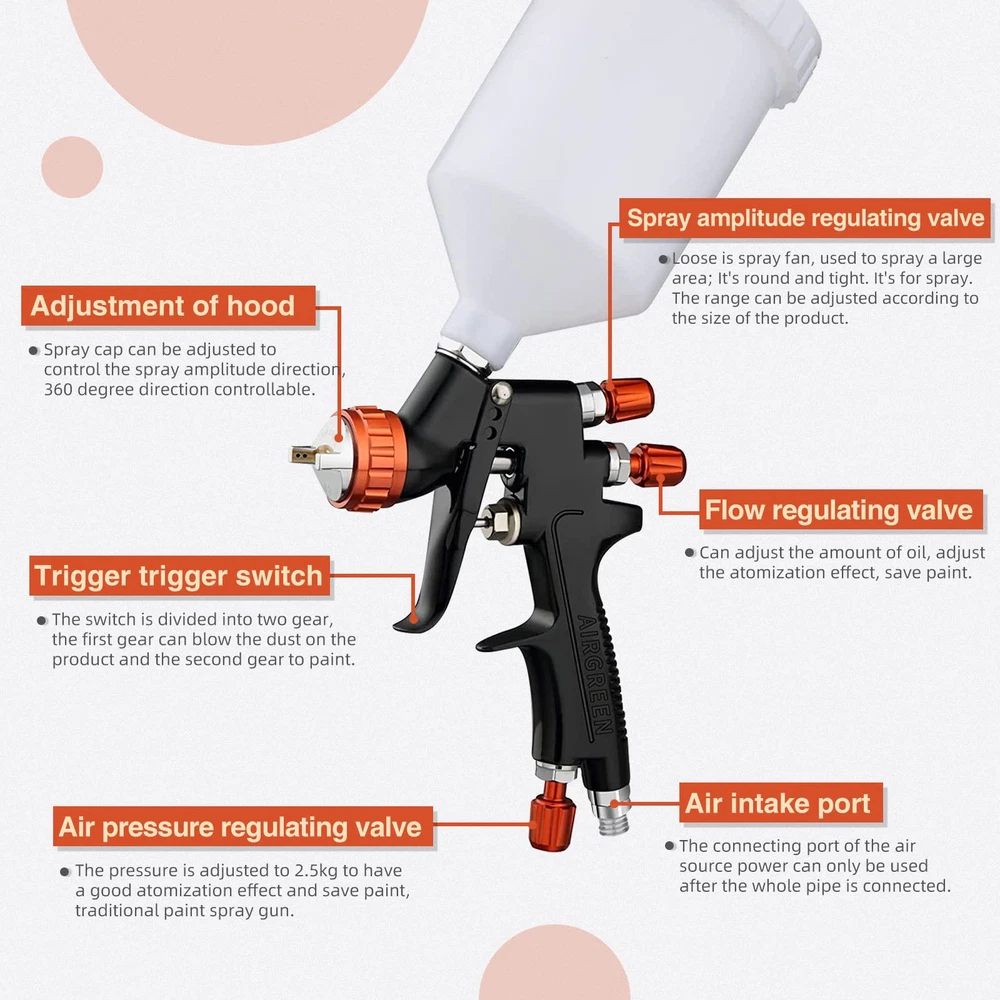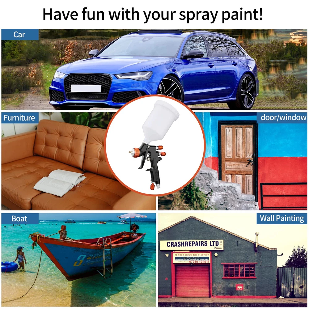 HVLP Gravity Air Spray :Light weight, ergonomic design and easy trigger pivot reduces operating fatigue. Professional HVLP spray 1.3 mm nozzle , which makes spraying more smooth and even, seasier to control. Adjust the spray cap to control the nozzle direction 360° direction controllable. This spray makes the spraying softer easily controlled and less overspray. Pot type spray :Constructed from high-quality Alloy + Stainless Steel + PVC, sturdy and durable. HVLP Spray With 1.3mm fluid nozzle(installed),and comes with a high-flow air pressure regulator with a gauge&600 cc plastic cup Wide range of applications:HVLP Spray and components suitable for automobile, automobile maintenance, sheet metal, furniture, plastic and construction industries. Suitable for spraying oil-based or latex paints/spraying primer, transparent paint, single paint, primer, etc. The package includes: 1 Spray With 1.3 mm Nozzle,1 x 600 cc plastic cup,,1 X Brush,1 X Spanner, 1 x Hex Wrench,1 x Air Inlet Joint,1 x Instruction Manual,1x Spray Filters,1x Water Oil Separator, 1 x Pressure gauge After Sale Service: We're aiming to provide each customer with the highest standard of . Any problem, us and we will resolve it soon