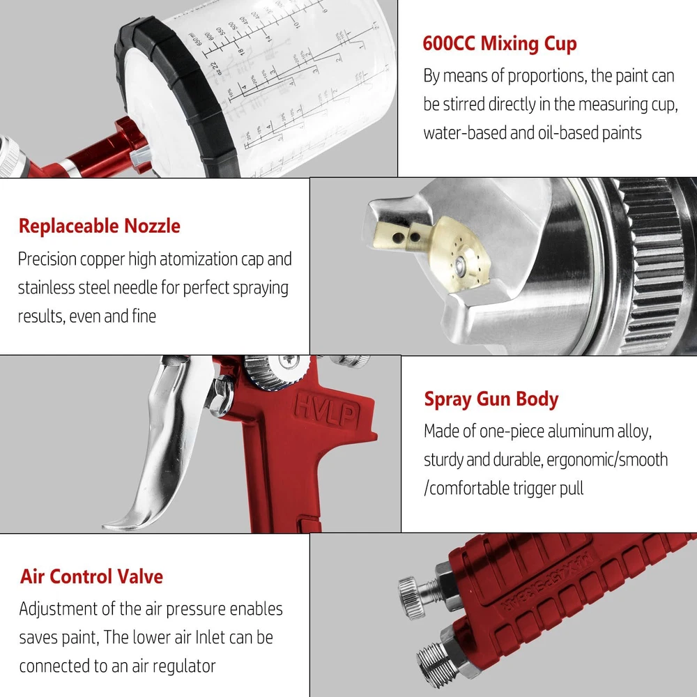 Why Choose Air Spray ? pneumatic spray is chosen for its efficiency and versatility in applying coatings such as paint, varnish, or primer to surfaces. It utilizes compressed air to atomize and propel the material, ensuring a smooth and even finish on various substrates. Specifications Air Pressure Requirement: Typically operates at 30-50 PSI (pounds per square inch), ensuring optimal atomization without overspray. Material Compatibility: Spray paint suitable for water-based and oil-based paints, enamels, lacquers, and primers. Nozzle Size Options: Available in various nozzle sizes (1.3/1.7/2.0) to accommodate different viscosity and application requirements. Called: automotive paint sprayer, spray for painting, hvlp paint sprayer, pistola para pintar carros,auto paint ,car paint ,air paint sprayer Considerations Air Compressor Requirements: Ensure the air compressor the 's air consumption rate to maintain consistent performance. Cleaning and Maintenance: Regularly clean the after each use to prevent clogging and ensure longevity. Use appropriate cleaning solvents recommended by the manufacturer. Safety Precautions: Wear appropriate personal protective equipment (PPE), including goggles, gloves, and a respirator, especially when working with solvent-based coatings. air paint sprayer combines reliability, efficiency, and ease of use, making it an ideal choice for professionals and DIY enthusiasts alike. Its ability to deliver a flawless finish on diverse surfaces makes it indispensable in automotive refinishing, furniture restoration, and various industrial applications. PROFESSIONAL SPRAY : The working pressure is 2.5-3.5 bar, spraying distance is 160-240mm, and air consumption is 240-280L/min. The HVLP structure ensures smooth spray control, delivering uniform atomization and particle effects for coating various surfaces. By owning this spray paint , you can save on pricey labor costs! ADJUSTABLE CONTROLS: The HVLP spray has a higher paint transfer rate, reducing overspray and ensuring even coatings and fine atomization. You can adjust the flow control knob to control paint output, accommodating a range of projects. Attaching the air spray kit's 2-in-1 air regulator to captures water vapor and oil particles, providing precise air control of the paint sprayer and improving spray quality. EASY TO USE AND CLEAN: The air paint sprayer is easy to assemble. Even if you are a beginner, you can get started quickly after reading the manual. You need to disassemble the paint spray for cleaning after use. The kit comes with cleaning kits, which can help you effectively clean the hardened paint left on the nozzle part, so you can enjoy a more efficient cleaning experience! BUILT TOUGH: This car spray paint is built to last, with a solid aluminum body, stainless steel nozzle, and brass air cap, all resisting paint corrosion. The precision-machined 15-hole cover ensures that paint is mistin' right. Additionally, the ergonomic handle design provides a comfortable grip, reducing fatigue during extended use. HVLP AIR SPRAY : The paint set includes three nozzle sizes (1.4/1.7/2.0mm) suitable for a wide range of painting projects, such as automotive spraying, priming, craft spraying, toy painting, art murals, and anti-rust protection. Paint automotive are suitable for different types of paints, including water-based and oil-based. Please filter and dilute the paint before use to avoid clogging. YOUR GEAR: 1 HVLP paint , 3 Nozzles Kit (1.4/1.7/ 2.0mm), 1 600ML Mixing Cup Set, 1 2-in-1 Air Regulator, 5 Paint Filters Papers, 1 Filters, 1 Wire Brush, 1 Cleaning Brush, 1 Set of Threaded Fittings, 1 Set of Connectors, 1 Tape, 1 Wrench, 1 Instruction Manual. Got questions about air paint sprayer? Reach out through your order, Our dedicated after-sales teams are standing by to assist you.