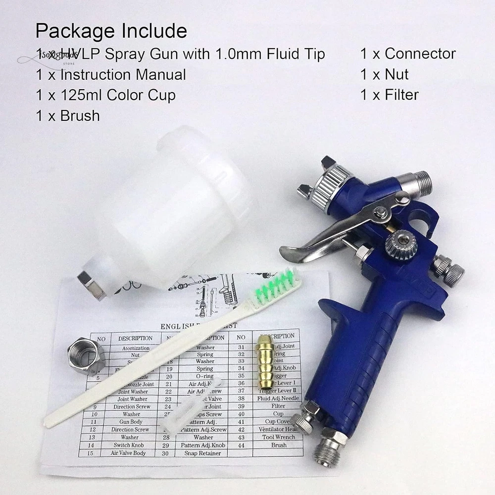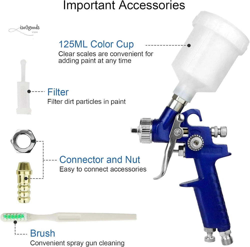 HVLP Car Paint Spray Gun – High-Performance Tool for Precision Painting 【Wide Application for Multiple Projects】 This HVLP spray gun with a 125cc color cup is perfect for a variety of painting tasks, including: Car primer and painting Furniture surface painting Wall painting Art and craft projects Base coating and automotive refinishing Whether you’re a professional or a DIY enthusiast, this versatile tool is designed to meet your needs. 【Cost-Effective Gravity Feed Design】 The gravity feed system minimizes residual material waste, ensuring that every drop of paint is efficiently used. This innovative design helps you save costs and reduce material waste , making it an eco-friendly and budget-friendly choice. 【Complete Accessory Kit for Enhanced Performance】 Durable 125ML PVC Color Cup : Resistant to falls and longer-lasting than standard cups. Integrated Paint Filter : Effectively removes dirt particles to prevent defects in your finish. Cleaning Brush : Makes post-use cleanup easy and keeps your spray gun in top condition. 【User-Friendly Design for All Skill Levels】 Crafted with a lightweight stainless steel needle and nozzle , this spray gun is built for durability and longevity. Its ergonomic design ensures comfortable operation, making it easy to use for beginners and professionals alike . 【3 Adjustable Control Valves for Precision】 Achieve professional results with the spray gun’s three control knobs : Air Pressure Regulator : Adjust air pressure for improved atomization and paint-saving functionality. Paint Flow Valve : Control the paint output with precision to suit your project. Spray Width Adjustment : Customize the spray width for small details or larger surfaces. 【Durable & Lightweight Build】 1.0mm Copper Nozzle : Ensures smooth, even spraying with a 360° rotatable design for flexibility. Aluminum Alloy Spray Gun Body : Offers durability without adding weight, making it easy to handle. 125ml Color Cup : Designed with sturdy plastic for long-term use and fall resistance. 【What’s Included in the Package】 1 x HVLP Spray Gun with 1.0mm Fluid Nozzle 1 x 125ml Plastic Color Cup with Lid 1 x Cleaning Brush 1 x Connector 1 x Nut 1 x User Manual Specifications: Nozzle Size : 1.0mm Color Cup Capacity : 125ML Air Inlet : 1/4 BSP Working Pressure : 0.25 Mpa Material : Aluminum Alloy (Body), Copper (Cap), Plastic (Cup) Color : Blue Key Features: Efficient Gravity Feed System : Saves paint and reduces waste. Ergonomic Trigger Design : Provides a comfortable grip for long use. Easy-to-Clean Components : Comes with a cleaning brush for hassle-free maintenance. Quick Connector Installation : Includes a detailed guide for easy setup. Perfect for Professionals and Hobbyists Whether you’re working on automotive paint jobs , furniture refinishing , or DIY art projects , this HVLP spray gun delivers precise, professional-quality results every time. Upgrade your painting tools with this high-performance spray gun and bring your projects to life with ease! Order now to experience effortless and efficient painting.