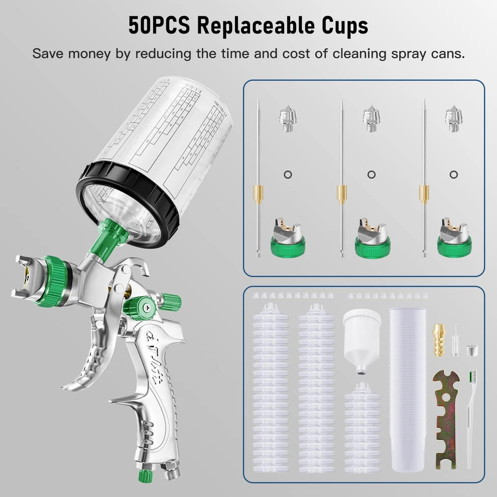 【Professional Spray Gun】: Spraying distance: 160-240 mm; Working pressure: 2.5-3.0 bar; Air consumption: 260 L/min; Paint capacity: 600cc; Spraying width: 300mm. Our HVLP spray gun saves up to 20% of the paint, with an optimal paint utilization rate of 65%-80%. G1/4 air inlet and quick adapter of the same size. 【3 Adjustable Nozzles】: The spray paint gun comes with three different nozzle sizes (1.4 mm, 1.7 mm, 2.0 mm). Note: The 1.4 mm nozzle is already installed in paint gun. 1.4 mm nozzle is suitable for topcoats, 1.7 mm nozzle for primers and 2.0 mm nozzle is more suitable for spraying large areas. 【Fast Atomization】: The hvlp paint sprayer is equipped with a brass diverter valve and a 15-hole hood that is precision machined for high atomization. The spray gun can be adjusted in terms of spray volume and spray range to achieve faster atomization than traditional LVLP spray guns. 【50 Replacement Cups】: The package of the spray gun includes 1* automotive paint gun, 3 types of nozzles, 1* spray can, 50* disposable cups (600cc), 1* brush, 1* wrench, 2* green adapter. More replacement cups can reduce the time and cost of cleaning the spray can after each spraying, thus saving you money. 【Wide Range of Applications】: The mini paint gun makes spraying softer, easier to control and reduces overspray. Ideal for spraying primers, clear coats and other high-viscosity paints, as well as basecoats, topcoats and detail paints for the automotive and furniture industries. 【Exclusive Customer Service】: We strictly control the production process and do our best to provide high quality paint sprayer gun with 365 days warranty. If you have any questions, you can contact our reliable service staff to help you solve them within 24 hours.