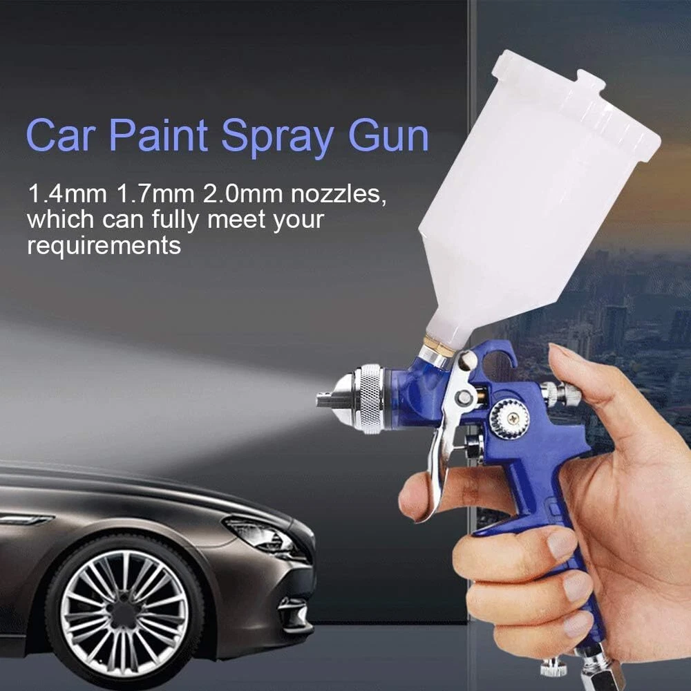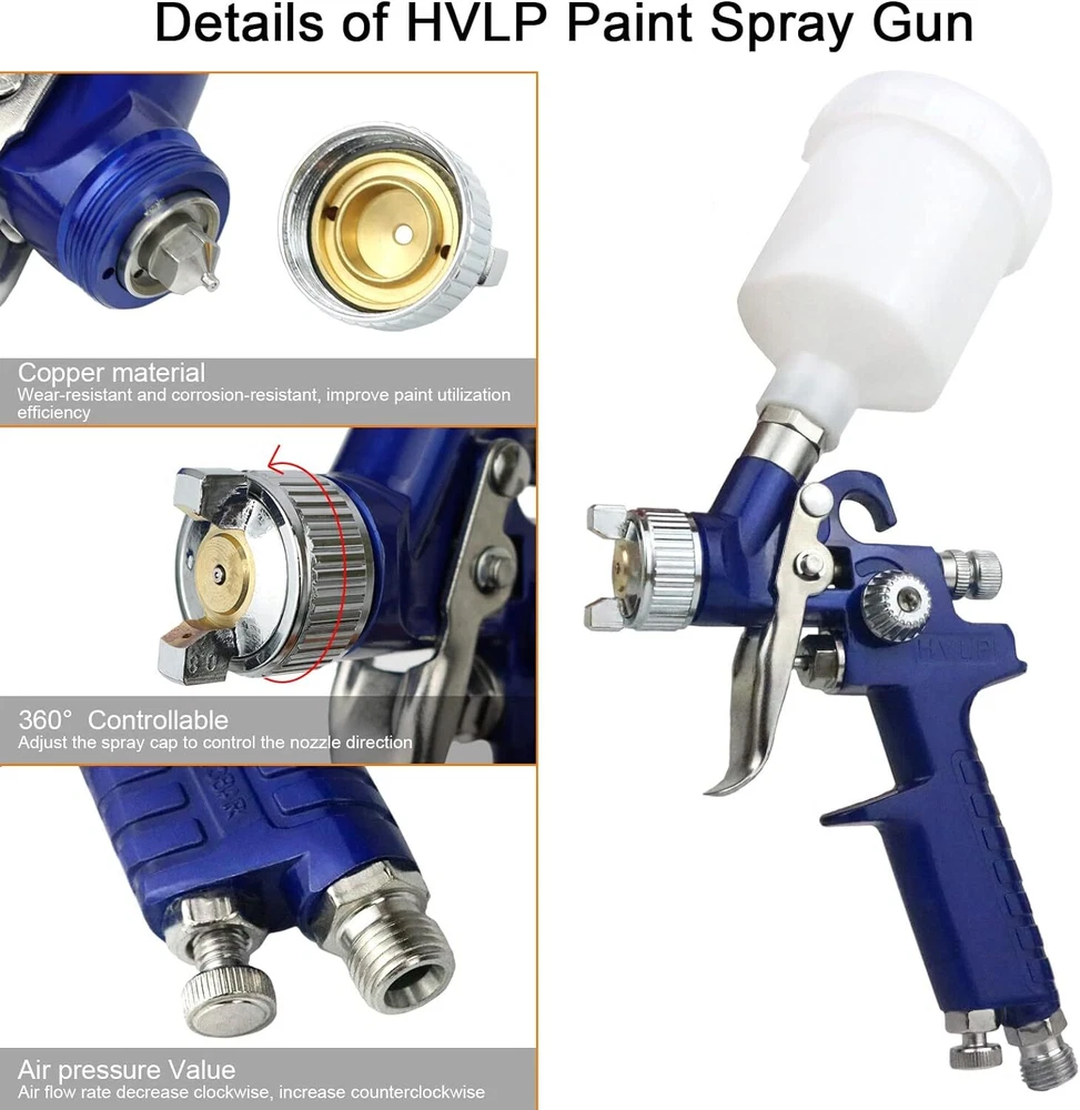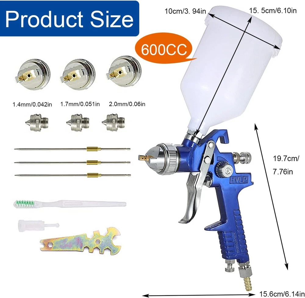 HVLP Spray Gun with Replaceable 1.4mm 1.7mm 2.0mm Nozzles Needle Cap Blue Product Details Brand: Hotorda Tank Volume: 600 Milliliters Color: Blue Recommended Uses For Product: Painting Material: Aluminum Application of HVLP Paint Spray Gun: This is a great car paint spray gun with 600cc cup for car primer,furniture surface painting,wall painting, art craft, automotive paint, cloth spray,base coatings. 3 Nozzle and 3 Needle: In order to achieve the effect of spraying, we will give three additional replaceable 1.4mm 1.7mm 2.0mm nozzle needle caps in this hvlp spray gun set, which can fully meet your needs.Please test and adjust the spray gun to the desired state with water before use.The pigment you are using needs to be diluted and operated according to the manufacturer's requirements to achieve a good spraying effect Practical Spray Gun: Use HVLP spray gun kit to reduce spraying. The gravity feed design helps to reduce the waste of residual material in the color cup, thereby helping you save costs and materials. What a practical spray gun it is! Durable and reliable: Materials of the needle and nozzle of the HVP spray gun are made of high-quality stainless steel, which is sturdy and durable, can be used for a long time, wear-resistant and scratch-resistant. Easy to Use and Clean: The nozzles of the hvlp spray gun is made of high-quality stainless steel, which is easy to clean the surface of the spray gun. In addition, the spray gun is lightweight and easy to operate, suitable for beginners and professionals. HVLP Spray Gun with 3 Nozzles 1.4mm 1.7mm 2.0mm, ideal for various surface spraying, suitable for car prime,automobile spraying, furniture spraying,cloth spraying,wall painting,base coatings and painting time and effort with a large spray pattern and enjoy a smooth spraying experience!