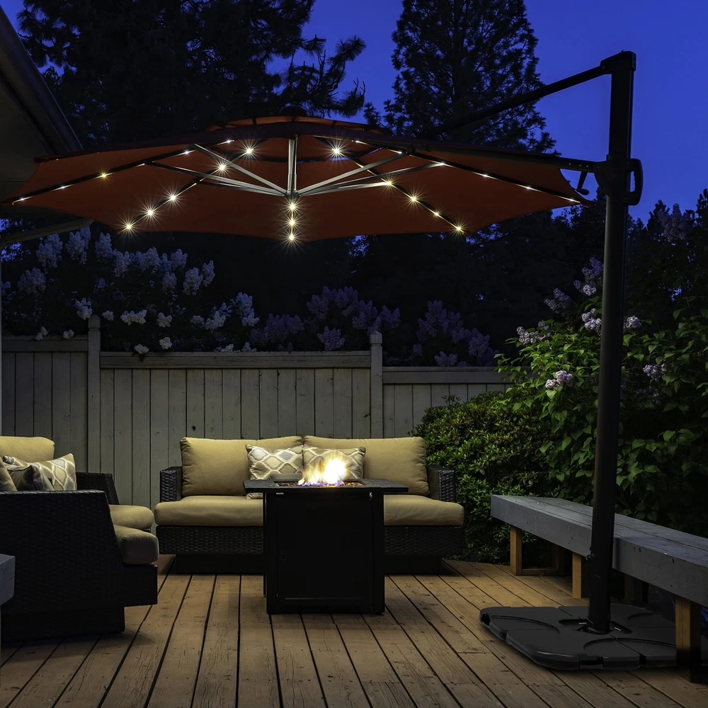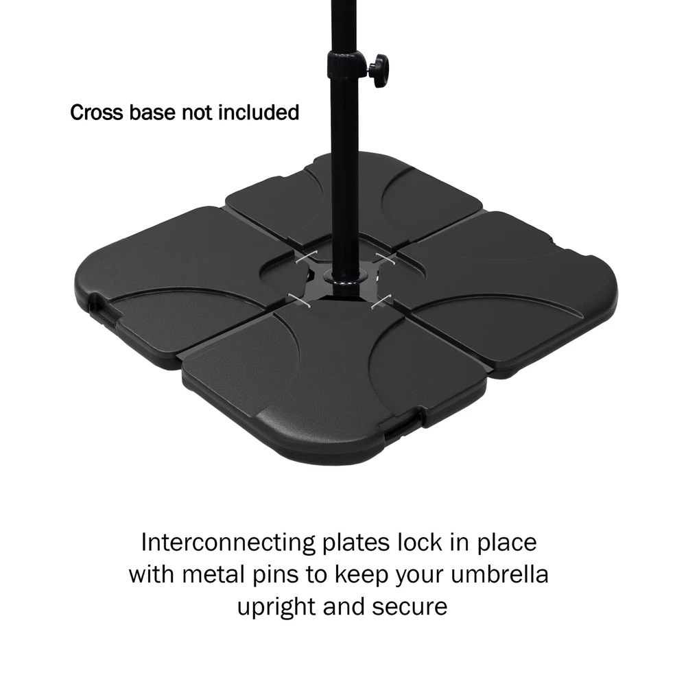 The 4-Piece Weighted Umbrella Base by is perfect for securely supporting your cantilever patio umbrella! This fillable base is meant to be used with offset or cantilever umbrellas with a cross bar base. Each plate features a spout to help with quick and convenient filling with sand, as well as easy cleaning and storage. The plates are made of sturdy High Density Polyethylene (HDPE) plastic and can hold up to 55 pounds of sand for a total of 220 pounds to ensure your umbrella will stand up to the wind and elements. With a convenient foldable handle on each plate, they are easy to move and position after they are filled. 4 PLATE DESIGN- This 4-piece fillable plate set is designed to securely support your cantilever or offset umbrellas. It is not for use with umbrellas featuring a single pole or cross bar bases with flanges. 4 Interconnecting plates lock in place with metal pins to keep your umbrella upright and secure. STURDY AND DURABLE- Each plate in this 4-piece base is made of durable HDPE plastic and can hold up to 55 pounds of sand for a total of 220 pounds. The umbrella base is strong enough to stand up to the elements in most weather conditions. EASY TO FILL SPOUT- The plates feature an easy to fill spout for quick and convenient filling with sand. The spouts also help to easily empty the plates for quick cleaning and storage during the winter or while not in use. FOLDABLE HANDLE- All the plates in the set features a folding handle that makes them easier to move and position once each unit is filled with sand. The handle then folds out of the way when not in use to prevent damage. PRODUCT DETAILS- Materials: HDPE Plastic. Single Plate Dimensions: 20” L x 20” W x 2.75” H. Assembled Dimensions: 42” L x 42” W x 2.75” H. Single Plate Capacity: 55 Pounds. Overall Capacity: 220 Pounds. 4 Pieces. 4 Plates and 4 Metal Connecting Pins. Crossbar Base Not Included.