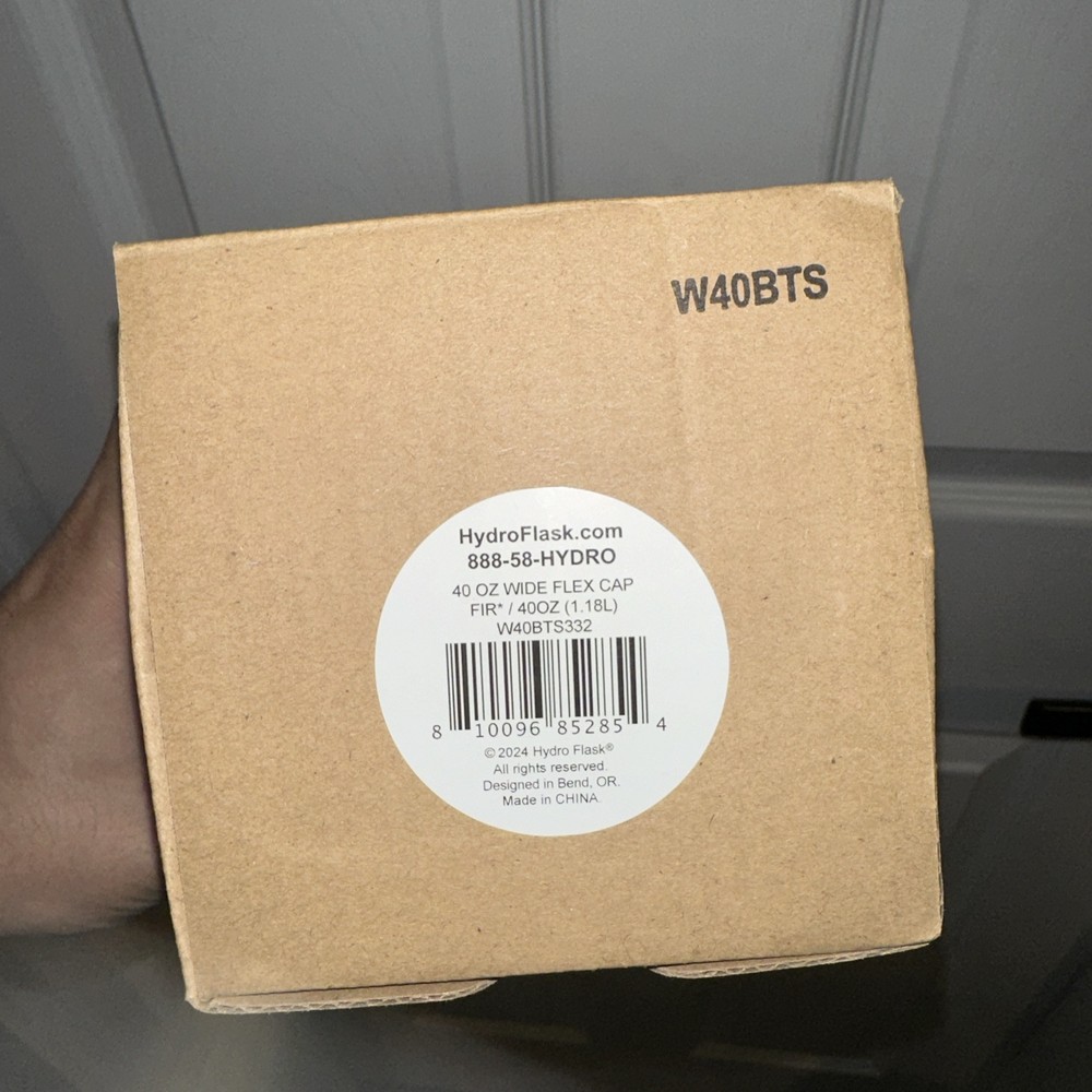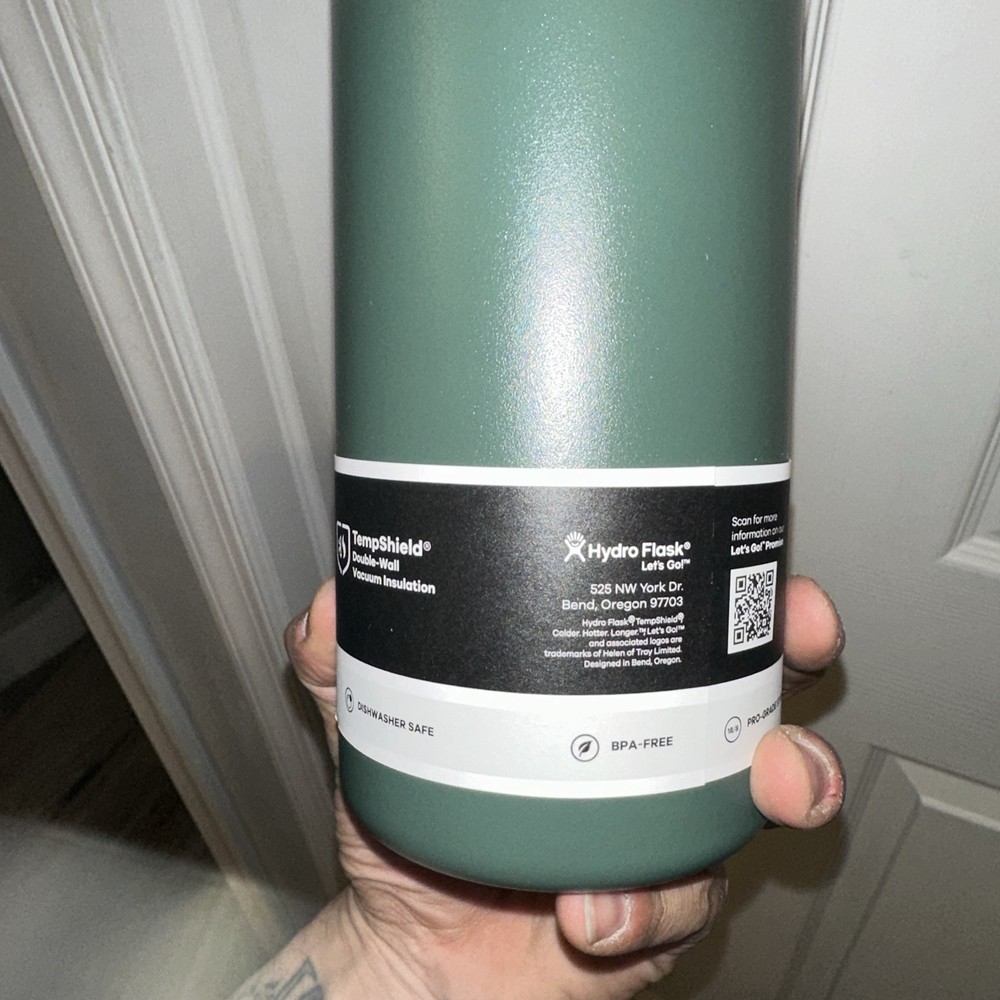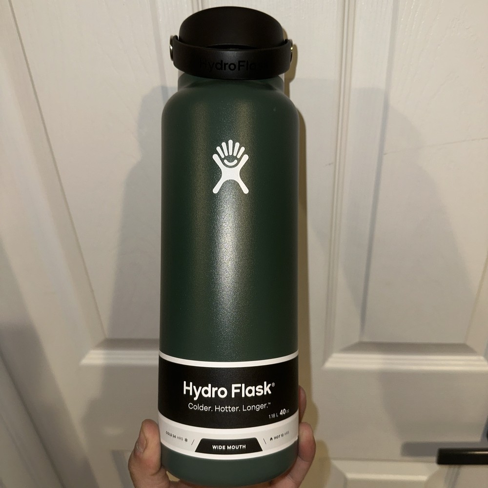 The Hydro Flask Wide Mouth Chug Cap water bottle is a 24oz stainless steel bottle in a solid fir color. It features a twist lid and is designed to keep beverages cold for up to 24 hours. This vacuum-insulated bottle is suitable for both hot and cold drinks, making it versatile for daily use. With a convenient handle attached, it is easy to carry around and is ideal for various settings such as outdoor activities, work, or home use. Made in China, this Hydro Flask product offers quality and functionality for keeping drinks at the desired temperature throughout the day.