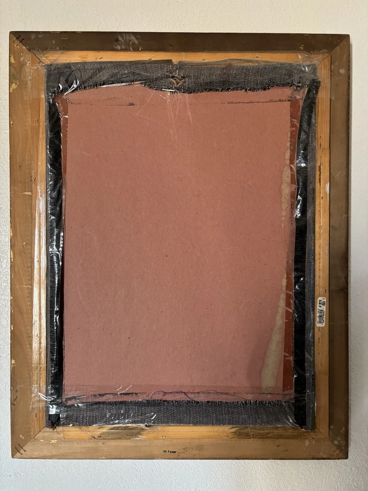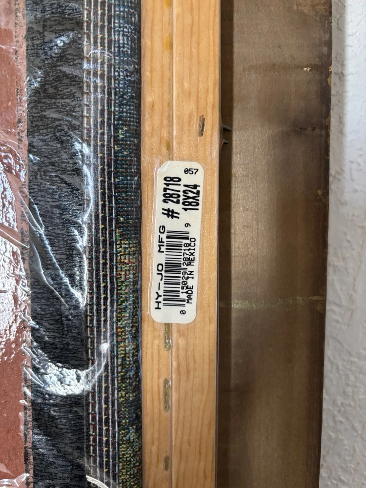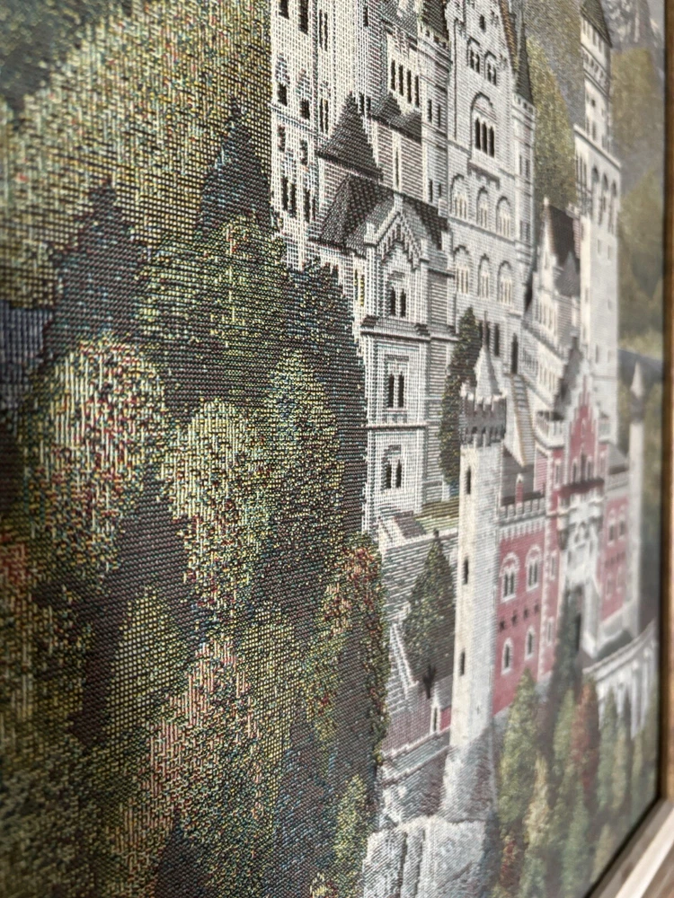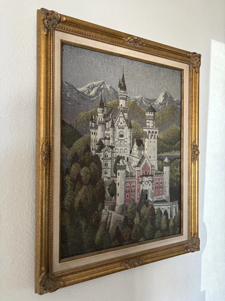 This is a rectangular wooden photo frame measuring 23 inches in width and 1.5 inches in height. The frame is gold in color with an antique floral design theme. It has a pictorial tapestry of Neuschwanstein Castle, making it suitable for all occasions. The frame can hold one photo and would be a stylish addition to home décor. Pre-owned. Frame size 29 x 23 inches.Picture size 18 x 24 inches.Pictorial tapestry unknown brand. Has been in there since day one.Sold as is see photos for details.