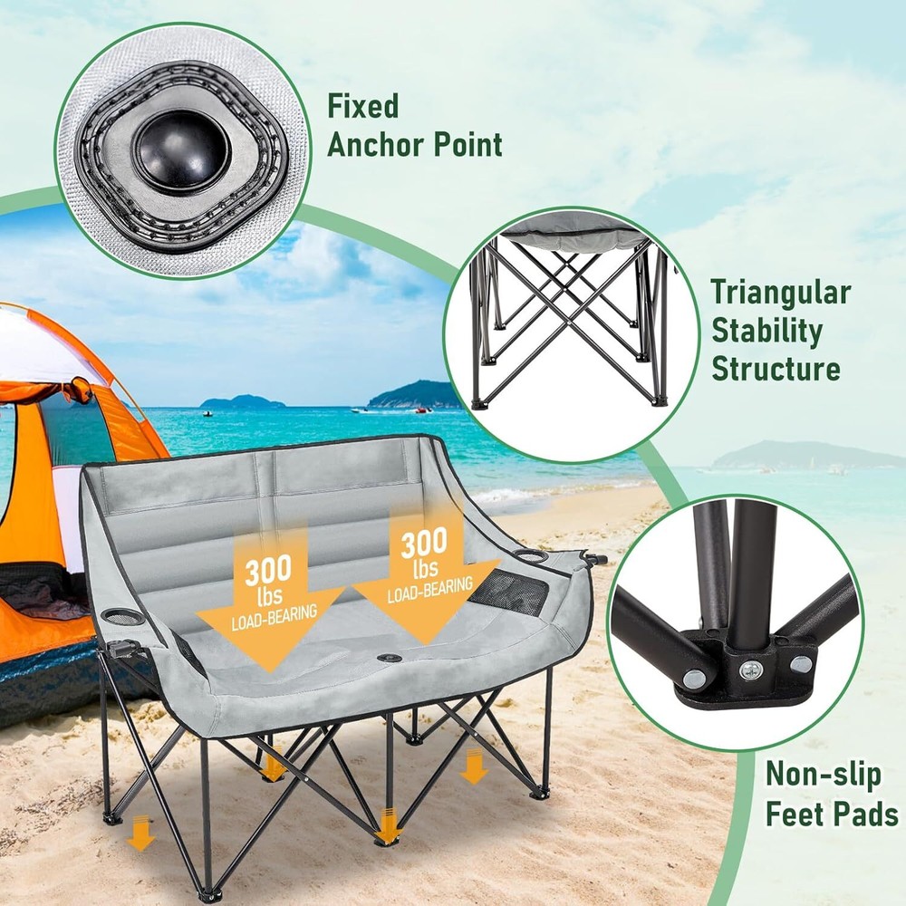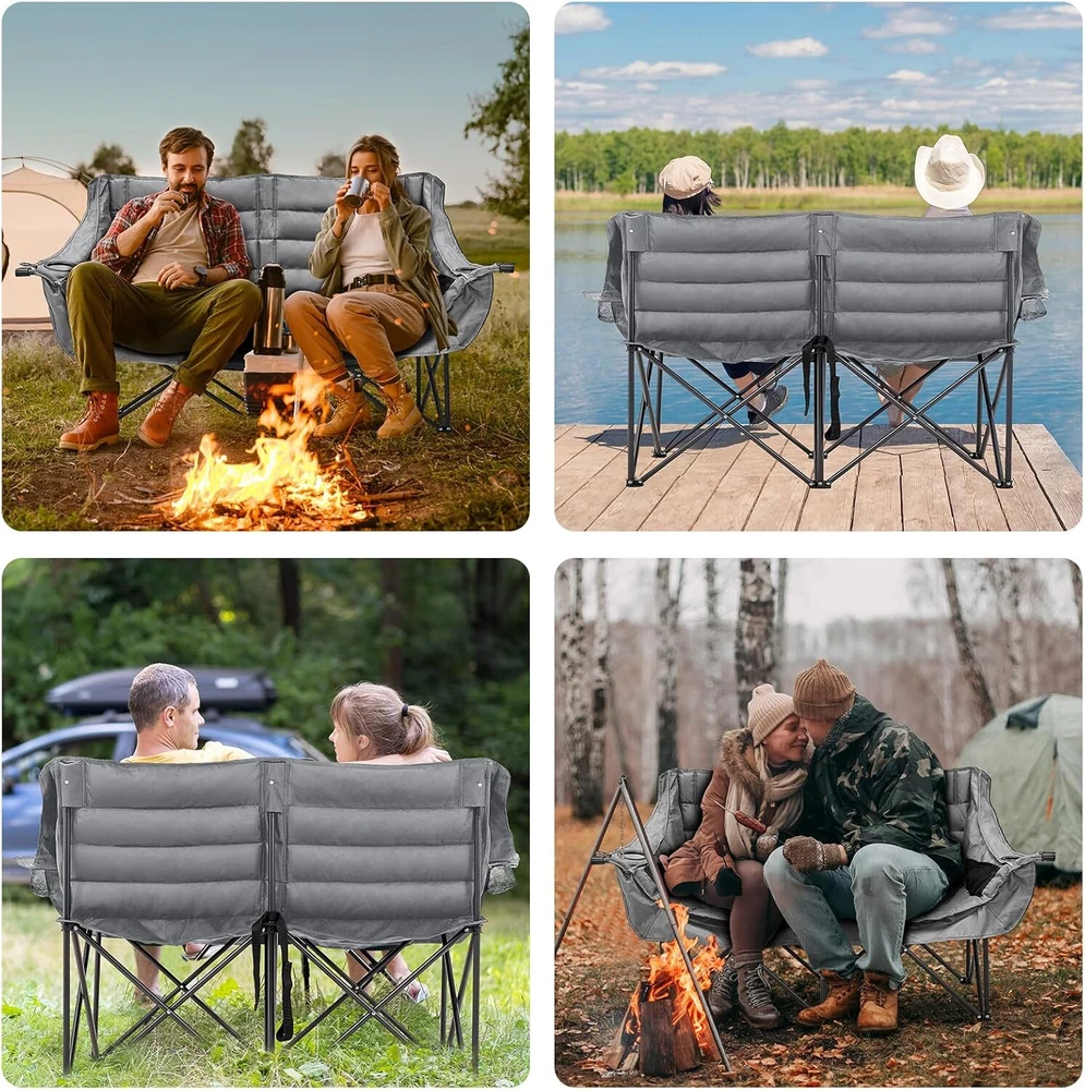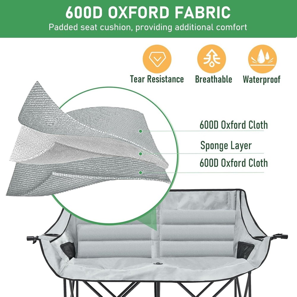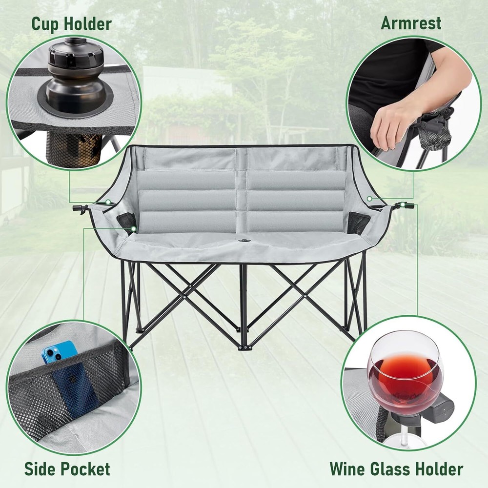 Double Camping Chair for Adults: This double camping chair comfortably seats two person, supports up to 600 Ibs with its sturdy steel frame. Padded Loveseat Camping Chair: Made from breathable 600 D double-layer oxford fabric with cotton fiber padding ensuring tear resistance and enhanced comfort Compact & Portable Design: This camp chair folds into a compact 36" x 8" bundle and fits into the included carry bag, it's easy to carry like small luggage and fits in most car trunks for your camping needs Convenient Armrests with Cup Holders: Equipped with armrests that include both cup holders and wine glass holders, this lawn chairs adds a touch of luxury to your outdoor experiencallowing you to relax with your favorite beverages close at hand Camping Essentials: This double camping chair suits a variety of outdoor aactivities, like camping, picnics, beach trips and concert