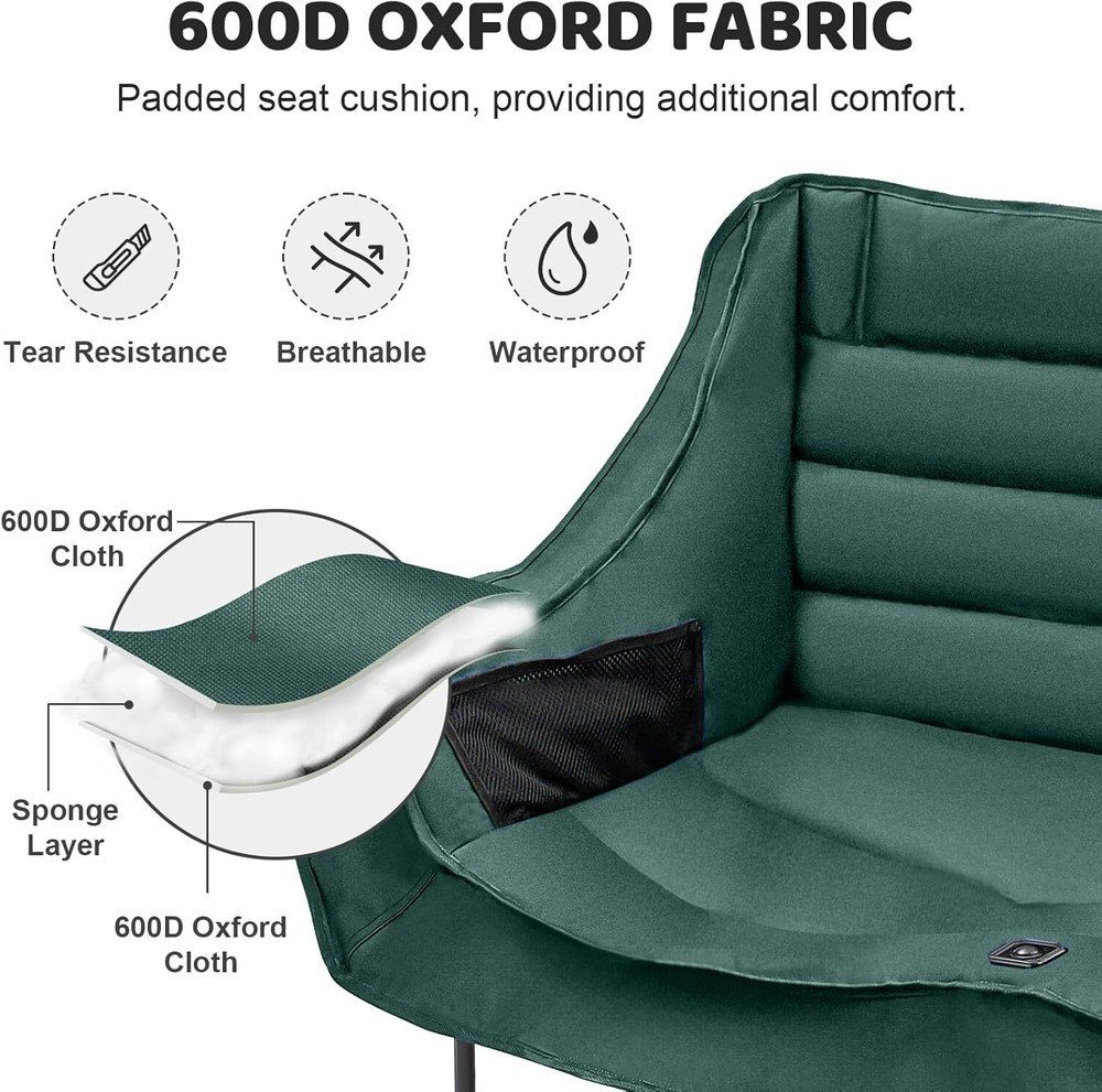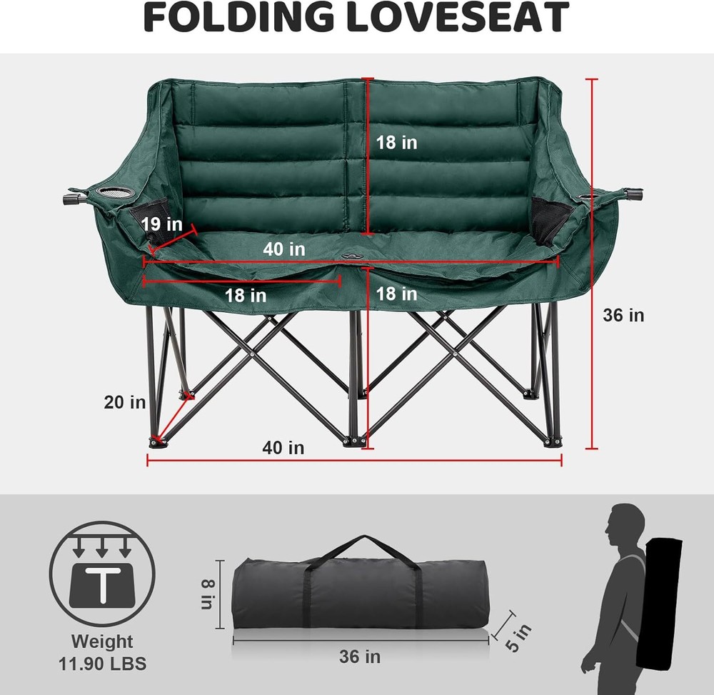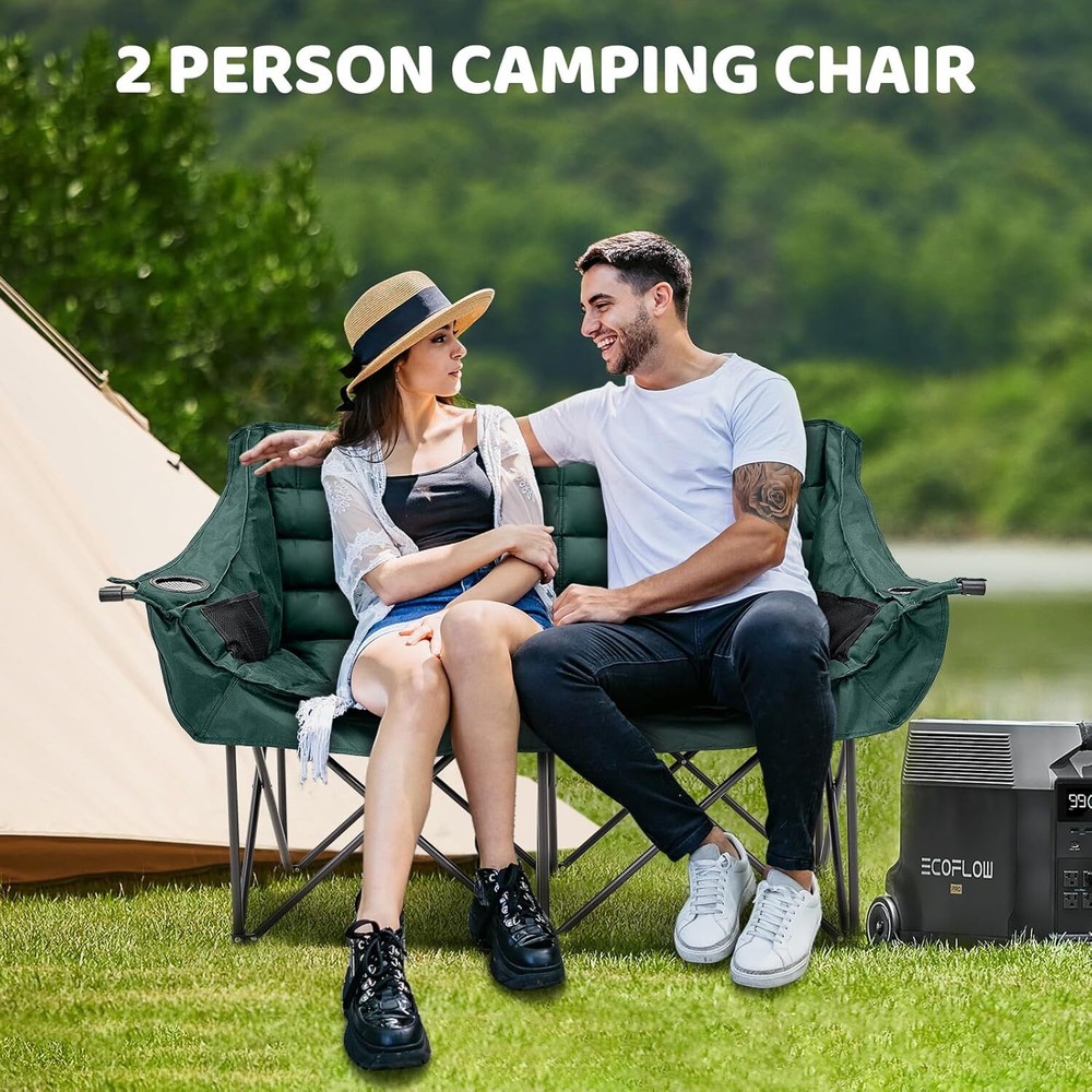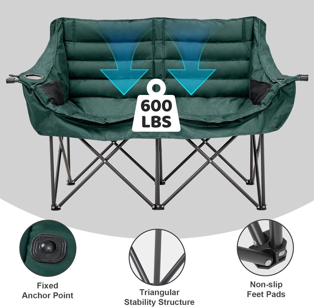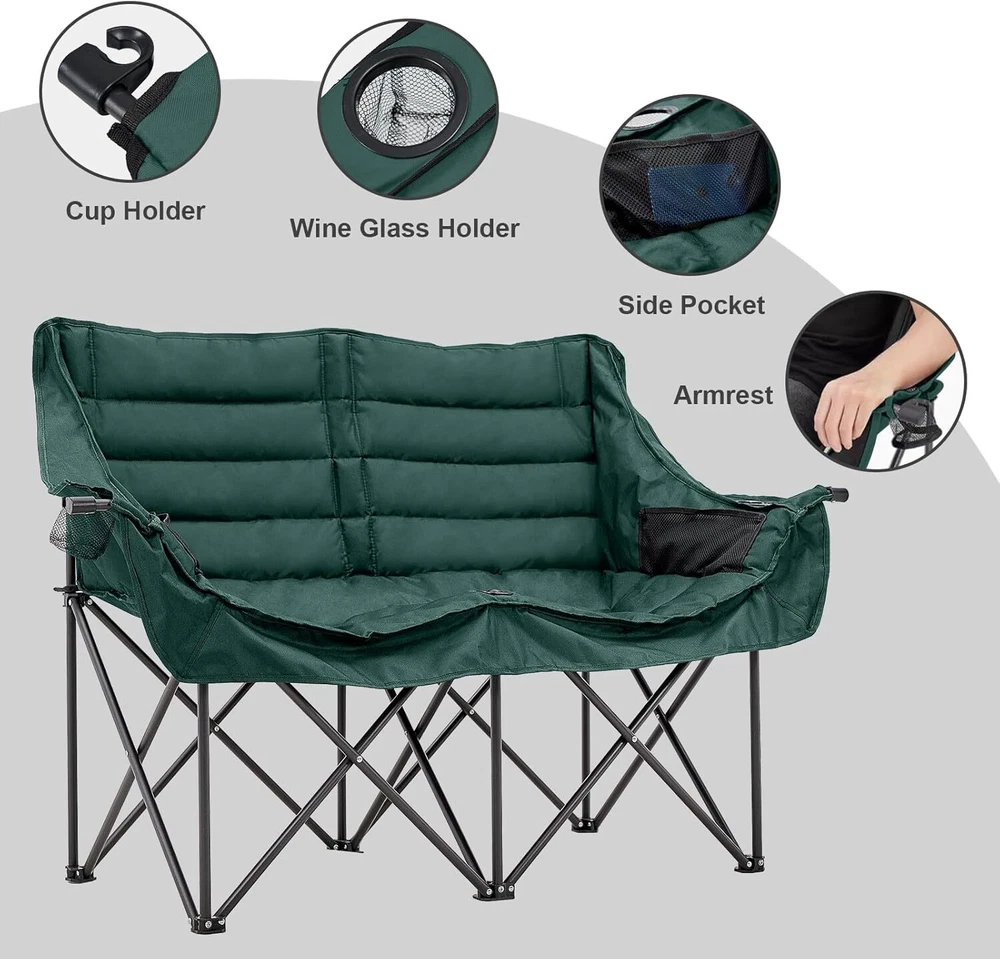 Double Camping Chair for Adults: This double camping chair comfortably seats two person, supports up to 600 Ibs with its sturdy steel frame. Padded Loveseat Camping Chair: Made from breathable 600 D double-layer oxford fabric with cotton fiber padding ensuring tear resistance and enhanced comfort Compact & Portable Design: This camp chair folds into a compact 36" x 8" bundle and fits into the included carry bag, it's easy to carry like small luggage and fits in most car trunks for your camping needs Convenient Armrests with Cup Holders: Equipped with armrests that include both cup holders and wine glass holders, this lawn chairs adds a touch of luxury to your outdoor experiencallowing you to relax with your favorite beverages close at hand Camping Essentials: This double camping chair suits a variety of outdoor aactivities, like camping, picnics, beach trips and concert