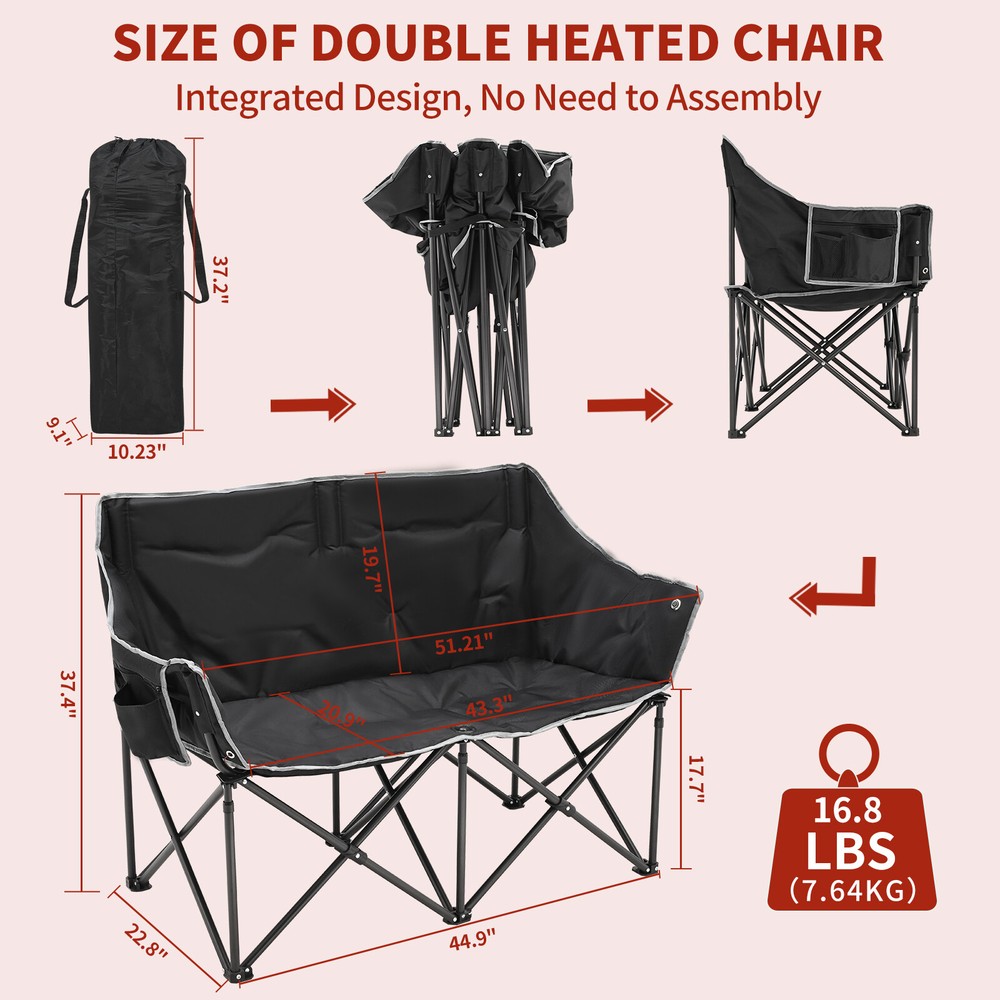 Item Height: 37.4 in Color: Black Features: Foldable, Cup Holder, Side Pockets, With 2 Packs 10000 mAh Power Bank gtin13: Does not apply Item Length: 44.9 in Type: Heated Double Camping Chair Item Weight: 16.8 lb Frame Material: Steel Item Width: 22.8 in Weight Capacity: 550 lbs Suitable For: Indoor/Outdoor, Backpacking, Hiking, Camping UPC: Does not apply Folded Dimensions: 10.23"x37.2"x9.1" Brand: H&ZT